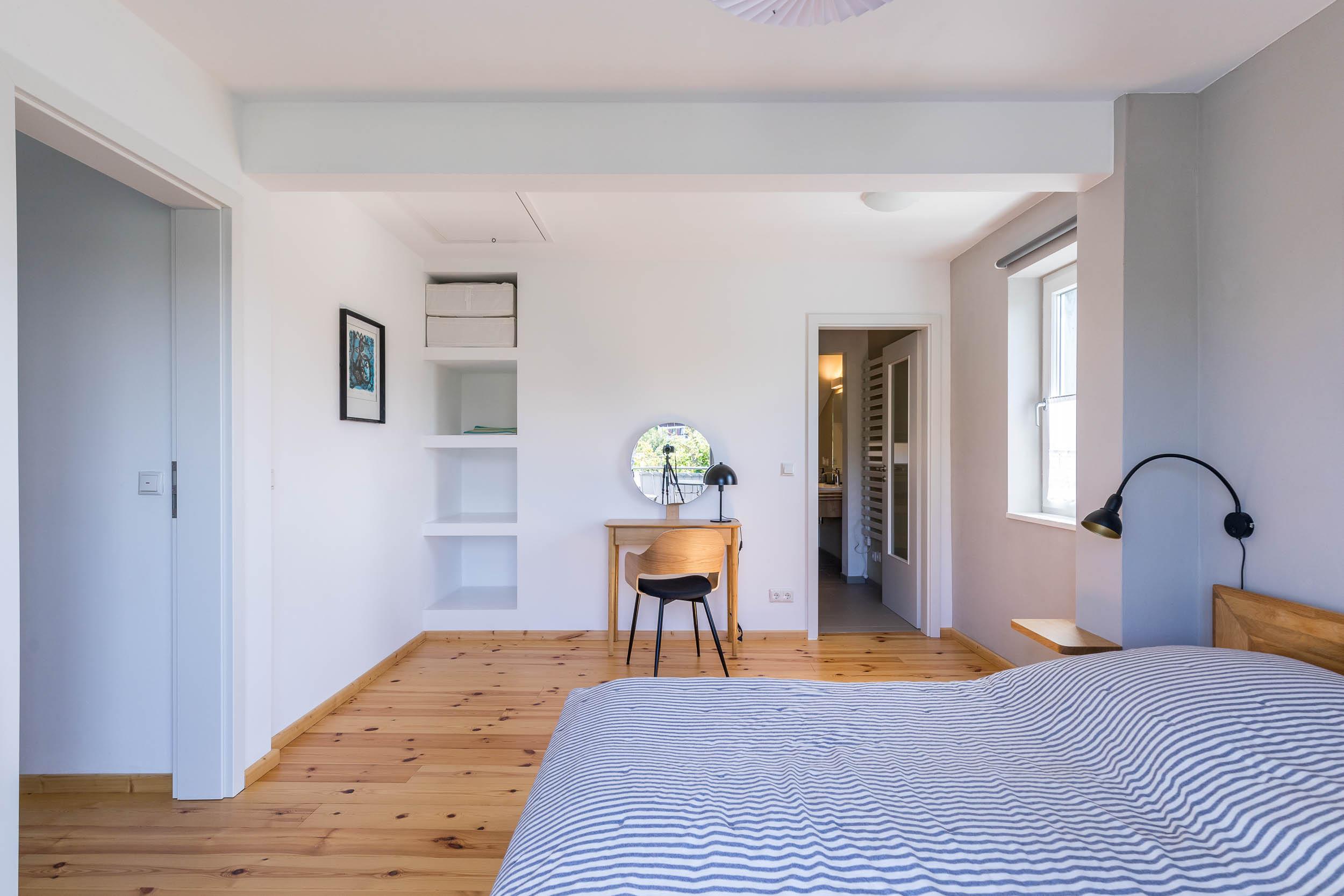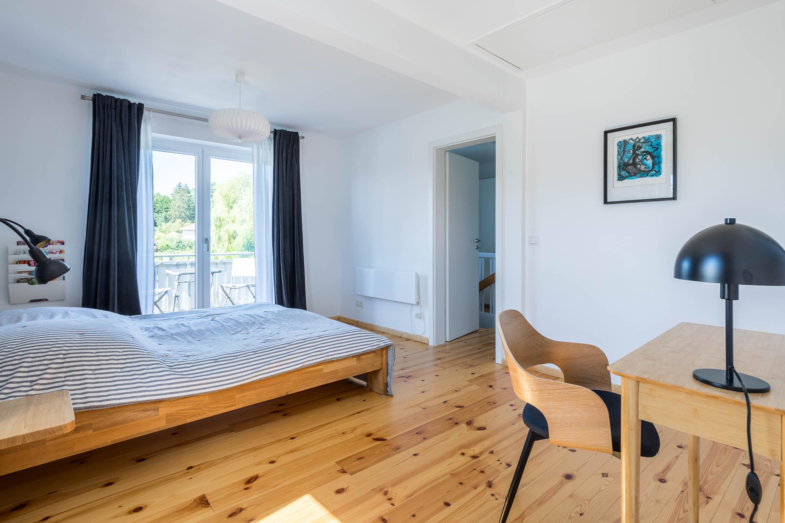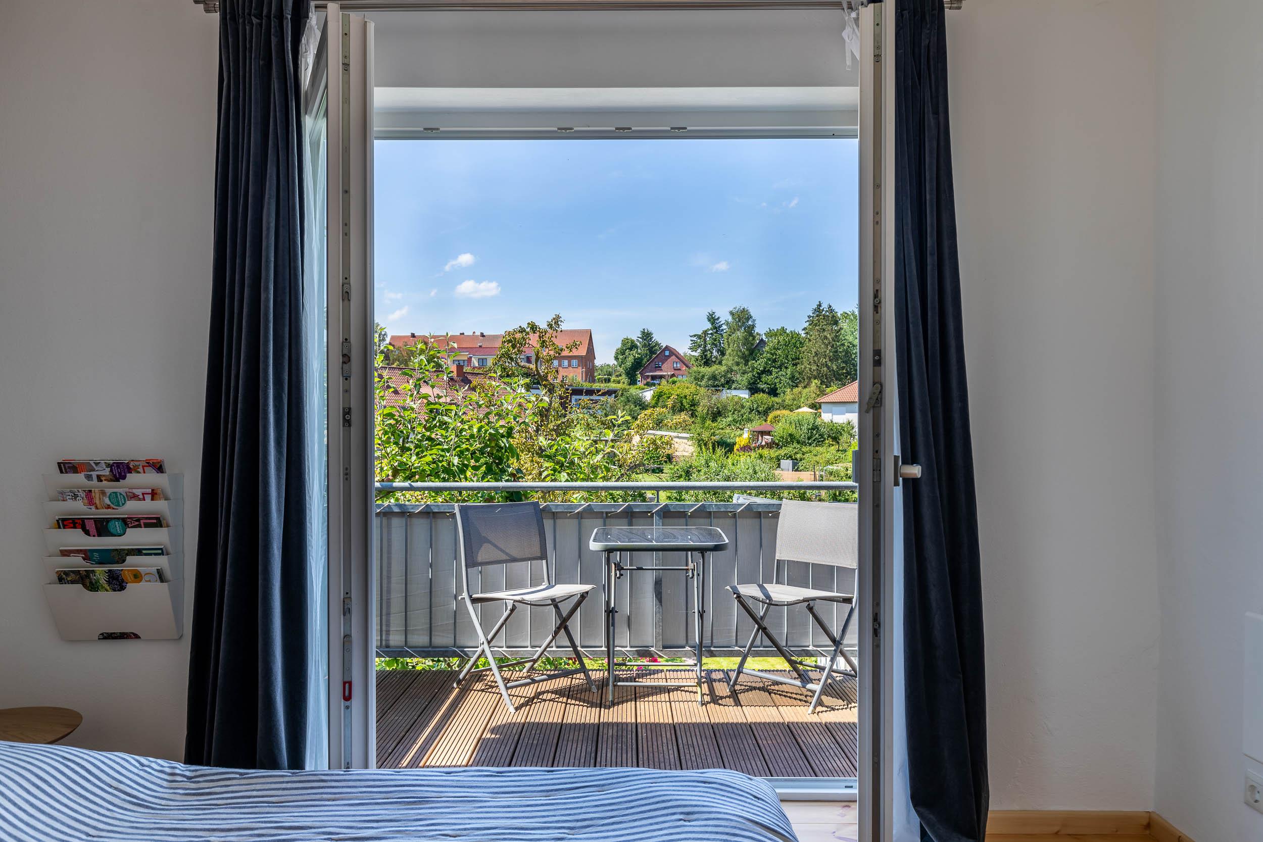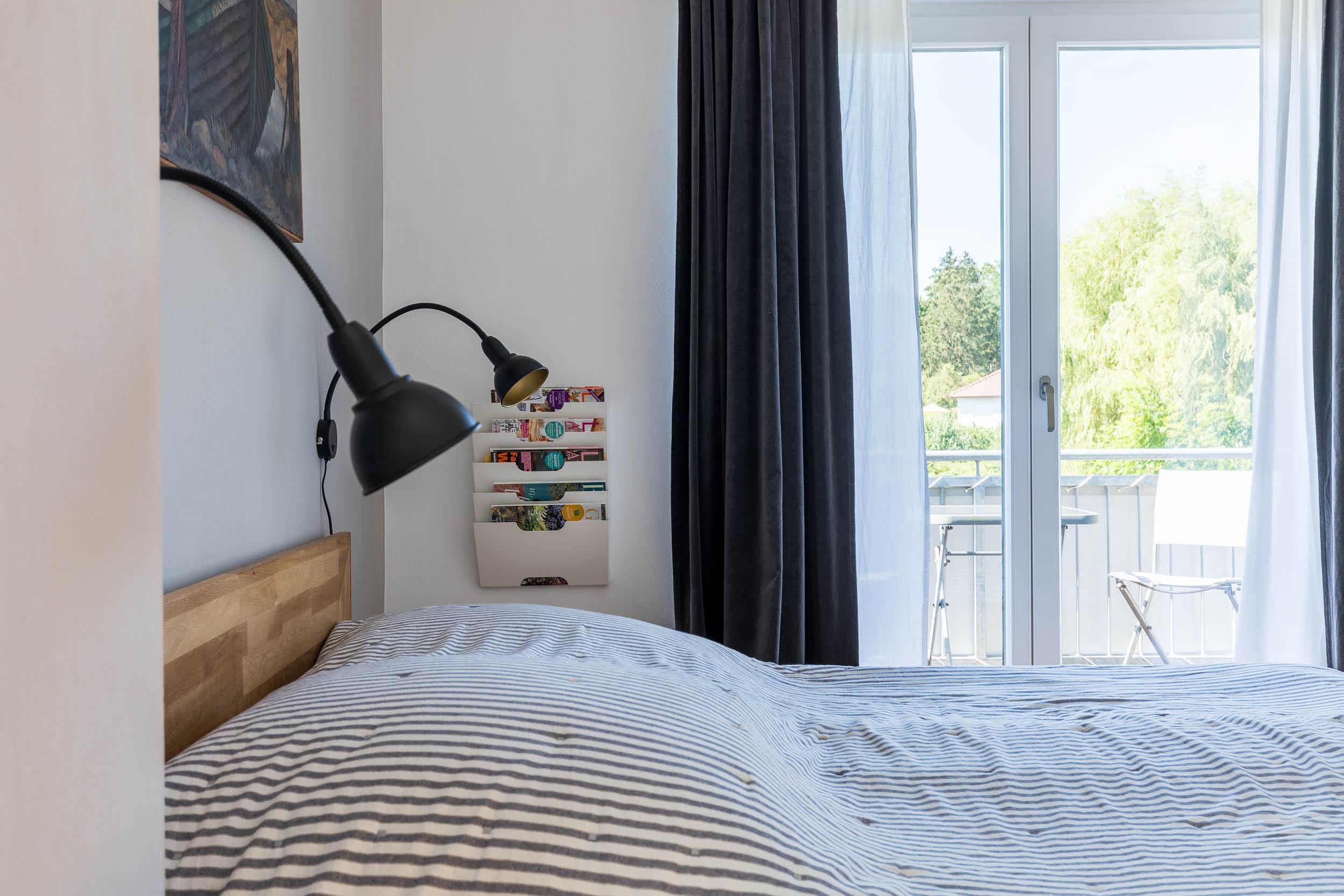 Das Hauptschlafzimmer (160 x 200 cm) bietet ein großes Einbauregal, einen kleinen Schreibtisch und einen Zugang zum großen Balkon (Südseite) mit weitem Blick ins Grüne.