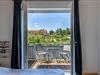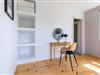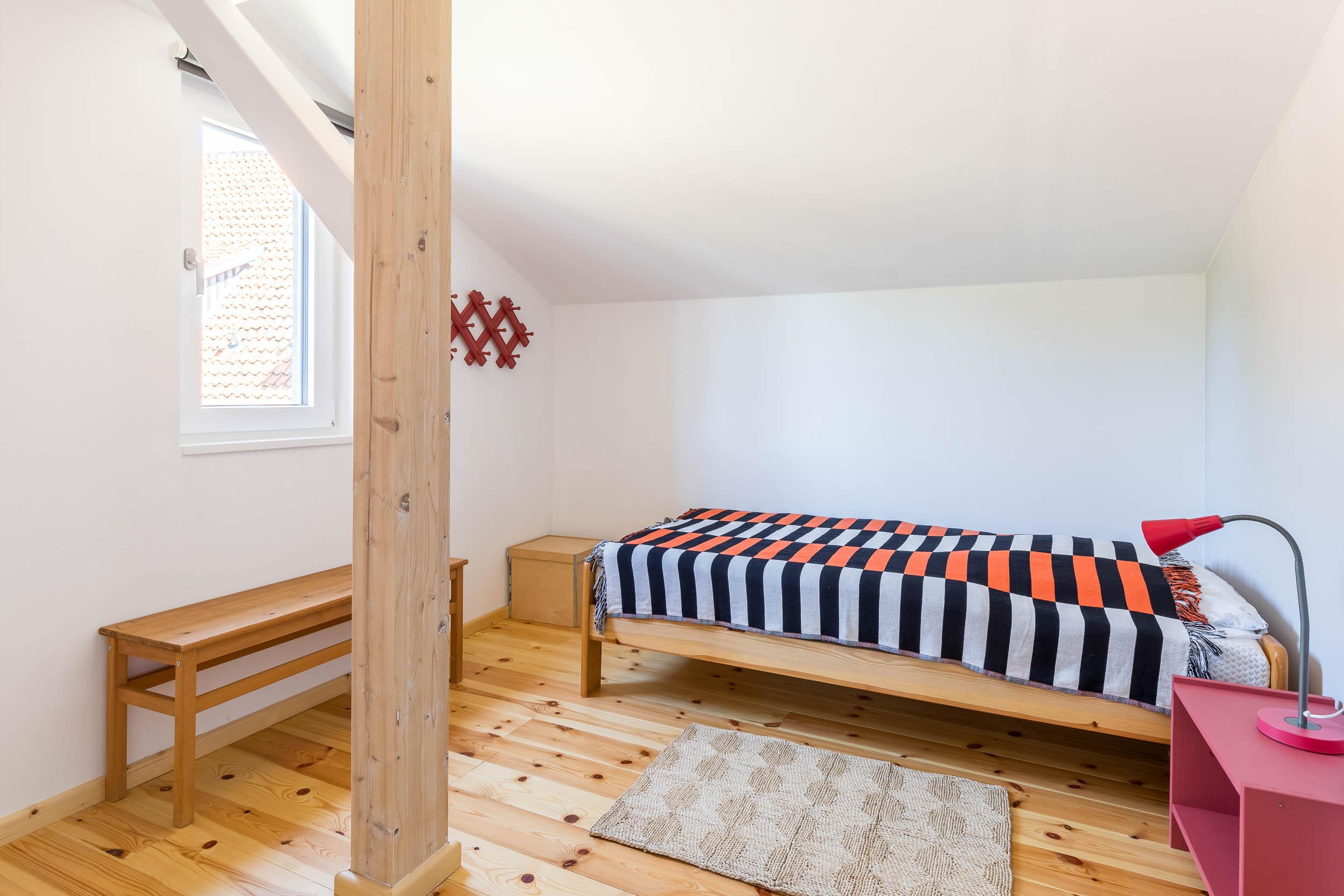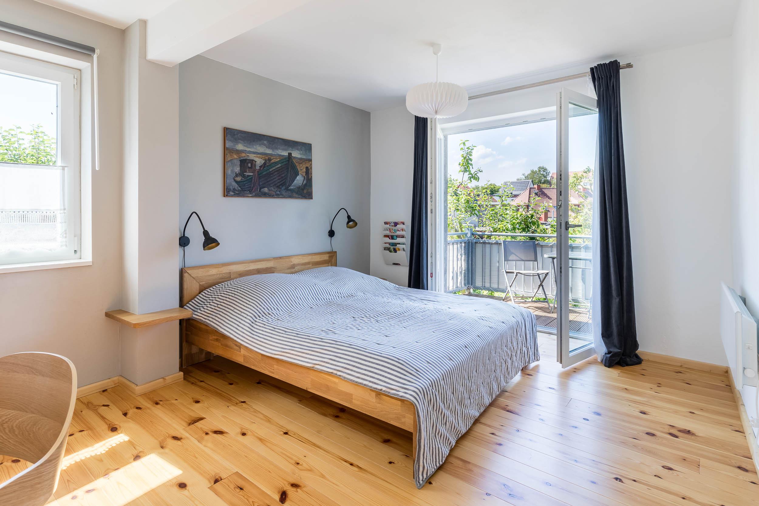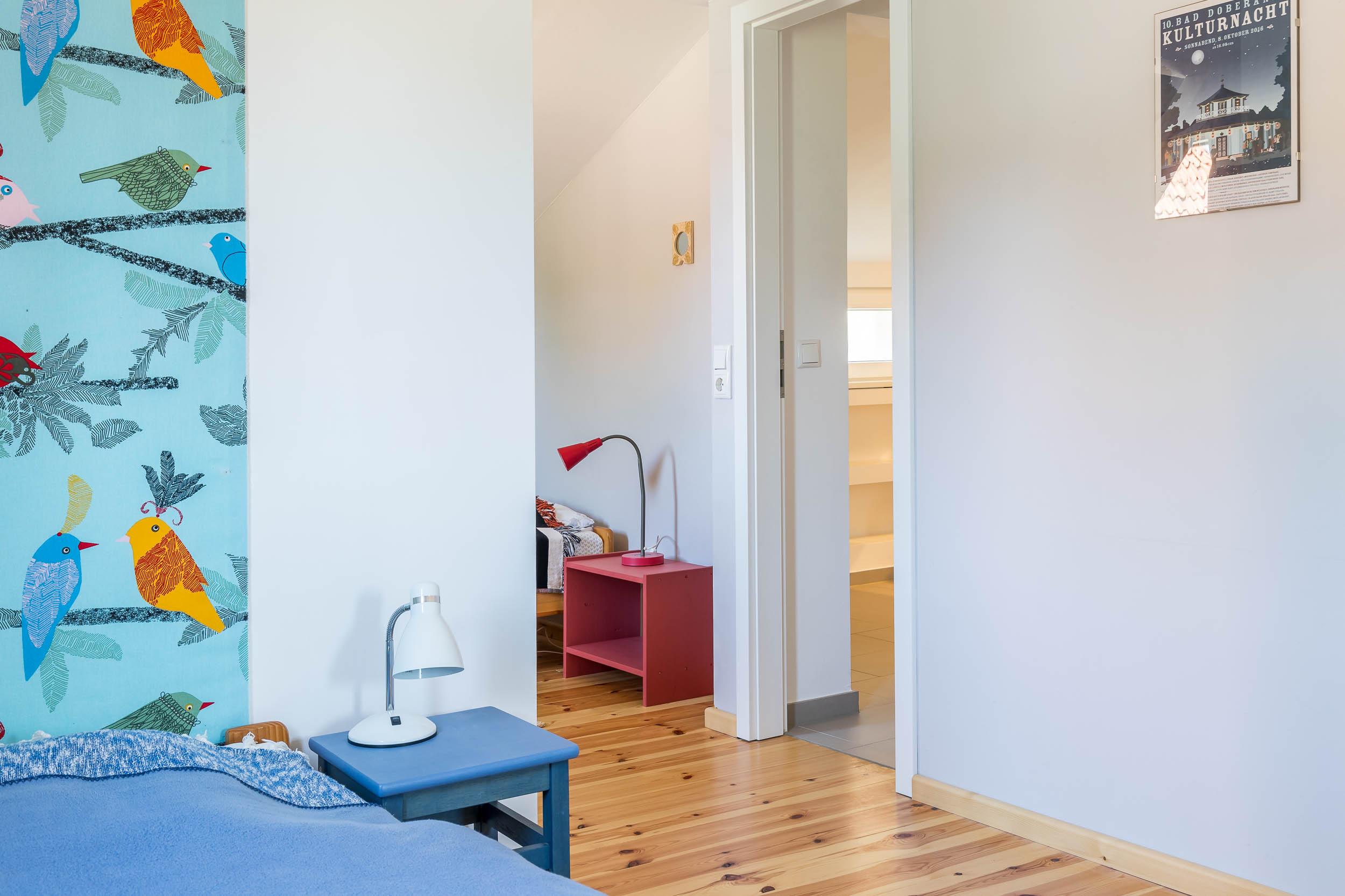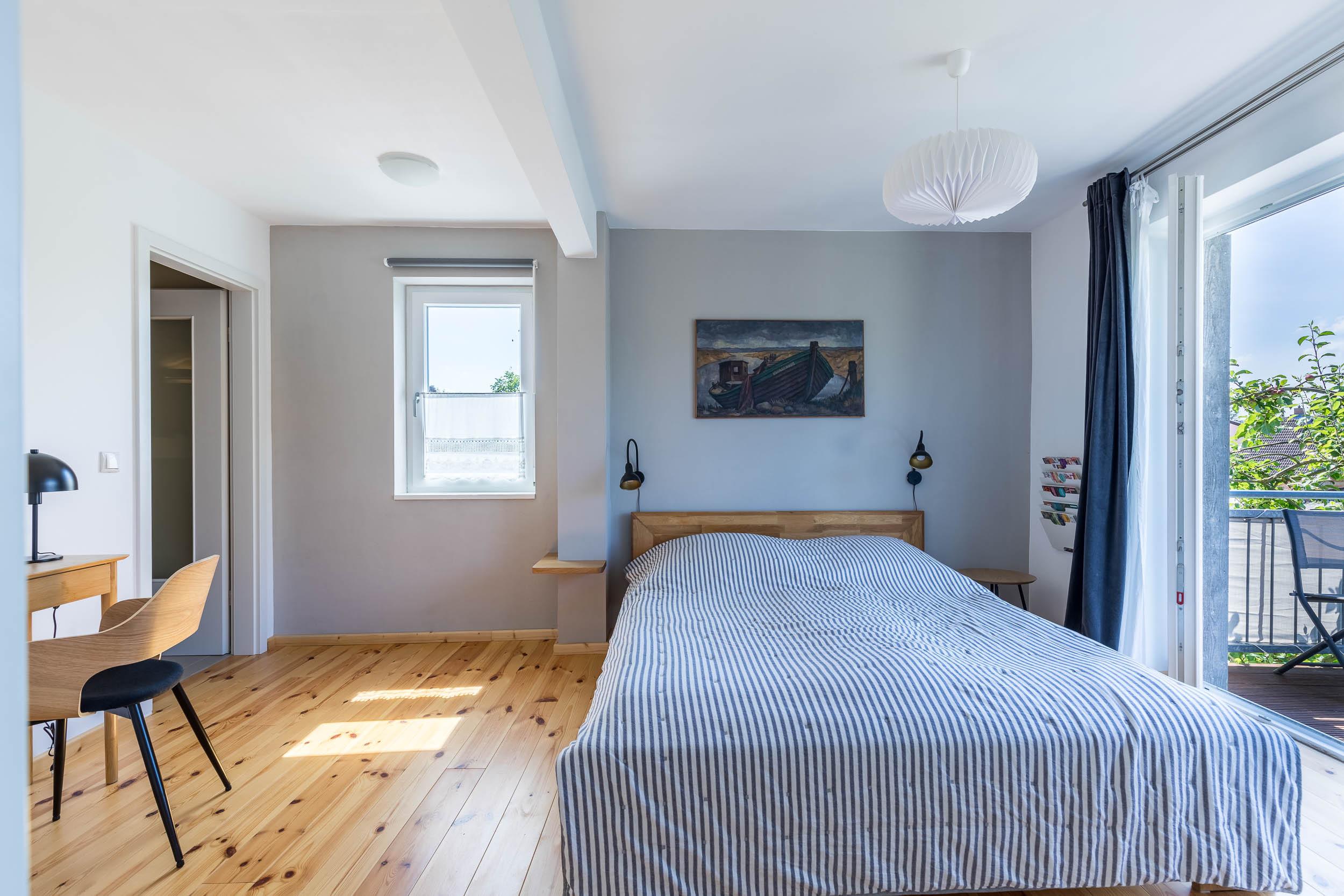 Das Hauptschlafzimmer (160 x 200 cm) bietet ein großes Einbauregal, einen kleinen Schreibtisch und einen Zugang zum großen Balkon (Südseite) mit weitem Blick ins Grüne.