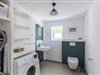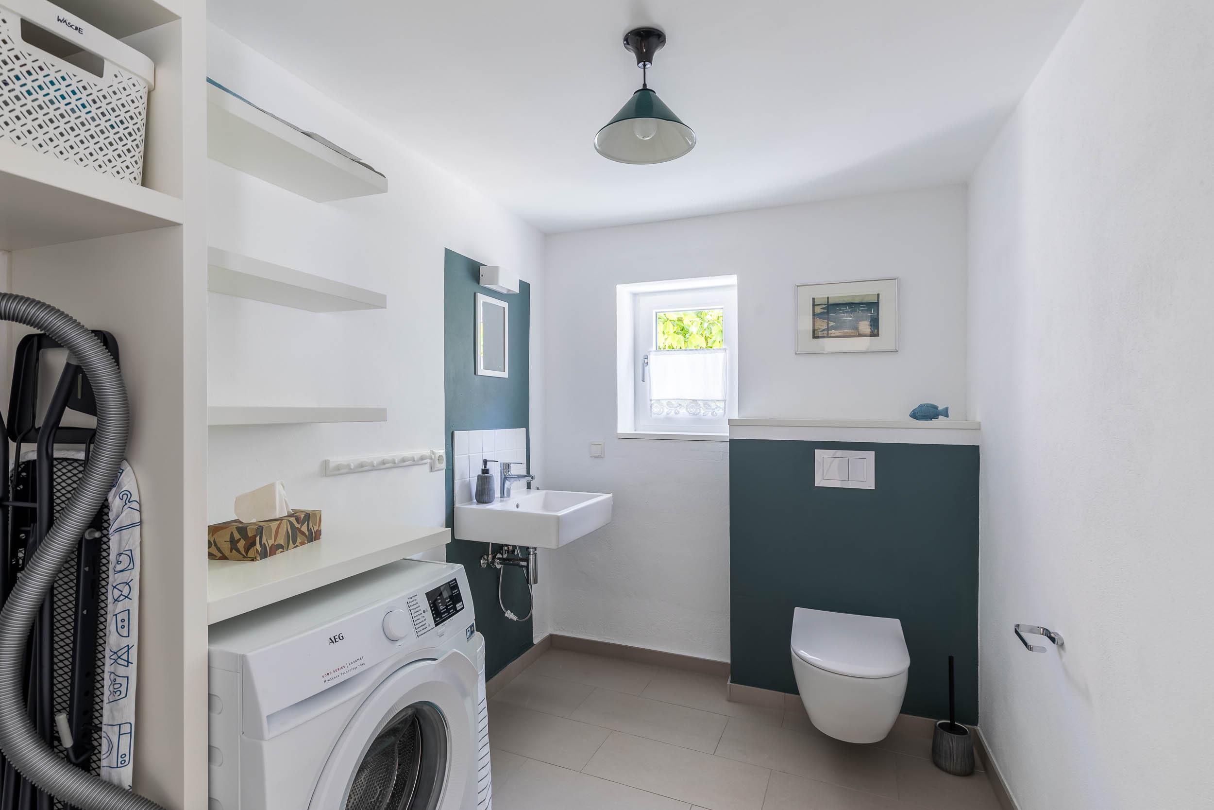 Ein Hauswirtschaftsraum bietet ein Gäste-WC, Waschmaschine und Ablagemöglichkeiten.