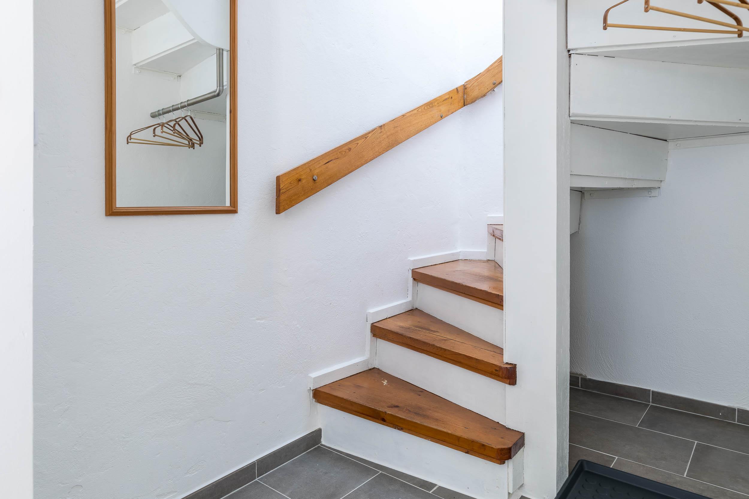 Eine Wendeltreppe führt ins Obergeschoss, in dem sich zentral ein großer Kleiderschrank befindet.