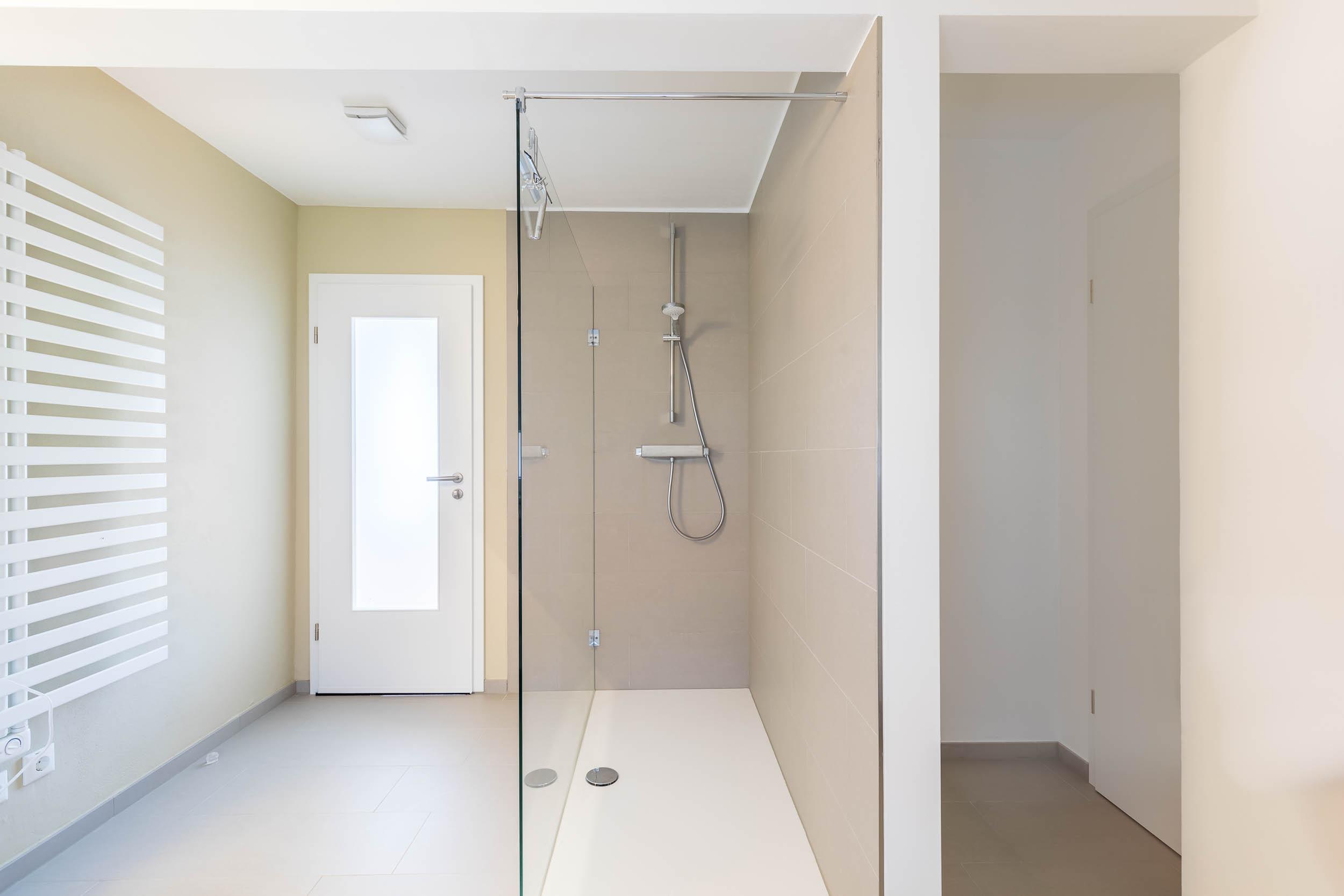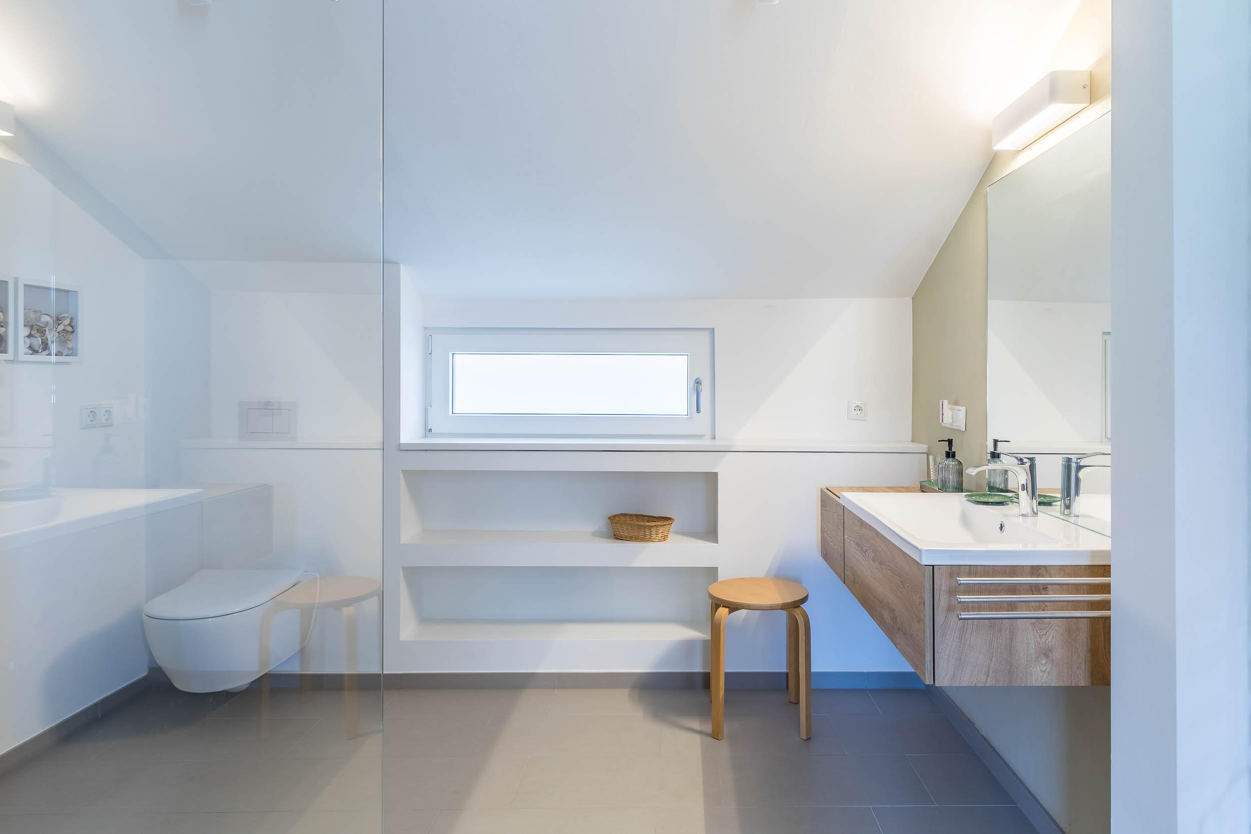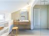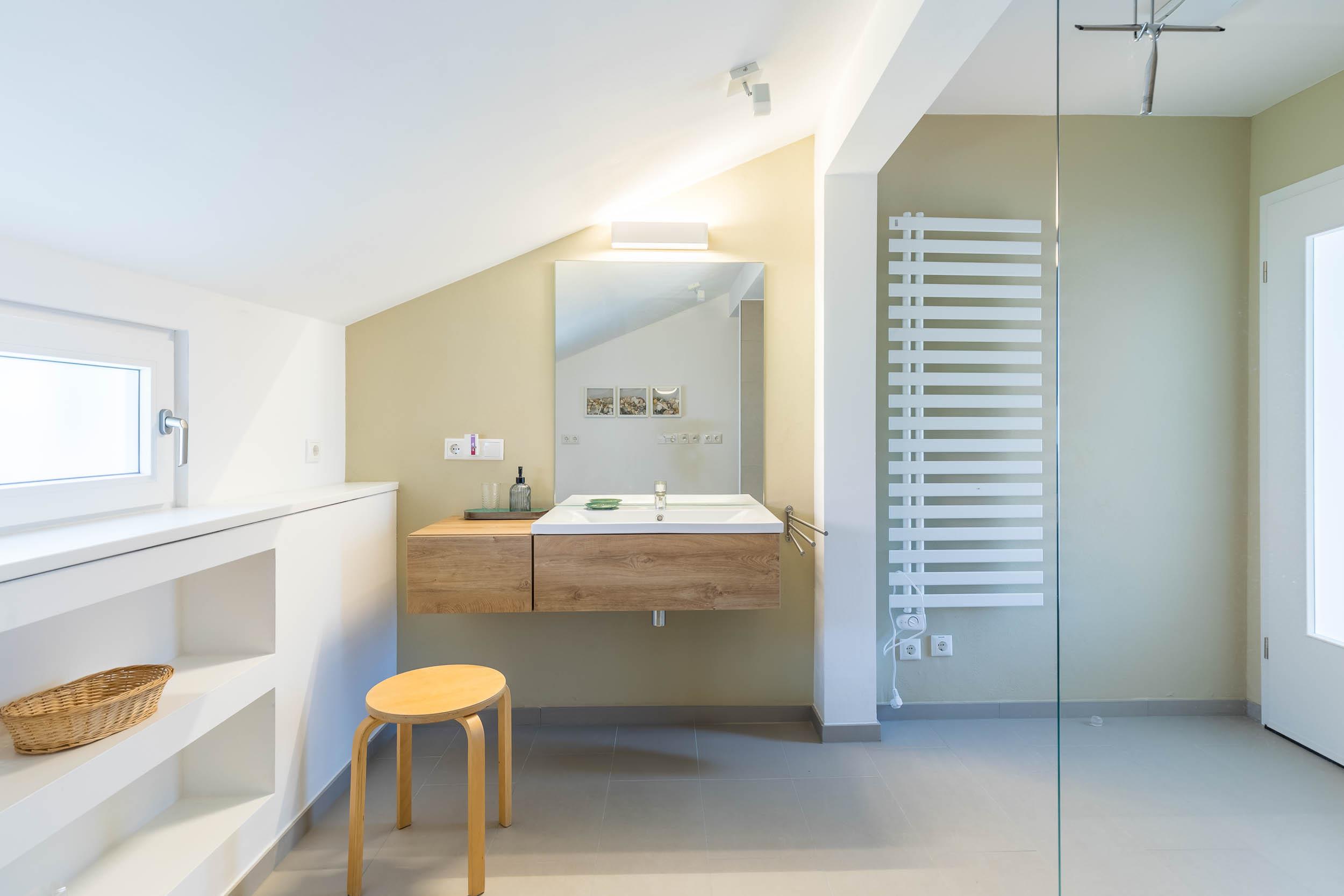 Der Schlafbereich ist in zwei Räume geteilt, die jeweils einen Zugang zu dem geräumigen, modernen Tageslicht-Bad haben. Das Bad ist mit WC, großer, ebenerdiger Dusche und reichlich Ablagemöglichkeiten ausgestattet.