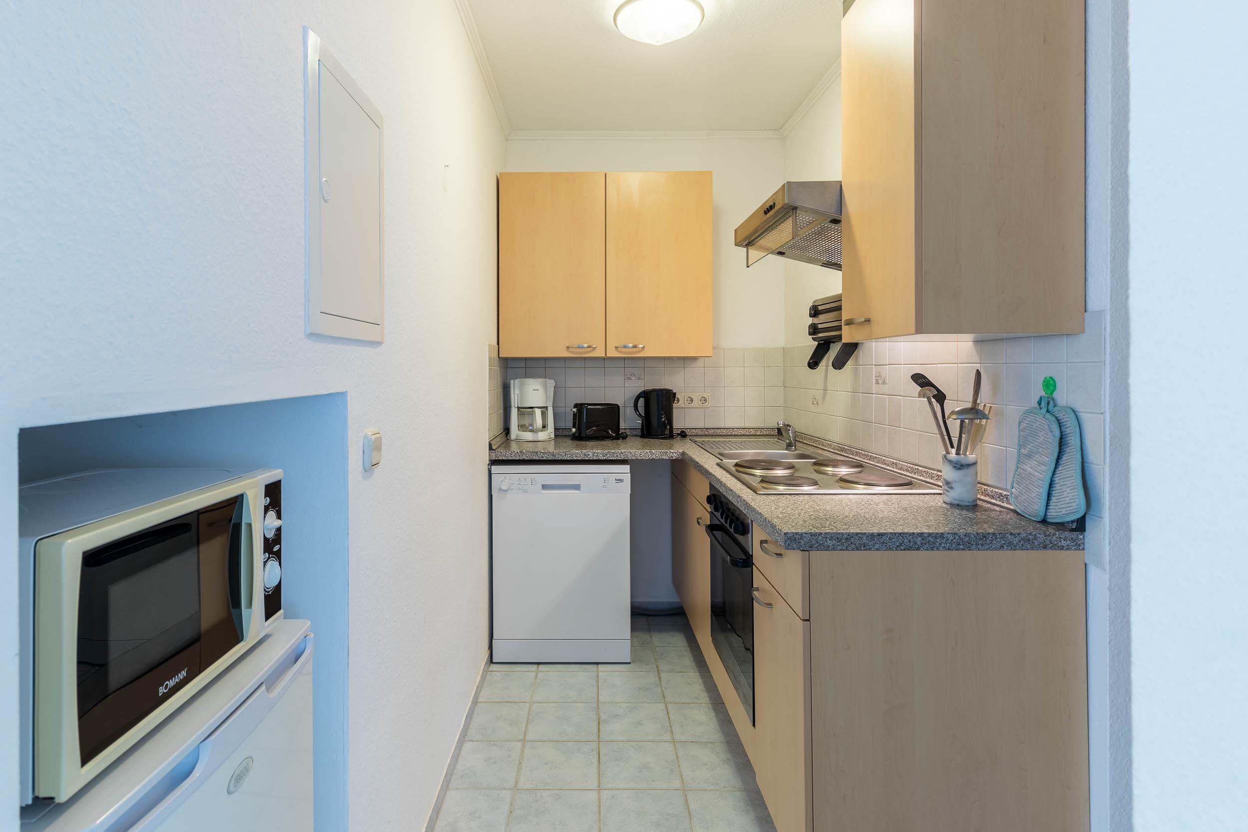 In der Küche stehen Herd, Backofen, Kühlschrank, Wasserkocher, Kaffeemaschine und Toaster zur Verfügung.