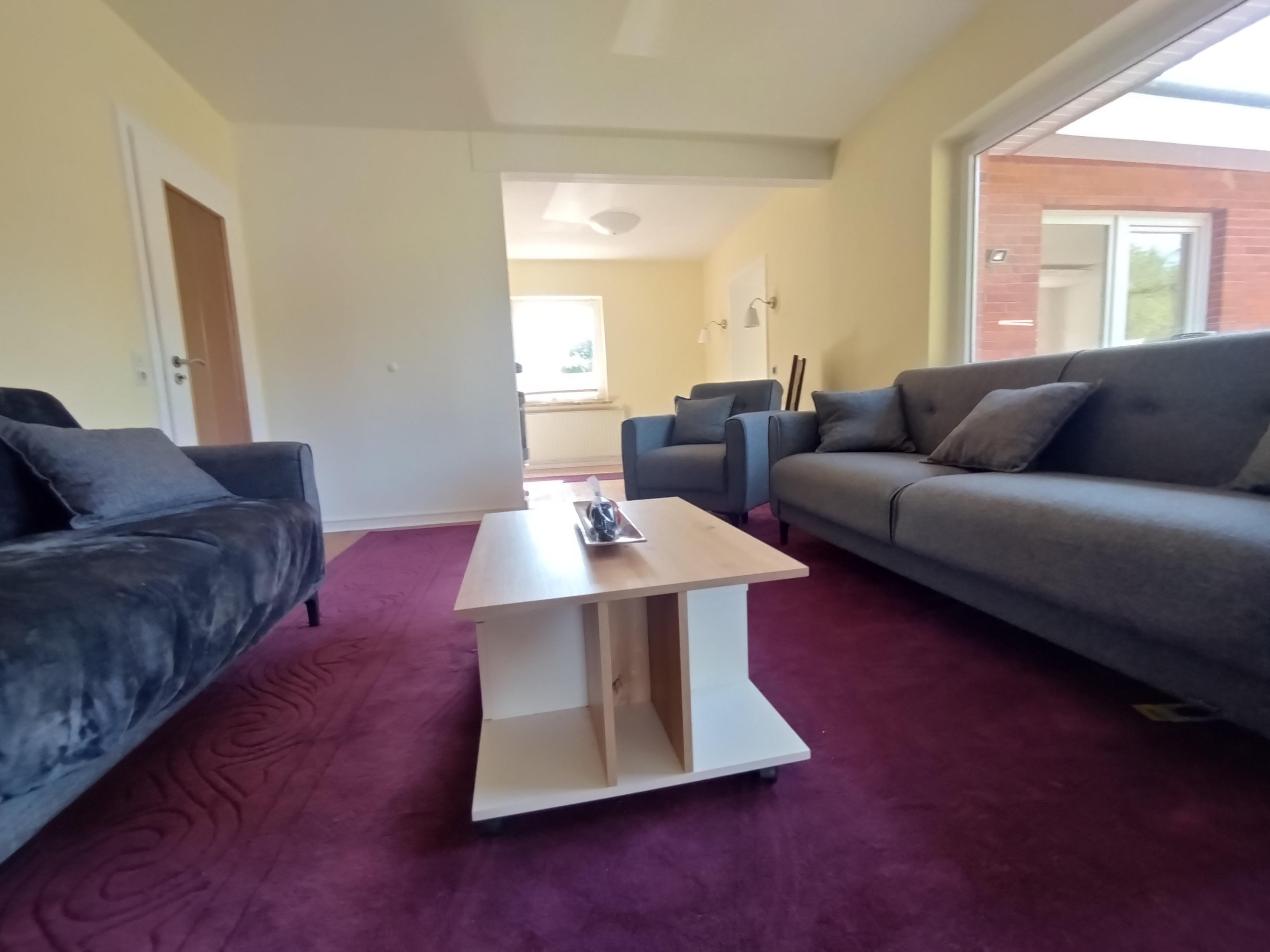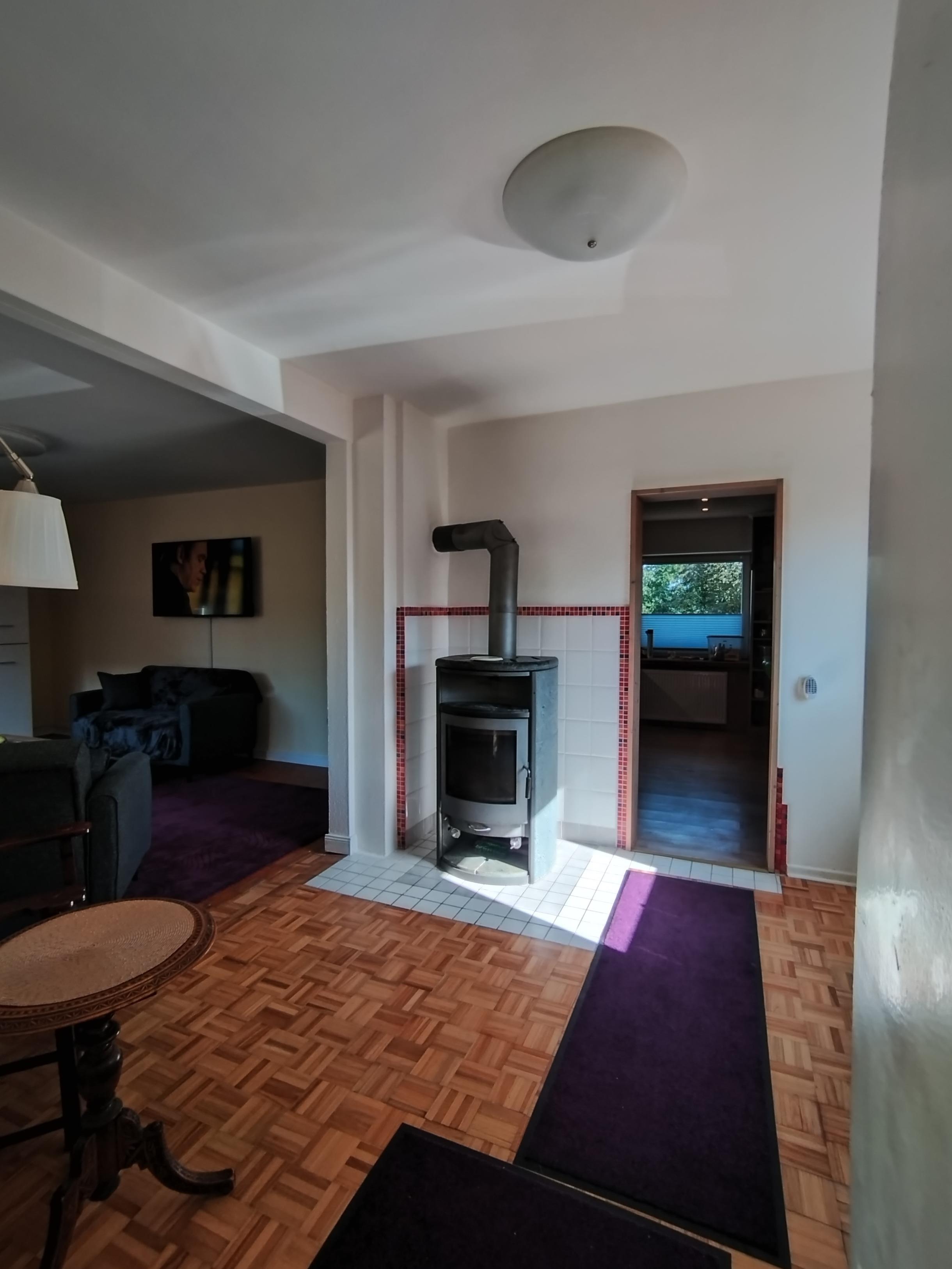 Das gemütliche Wohnzimmer verfügt über Smart-TV, Sitzgruppe mit Schlaffunktion und Kaminofen mit Glastür, der 2025 erneuert wird.