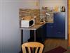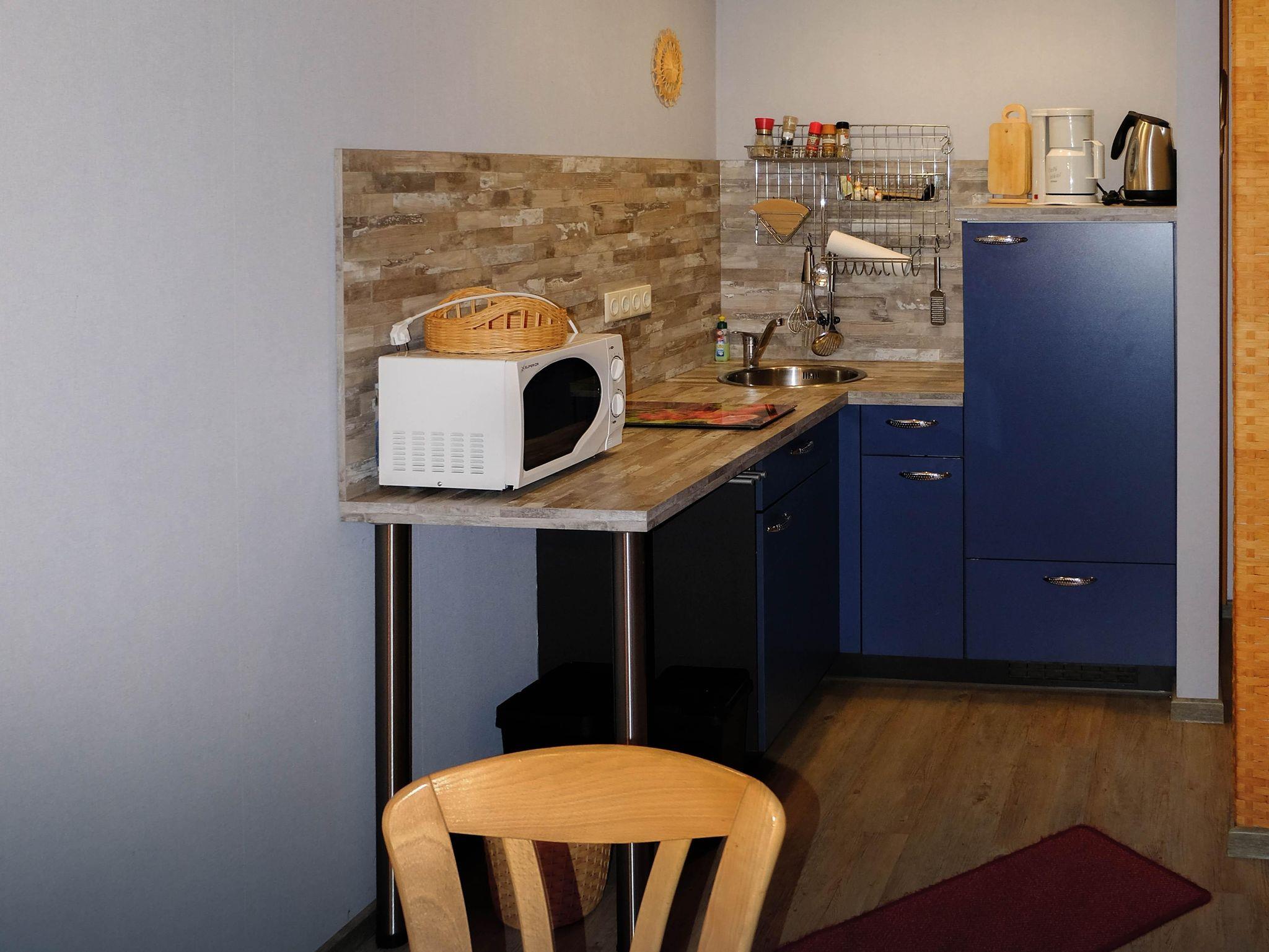Die Küchenzeile verfügt über Mikrowelle, Toaster, Kaffeemaschine, Wasserkocher, Kühlschrank mit Gefrierfach und zwei Herdplatten. Backofen und Spülmaschine sind nicht vorhanden.