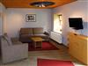 Im Wohnraum befindet sich eine kleine Küchenzeile, ein Essbereich, eine Schlafcouch und ein TV.