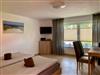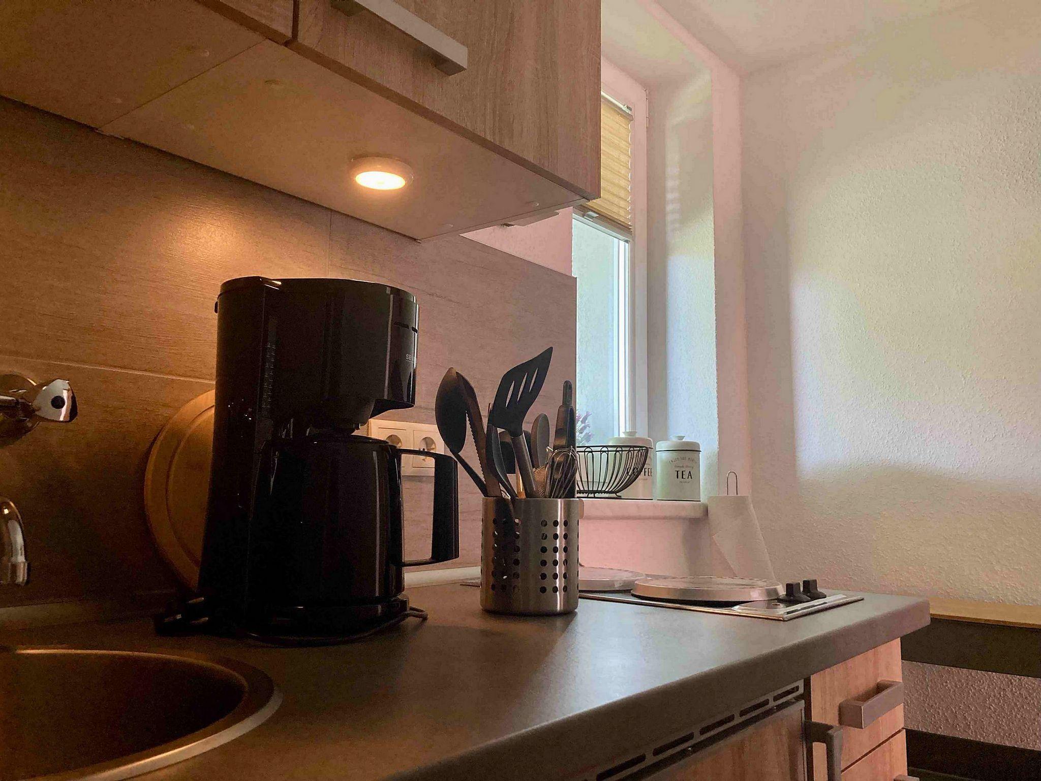 Die kleine, aber feine Küche ist ausgestattet mit einem Kühlschrank, einer Abwäsche und 2 Kochplatten. Einen Wasserkocher, eine Kaffeemaschine und einen Toaster finden sie ebenfalls vor. Ein Backofen ist nicht vorhanden. Auf Nachfrage wird Ihnen gerne ein Grill zur Verfügung gestellt. Das Bad verfügt über eine geräumige Dusche, eine Toilette und ein Waschbecken.