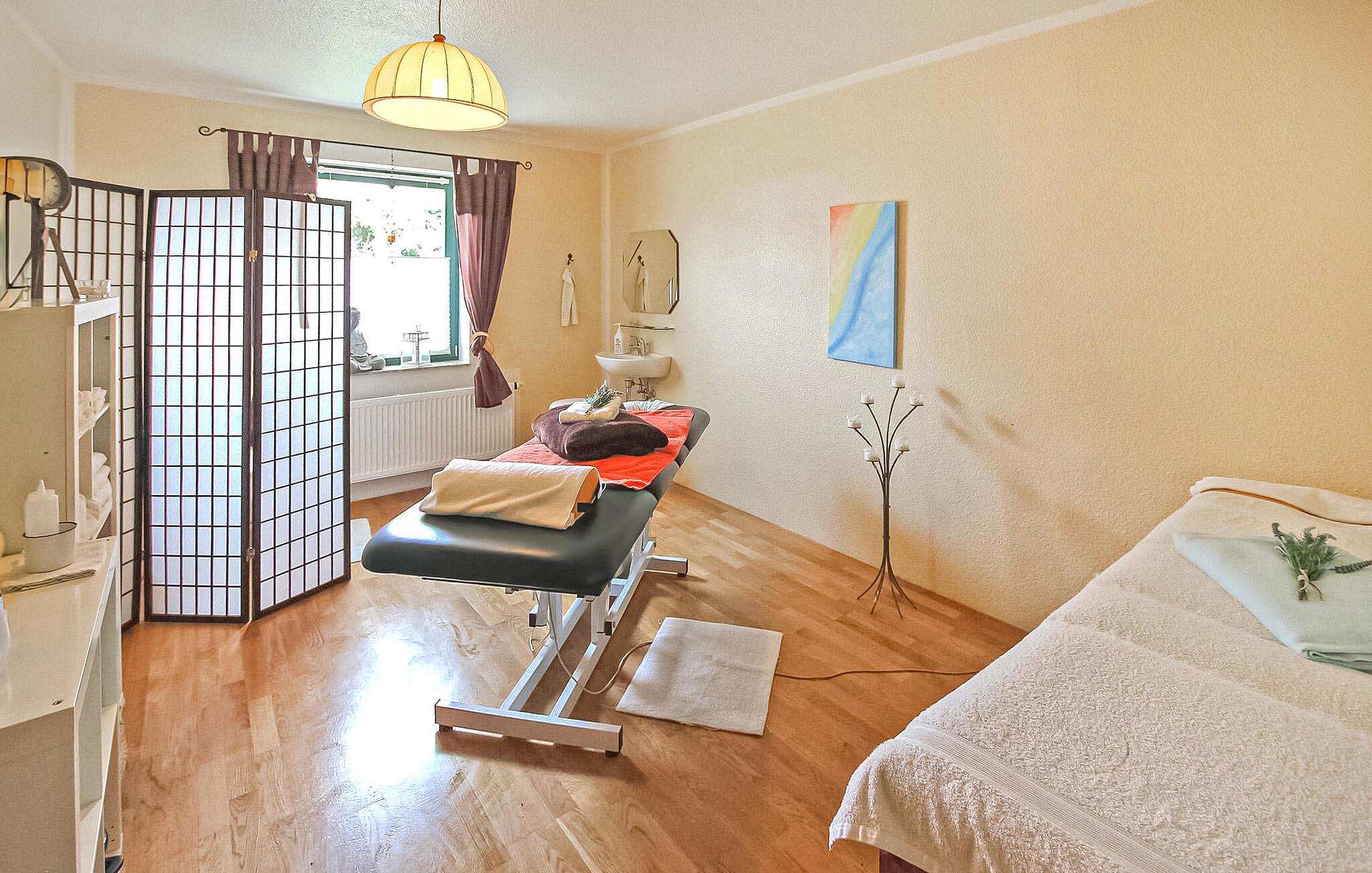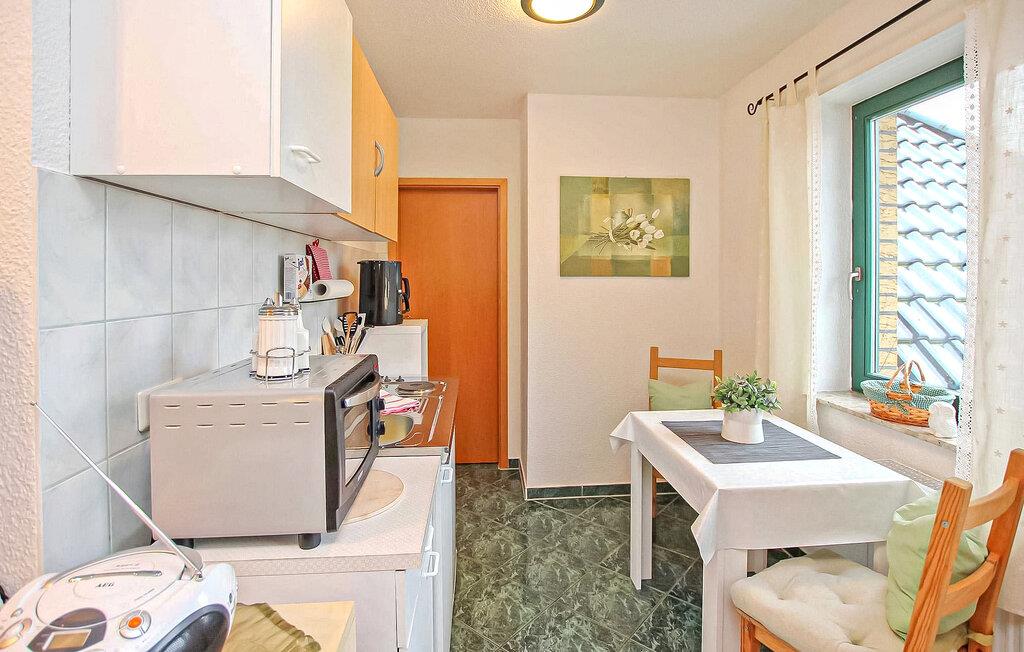 Ruhig innerhalb einer kleinen Wohnsiedlung gelegen, befindet sich in der oberen Etage eines Wohn- und Geschäftshauses die 2019 renovierte Ferienwohnung für zwei Personen. Bis zum schönen Badestrand an der Müritz sind es ca. 500 m, Waren (Müritz) als touristisches Zentrum ist ca. 5 km und das Ferienresort Fleesensee mit Golfplatz und SPA etwa 8 km entfernt. (Schöne Radtour durch den Wald.) Im Haus stehen den Gästen Wellness-Angebote gegen Gebühr (Salzgrotte, ermäßigter Eintritt, Massagen), ein Café und ein kleiner Shop mit regionalen Produkten zur Verfügung. Die ca. 32 qm große, zentral beheizte Nichtraucher-Wohnung ist über einen gemeinsamen Flur erreichbar und ist mit einem kombinierten Wohn-Schlafraum inkl. Küchenzeile (Doppelbett, Couch, Flachbild-TV, Radio/CD, Esstisch, E-Platten, Kühlschrank, Mini-Backofen), einem Bad (Dusche, WC, Fön) sowie mit Insektenschutz an den Fenstern ausgestattet. Weiterhin stehen ein Parkplatz, eine kleine Sitzecke vor dem Haus, Grill, Fahrrad-Unterstellmöglichkeiten und kostenloses W-LAN zur Verfügung.Im Gesamtpreis sind Endreinigung, Bettwäsche, Handtücher, Wasser und Energiekosten enthalten. Vor Ort zu zahlen: Kurtaxe, Wellness-Angebote (Vorteilspreis für Salzgrotte). Haustiere sind in diesem Objekt nicht erlaubt.