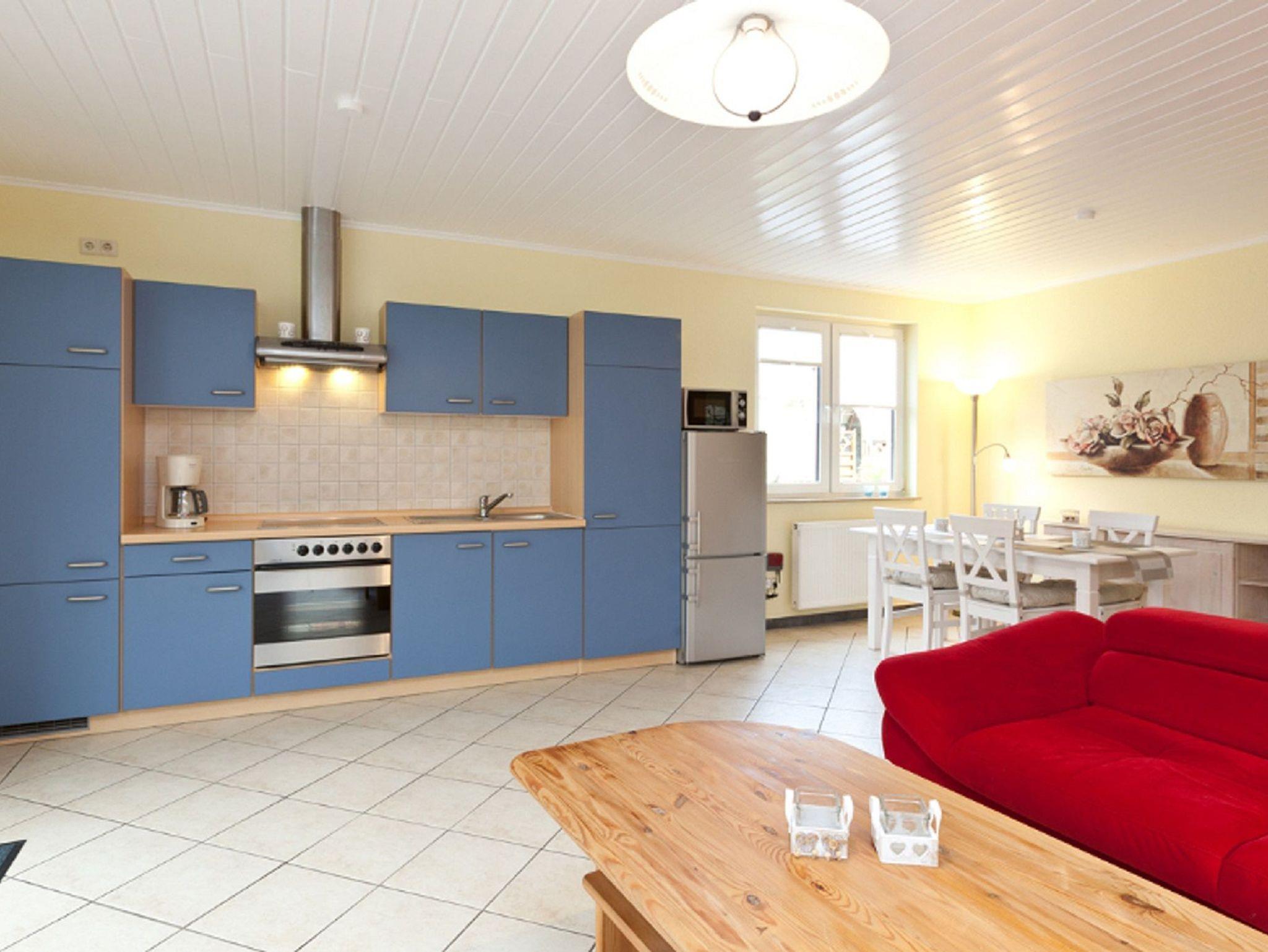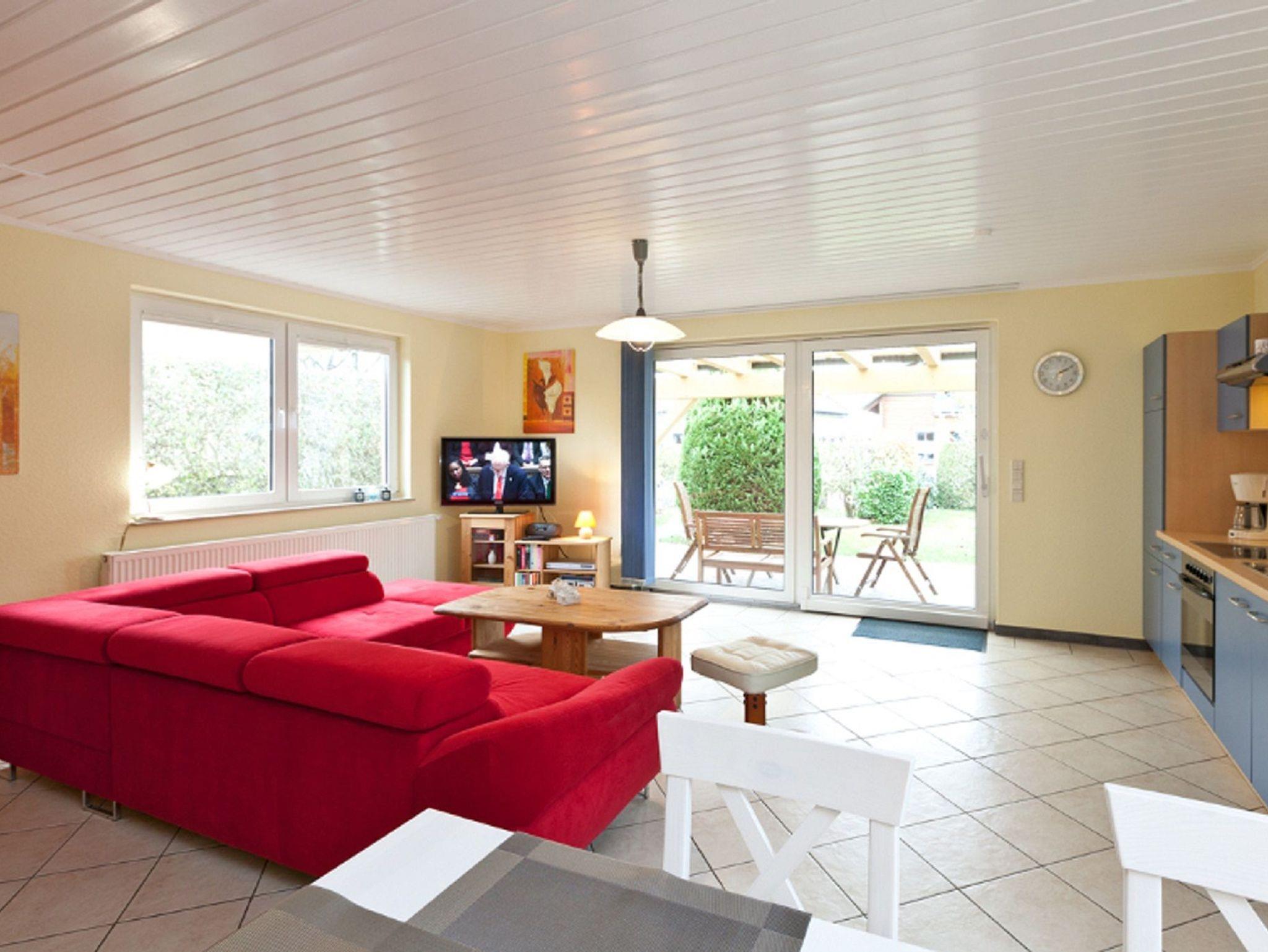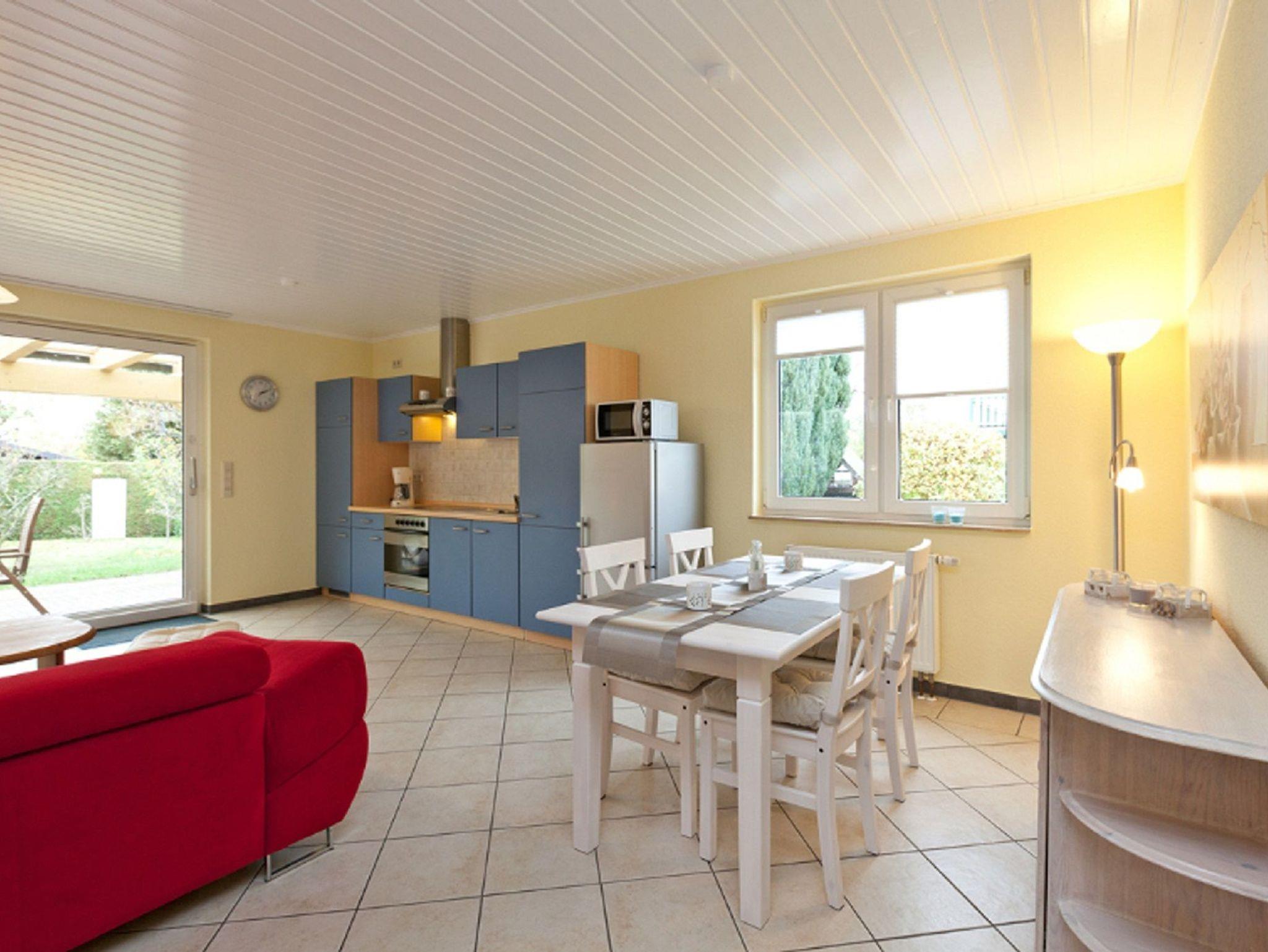 Das Ferienhaus verfügt über WLAN, einen Wohnungsvorflur mit Garderobe, einen Küchenbereich mit Herd, Backofen, Kühlschrank - komplett ausgestattet, Essplatz sowie einen großzügigen, hellen Wohnbereich mit Schlafsofa.