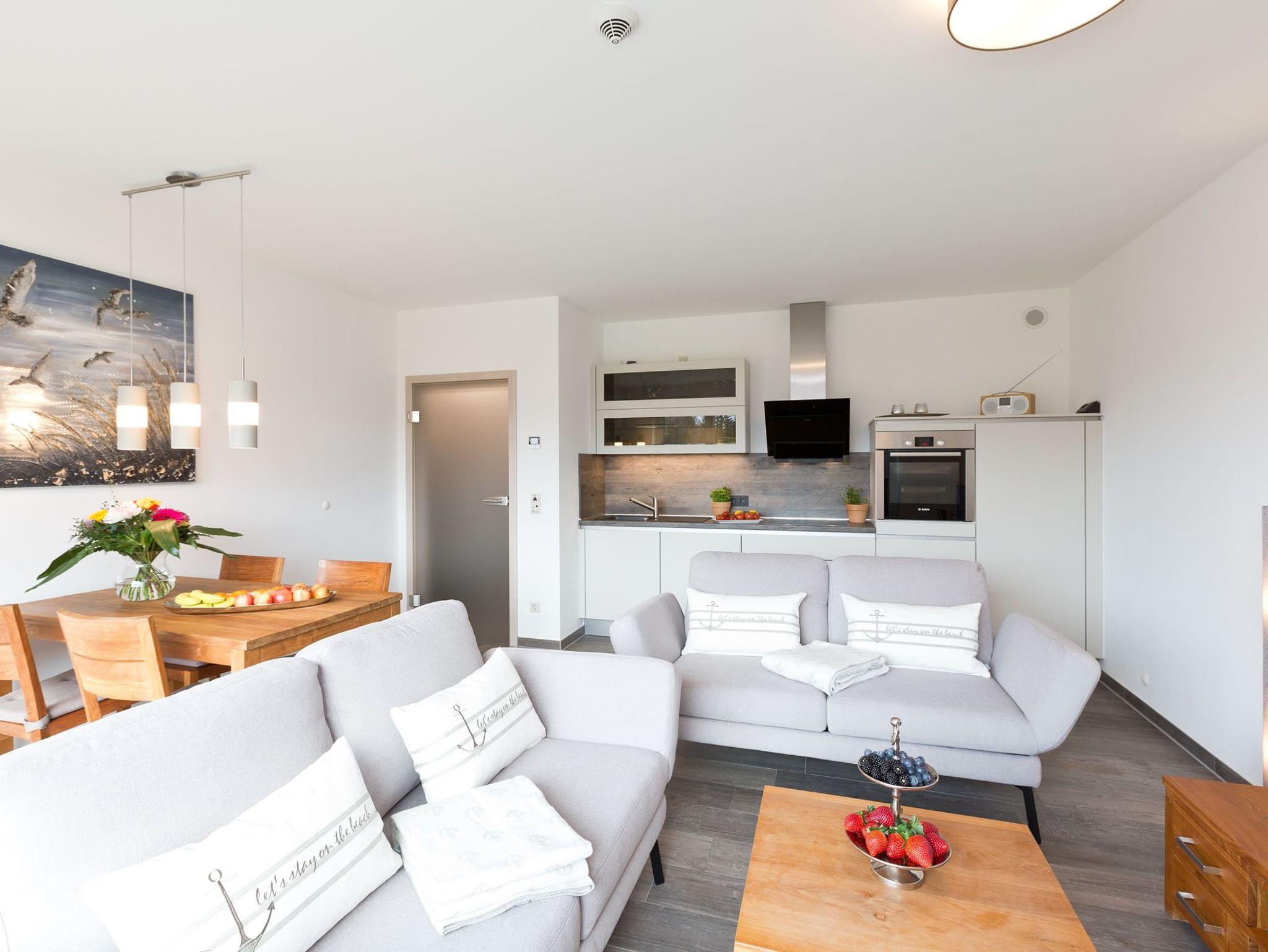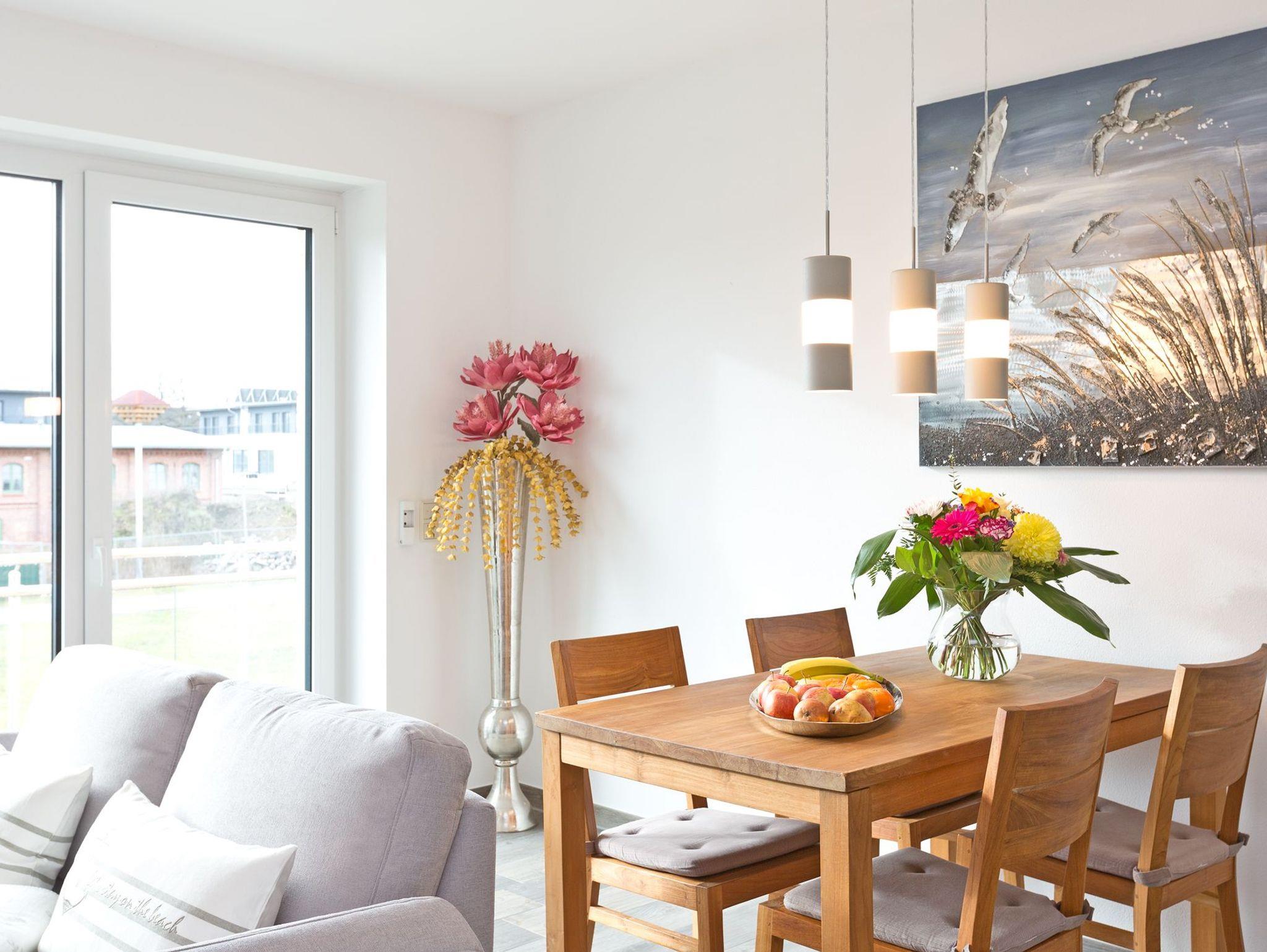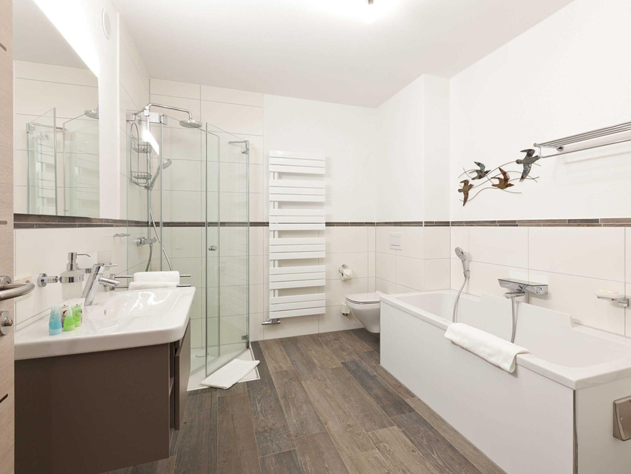 Ein extra großes Wohn-/Esszimmer mit offener Küchenzeile, ein großes und ein kleines Schlafzimmer, ein Badezimmer mit großer Wanne und extra Dusche, ein kleiner Abstellraum und ein 10 m² großer Balkon / eine 10 m² große Terrasse: Das ist unser „Mittelmeer“ mit seitlichem Müritzblick, das Appartement für die Familie oder für zwei befreundete Paare. Bei Anreise sind die Betten bereits bezogen und ein Handtuchpaket (3 Handtücher, 1 Bademantel) liegt für jeden Gast bereit. Nach 7 Übernachtungen werden Handtücher und Bettwäsche kostenlos gewechselt.