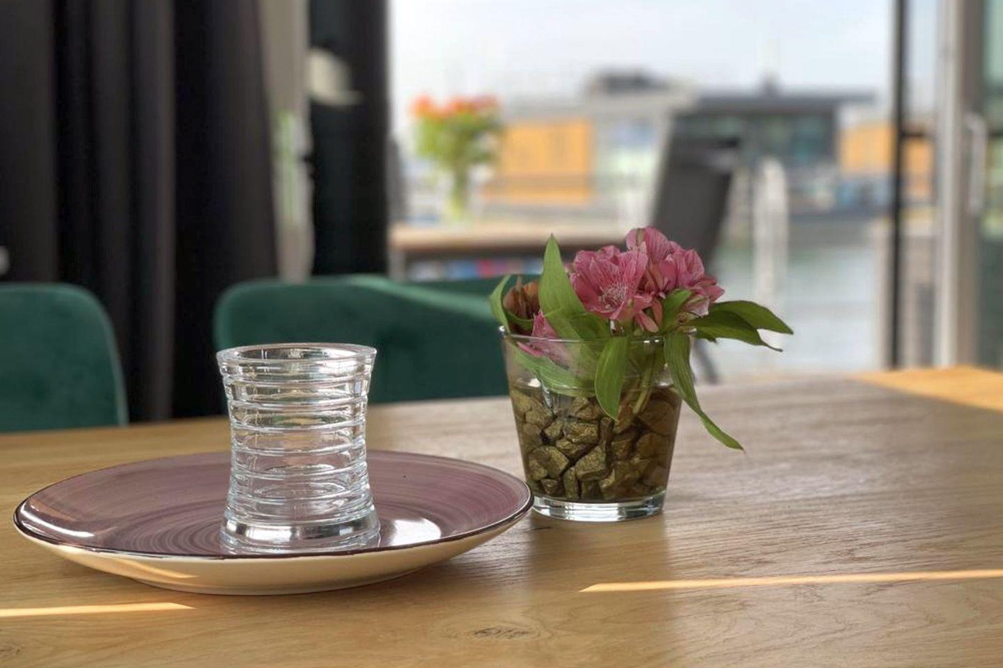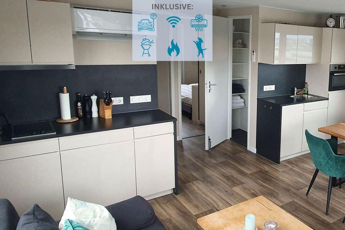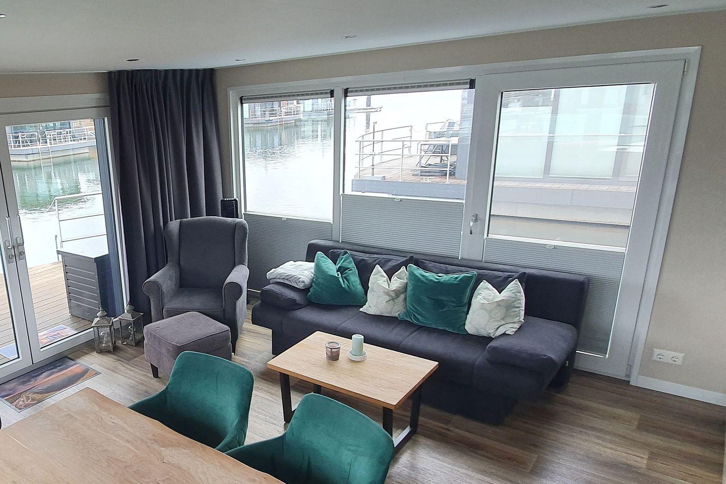 Die moderne Wohnküche ist vollständig ausgestattet und macht das gemeinsame Kochen zum Genuss: Kühlschrank, Ceranfeld, Geschirrspüler, Backofen mit Mikrowellenfunktion, Filter-Kaffeemaschine, Toaster, Wasserkocher sowie Geschirr und Besteck stehen Ihnen zur Verfügung – alles, was gute Hobbyköche brauchen. Während Sie das Essen vorbereiten, plätschern die Wellen leise gegen den Ponton – die passende Kulisse ist inklusive.