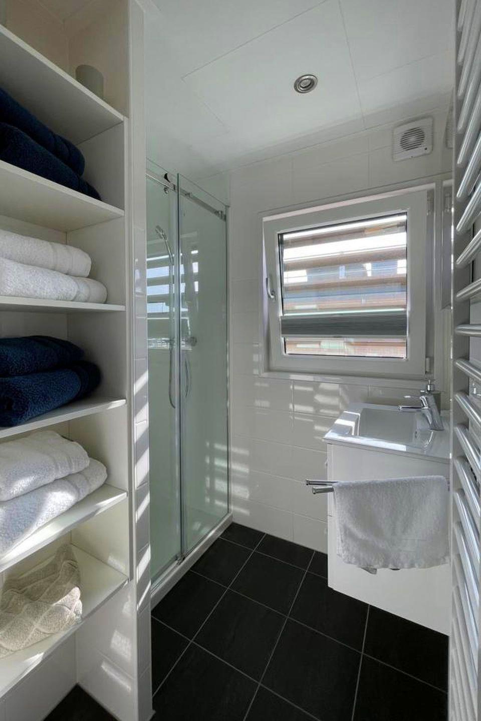 Das moderne Duschbad bietet Ihnen eine komfortable Duschtasse (90 × 80 cm) mit zweiteiliger Trennwand, eine Thermostat-Armatur sowie einen Waschtisch mit Schrank und beleuchtetem Spiegel. Ein Haartrockner steht ebenfalls bereit. Für zusätzlichen Komfort sorgt ein Elektro-Handtuchheizkörper, der Ihnen kuschelig warme Tücher bietet.