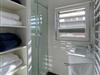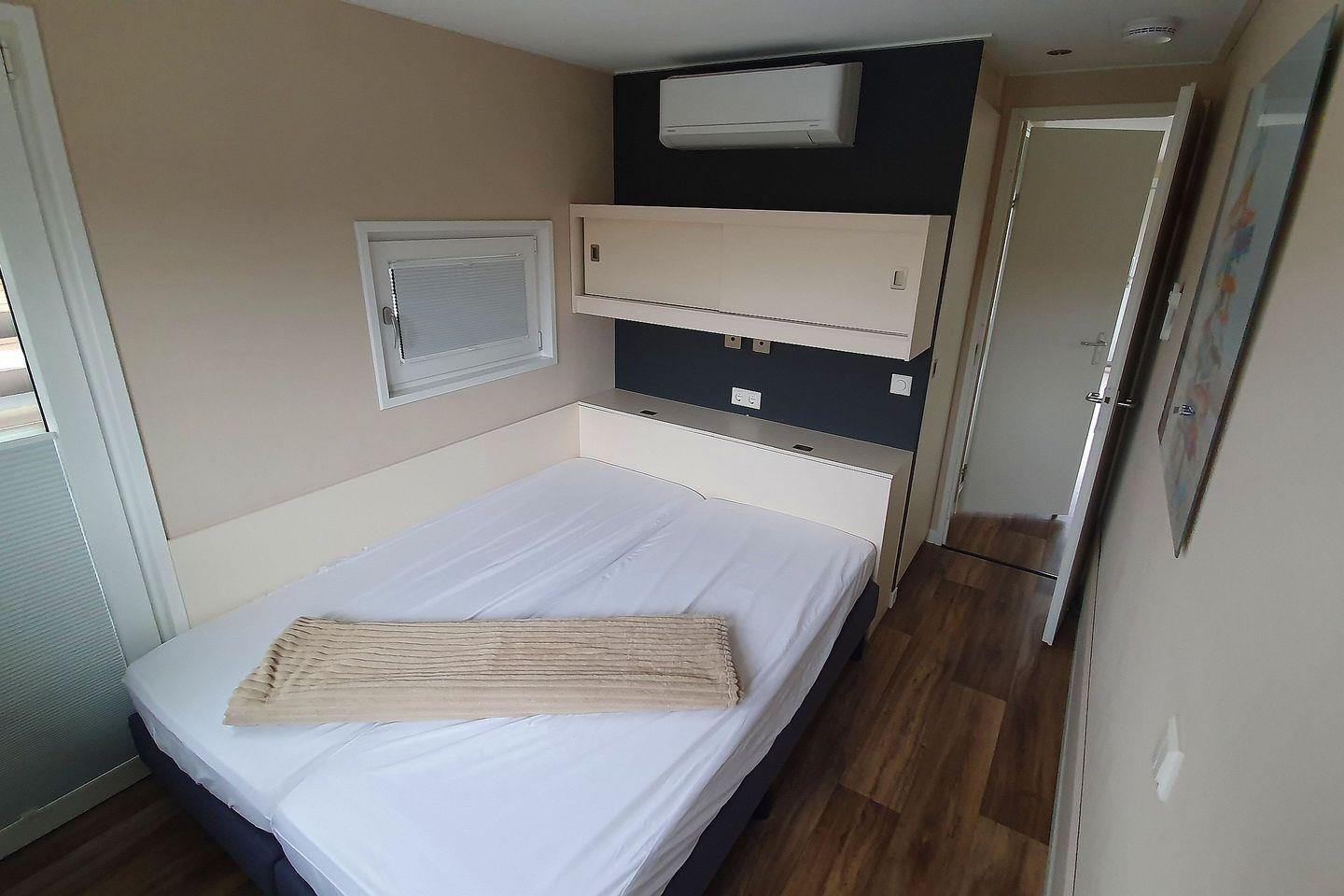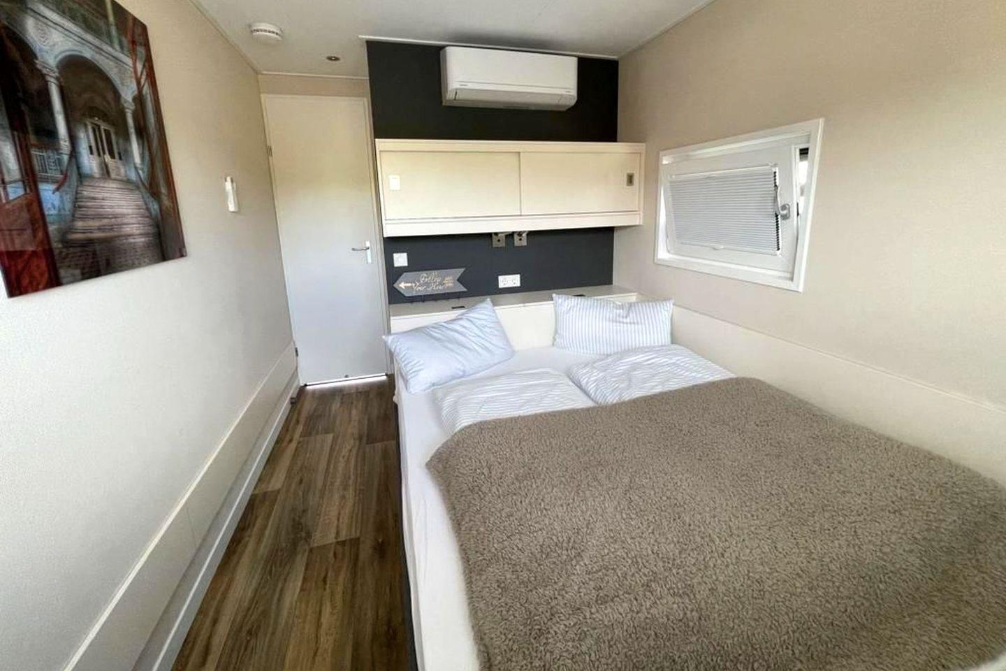 Jeder Raum verfügt über ein komfortables Doppelbett (1,60 × 2,00 m) mit offenem Fußende, praktische Einbauschränke und Wandregale sowie eine Lesebeleuchtung für gemütliche Abende. Zusätzlich sorgt ein eigenes Klimagerät für Ihr persönliches Wohlfühlklima. Sichtschutz, Sonnenplissees und Insektenschutzgitter runden den Komfort ab. Hier starten Sie ausgeruht in den Morgen – mit dem Gefühl, direkt am Wasser aufzuwachen.