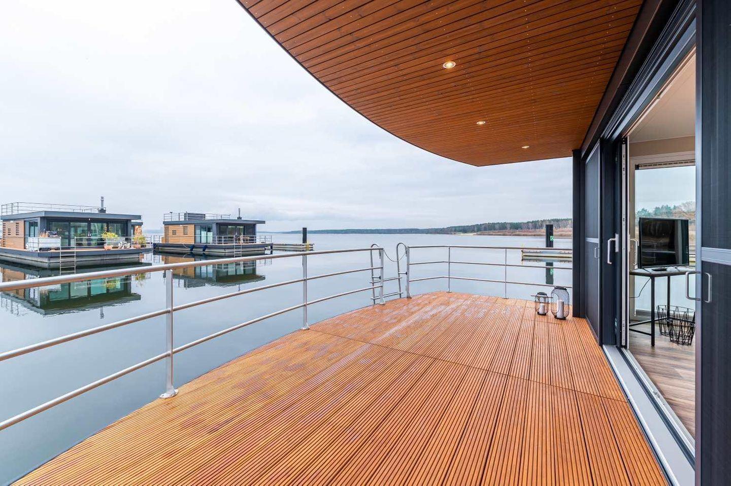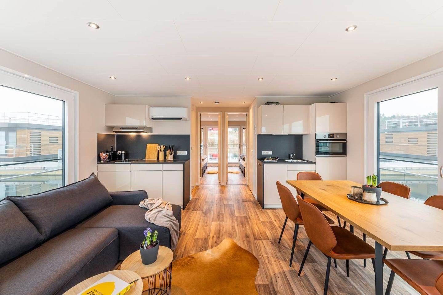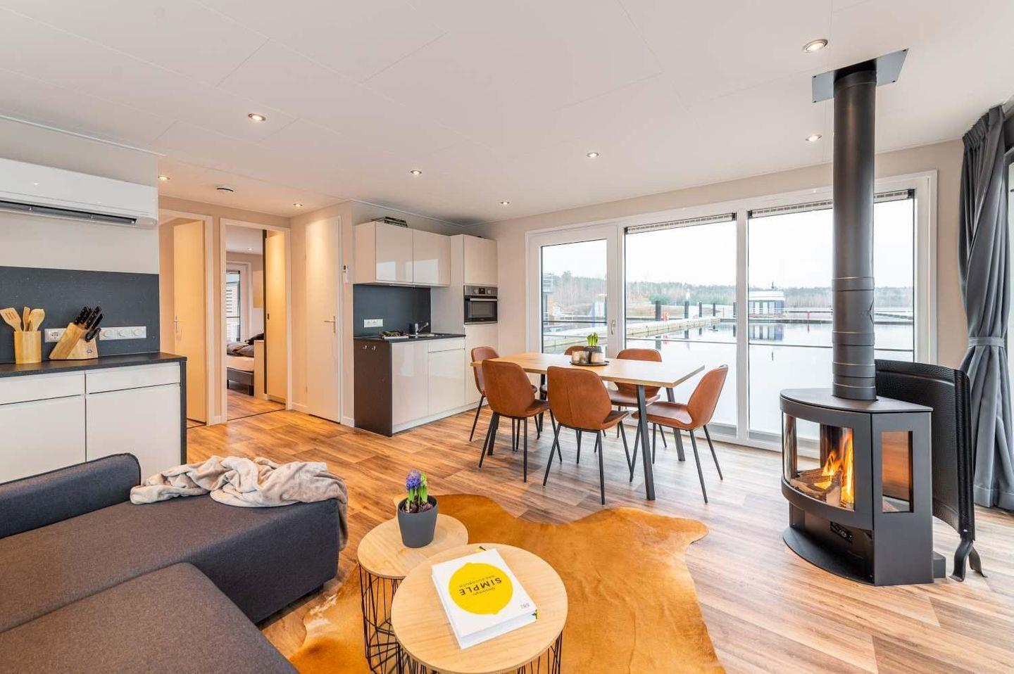 Floatinghouse Atlantis: freistehendes Nichtraucher-Ferienhaus auf dem Wasser mit Seeblick und Landschaftsblick. 44 m², 3 Zimmer, 2 Schlafzimmer und 1 Bad, Schlafmöglichkeiten für bis zu 6. Offene Küche zum Wohnzimmer mit Ceranherd und Spülmaschine. Überdachte Terrasse mit Gartenmöbeln und Sonnenliegen, Steg, WLAN/TV/Radio, Klimaanlage und Gaskamin. Kinder willkommen.