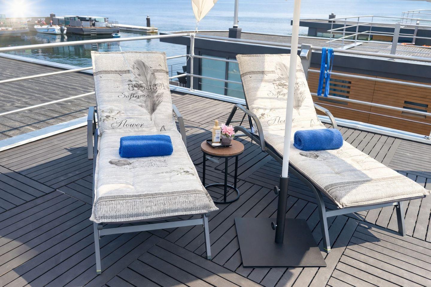 Floatinghouse Seestern: Terrasse mit direktem Blick aufs Wasser