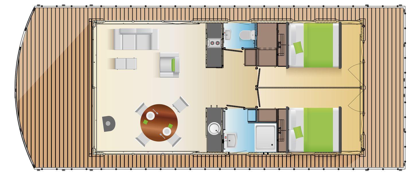 Auf 44 m² verteilen sich insgesamt 3 Zimmer, darunter 2 Schlafzimmer, ein Wohnzimmer mit Sofaecke und Essbereich sowie 1 Badezimmer. Insgesamt stehen Schlafmöglichkeiten für bis zu 6 Personen zur Verfügung. Für angenehmes Wohnklima sorgen Heizung und Klimaanlage; zusätzlich ist ein Gaskamin vorhanden. Sichtschutz an allen Fenstern sowie Fliegengitter tragen zu Komfort und Privatsphäre bei. WLAN, TV und Radio ergänzen die Ausstattung für entspannte Abende an Bord.