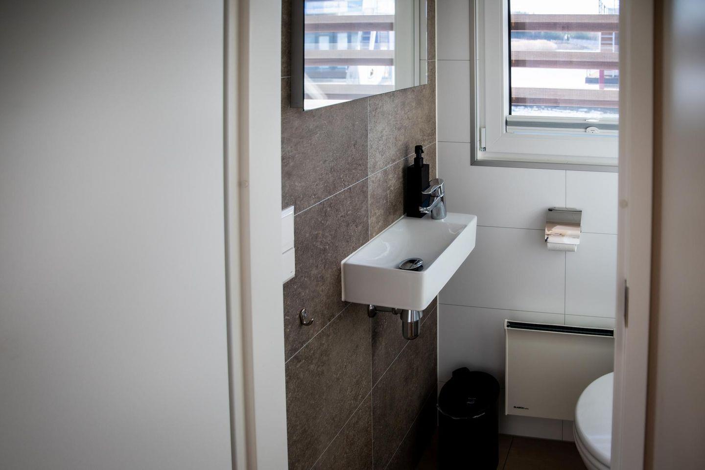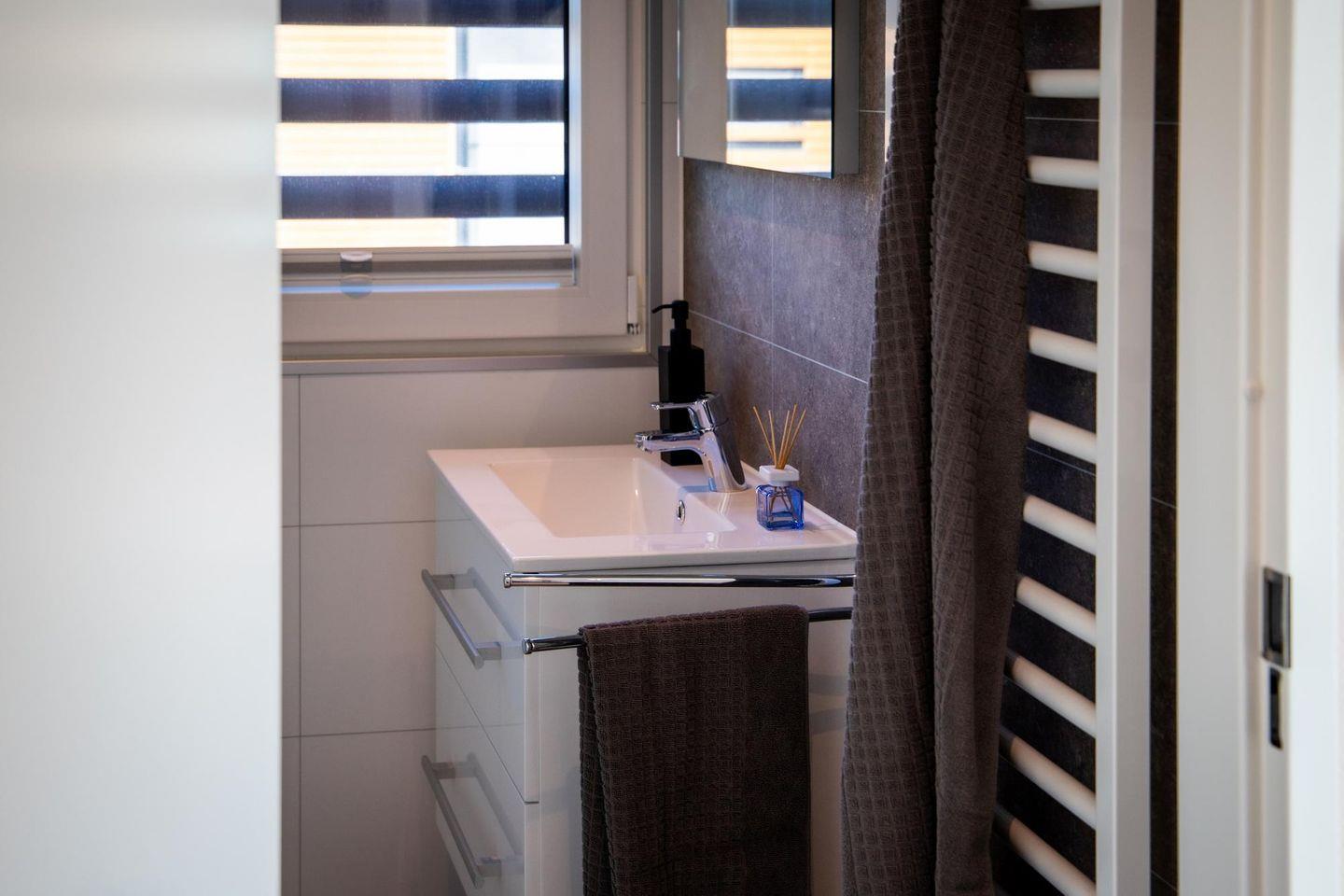 Das Badezimmer verfügt über Dusche, WC, Waschbecken, Spiegel, warmes Wasser und ein Fenster. Bettwäsche, Handtücher sowie eine Erstausstattung stehen bereit.