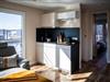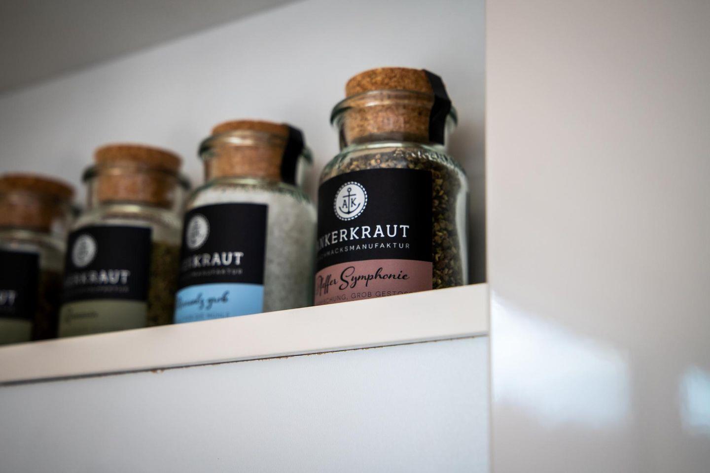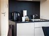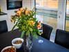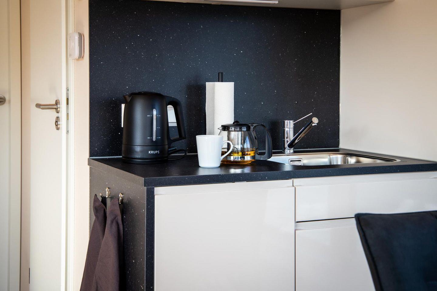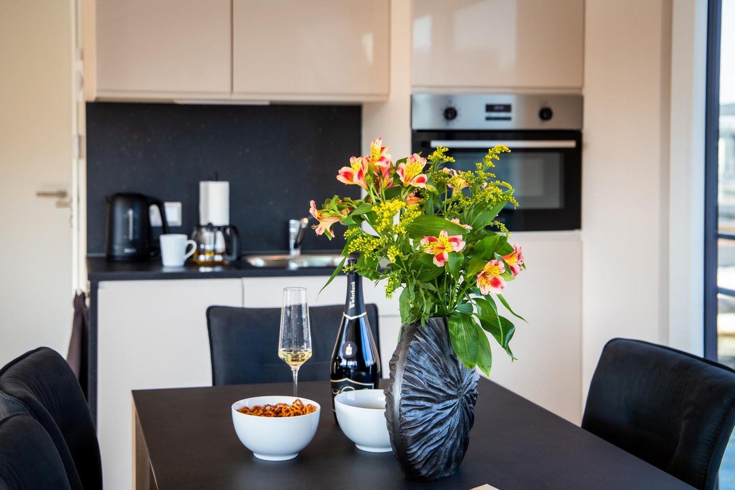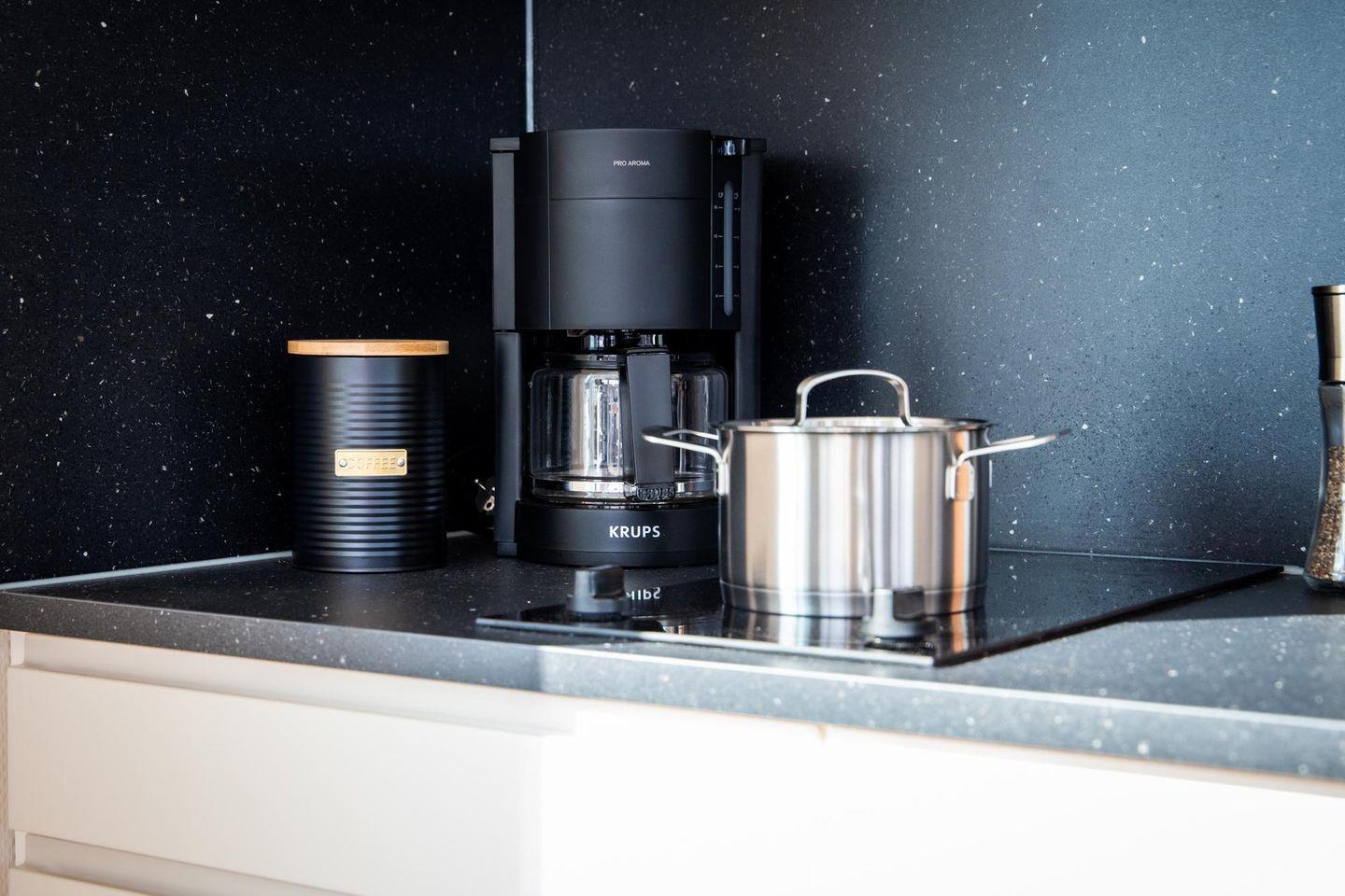 Die offene Küche ist zum Wohnzimmer hin gestaltet und umfassend ausgestattet: Ceran-Herd, Kühlschrank mit Gefrierfach, Spülmaschine, Kaffeemaschine, Wasserkocher, Toaster sowie Küchenutensilien, Geschirr und Besteck sind vorhanden; auch Geschirrhandtücher gehören dazu. Ein Esstisch bietet Platz für gemeinsame Mahlzeiten.