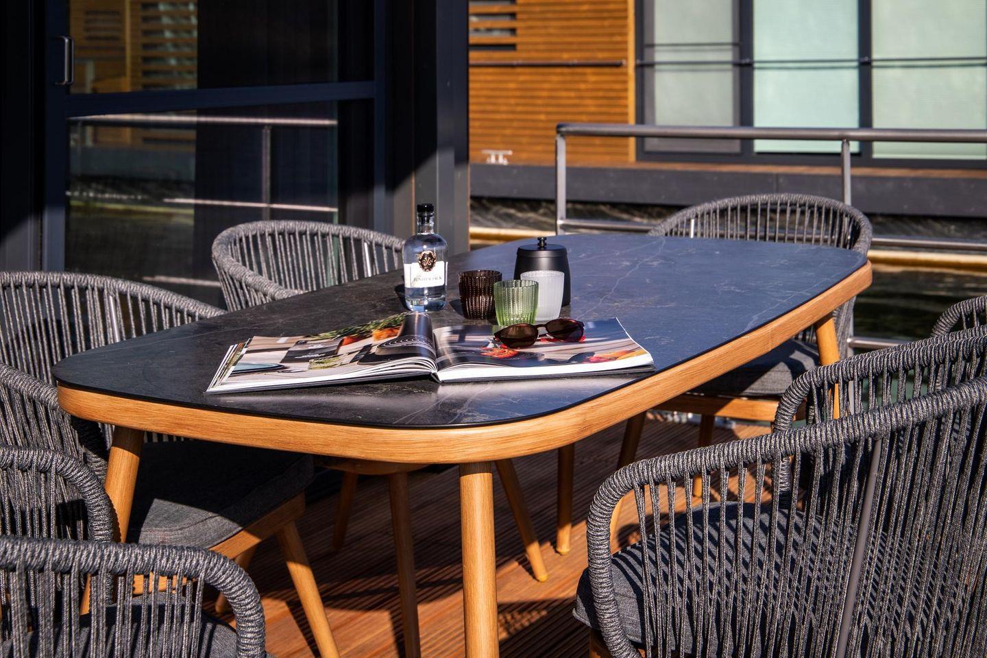 Im Außenbereich lädt die überdachte Terrasse mit Gartenmöbeln, Sonnenliegen und Sonnenschutz zum Verweilen ein. Ideal, um den Blick über den See zu genießen oder Aktivitäten am Wasser zu starten. Für Grillmomente steht ein Elektrogrill bereit.