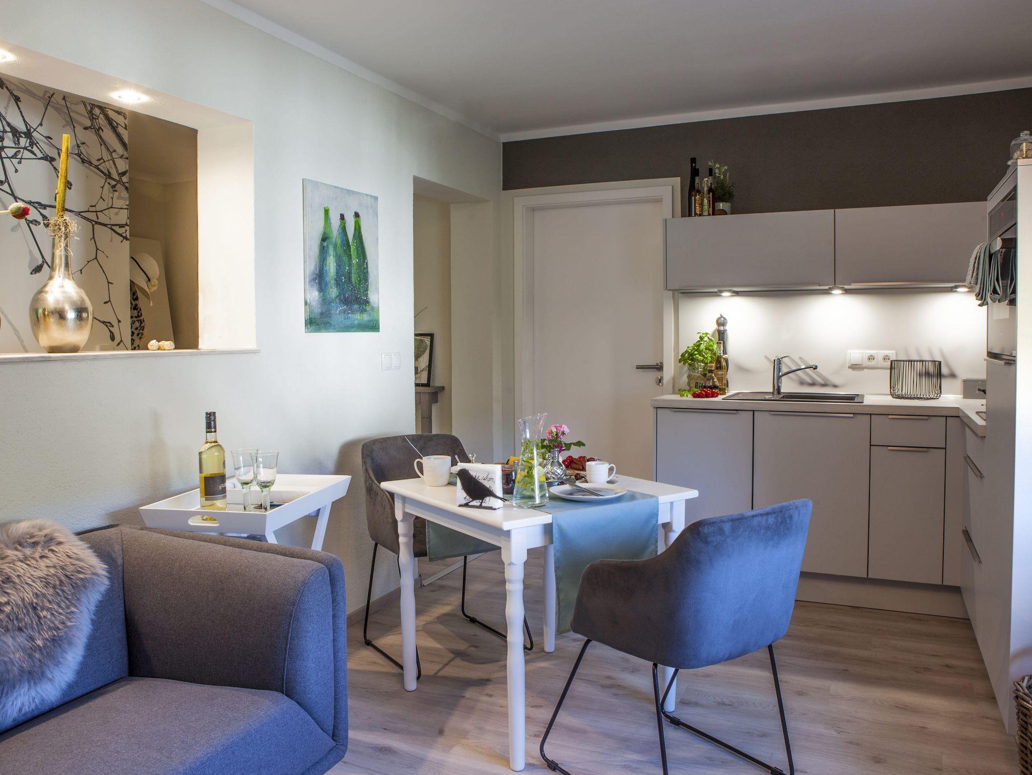 Die ca. 40m2 große Wohnung ist komplett ausgestattet und mit viel Liebe zum Detail eingerichtet. Neben einem Wohn/Essbereich verfügt sie über ein separates Schlafzimmer mit Balkon, sowie ein Duschbad.