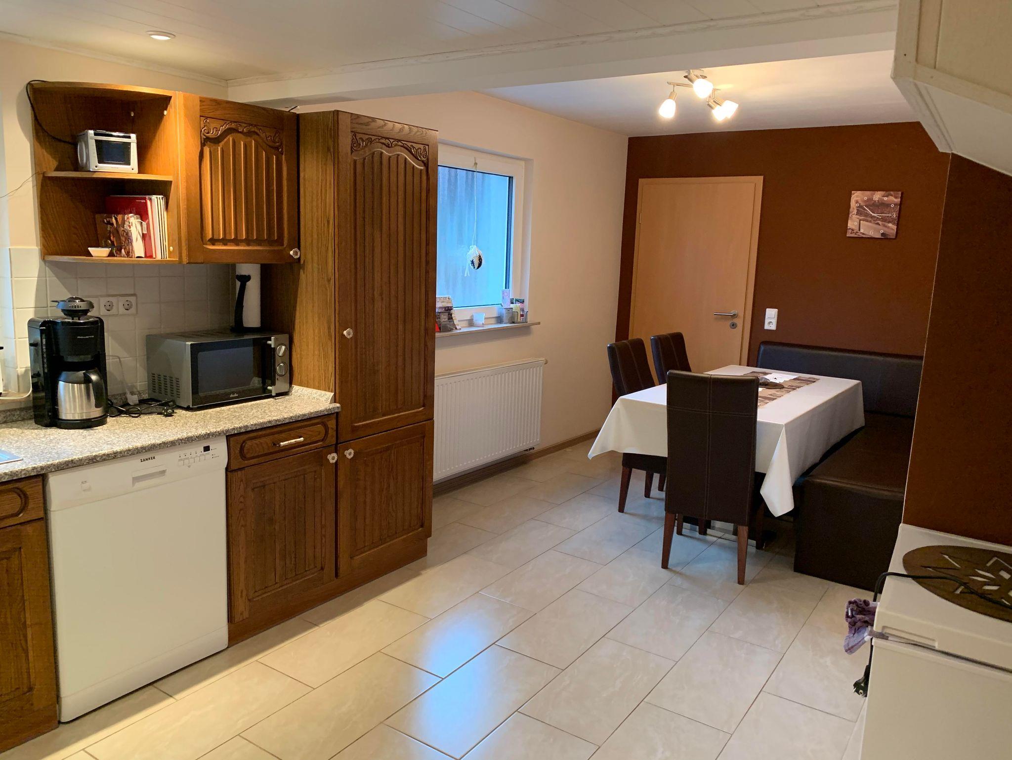 - Küche mit Essecke. Ausstattung: Spülmaschine, Mikrowelle, Cerankochfeld, Kühlschrank, kleine Gefriertruhe.