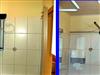 In der unteren Ebene befindet sich die Dusche, WC und ein Waschbecken. Es sind dort Flüssigseifenspender, Haarwaschspender und Duschgelspender montiert sowie zusätzlich ein Papierhandtuchspender.