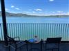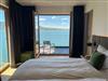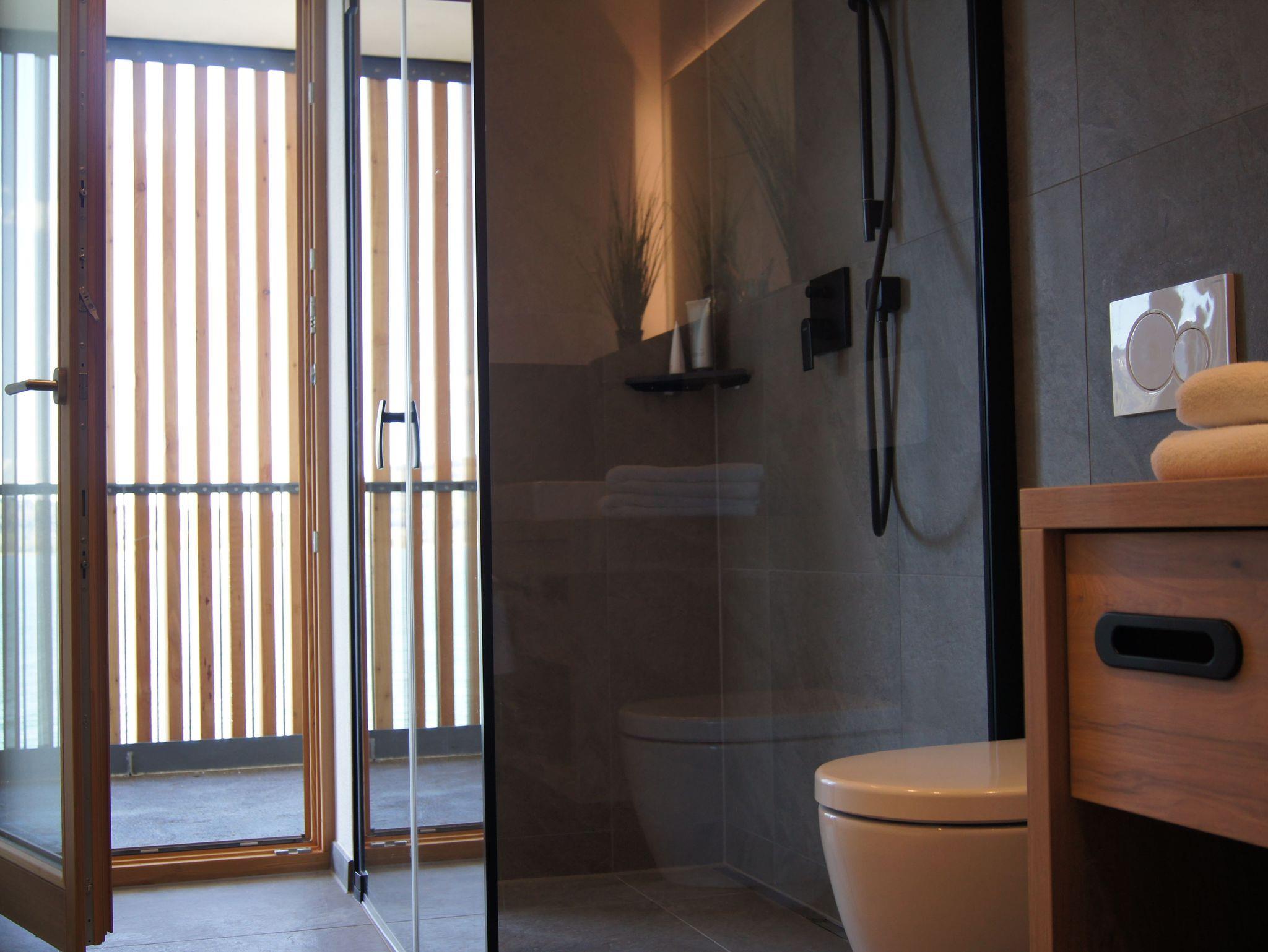 In das separate Schlafzimmer mit großem King-size Doppelbett (2x2 m) und (auch) Seeblick, ist ein großer Schrank eingebaut in dem auch ein kleiner Arbeitsplatz integriert ist (Thema „Workation“). Das Badzimmer mit Fußbodenheizung und begehbaren Dusche verfügt über einen direkten Zugang zum Balkon auf dem sich die kleine private Sauna befindet.