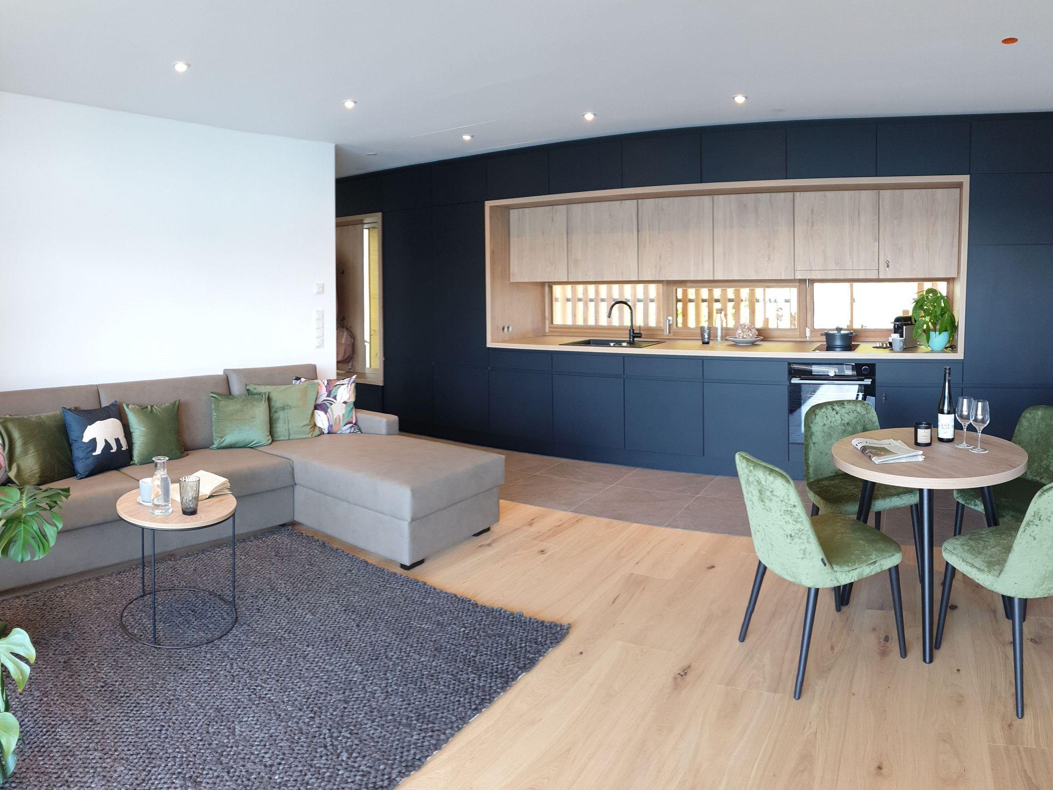 Die Apartments verfügen über ein Wohnzimmer (ca 30qm) mit gemütlichem Esstisch, einer Couch die man bequem in ein Zusatzbett umfunktionieren kann, einen großen Flat-TV für einen gemütlichen Fernseh-Abend und natürlich einen fantastischen Seeblick. Die integrierte und voll ausgestattete Designerküche ist mit einem Induktionsherd, Backofen, Espresso- und Spülmaschine ausgestattet. Selbstverständlich sind Kochutensilien, Geschirr, Gläser etc. vorhanden.