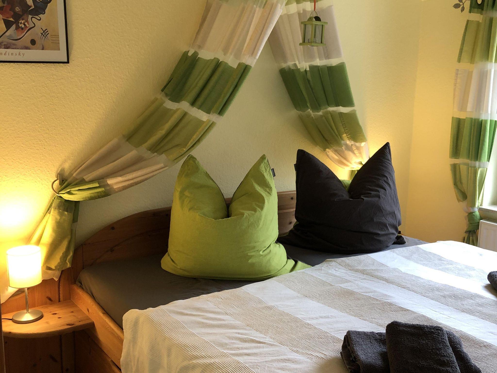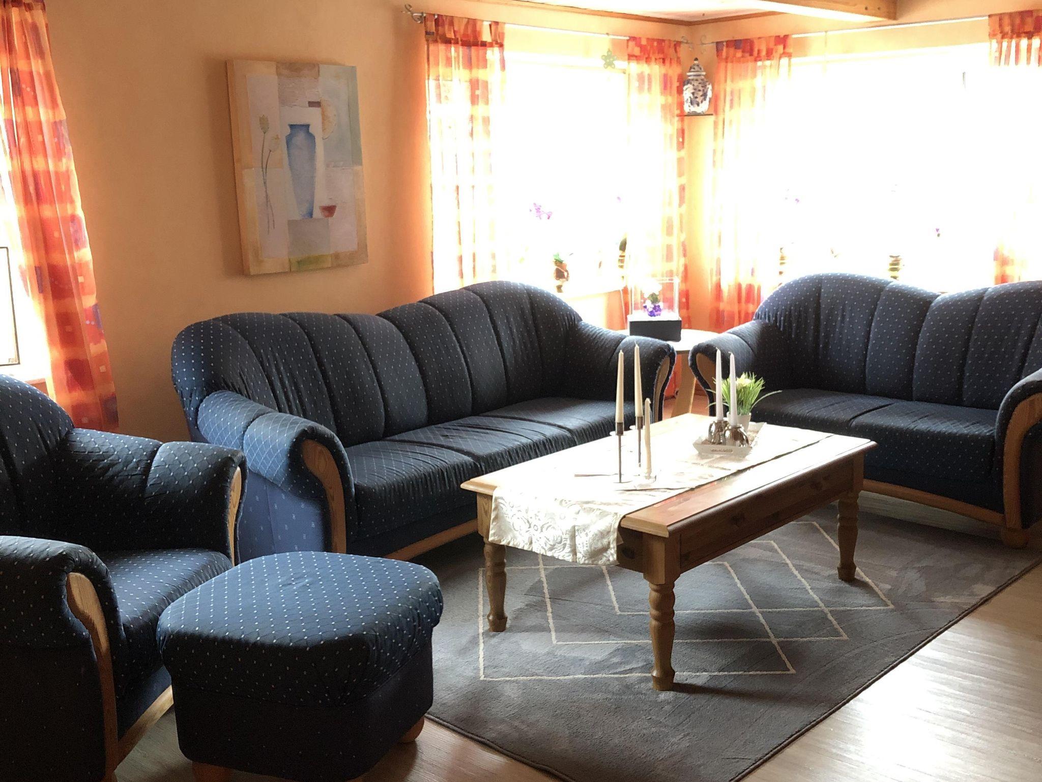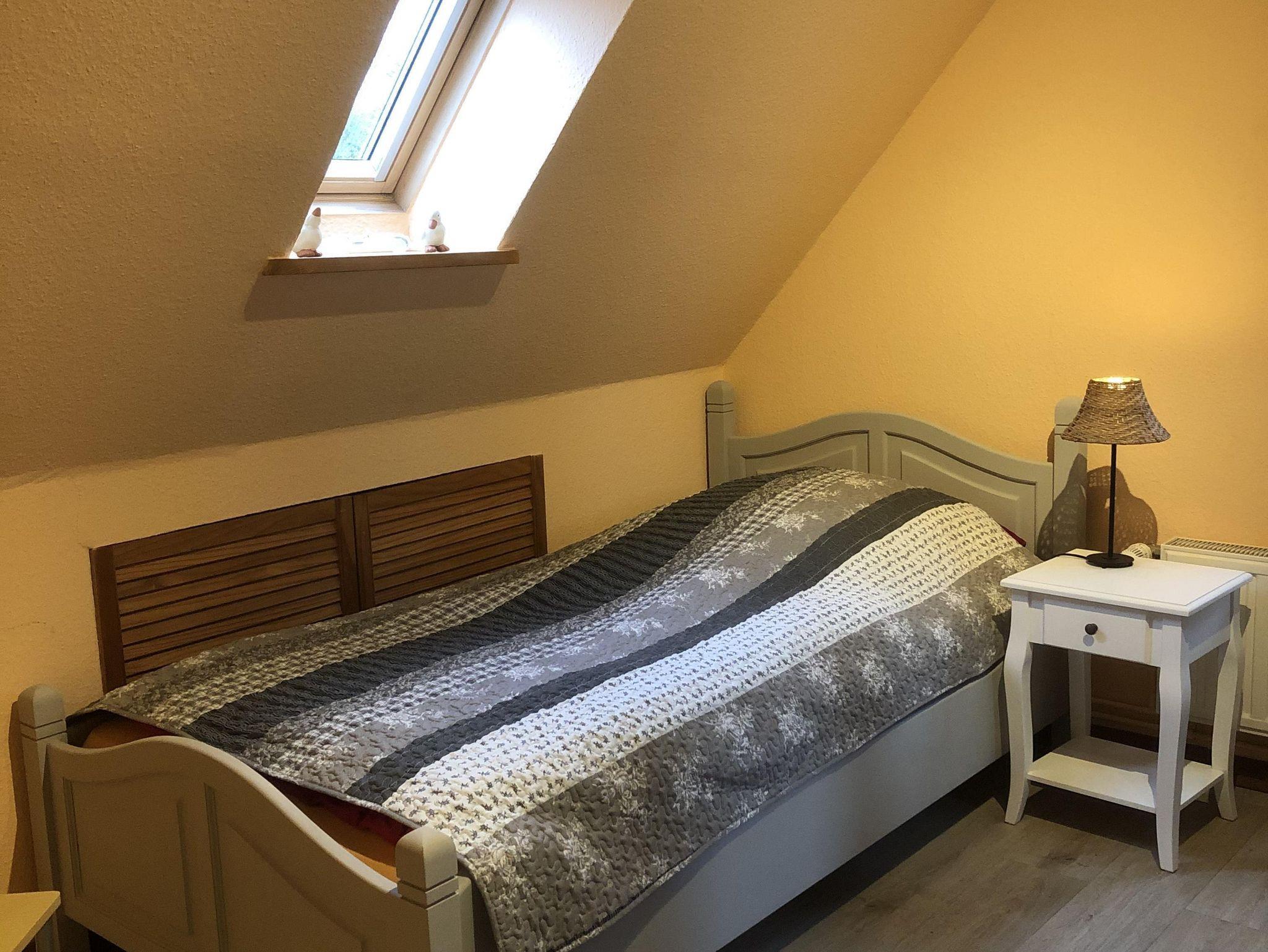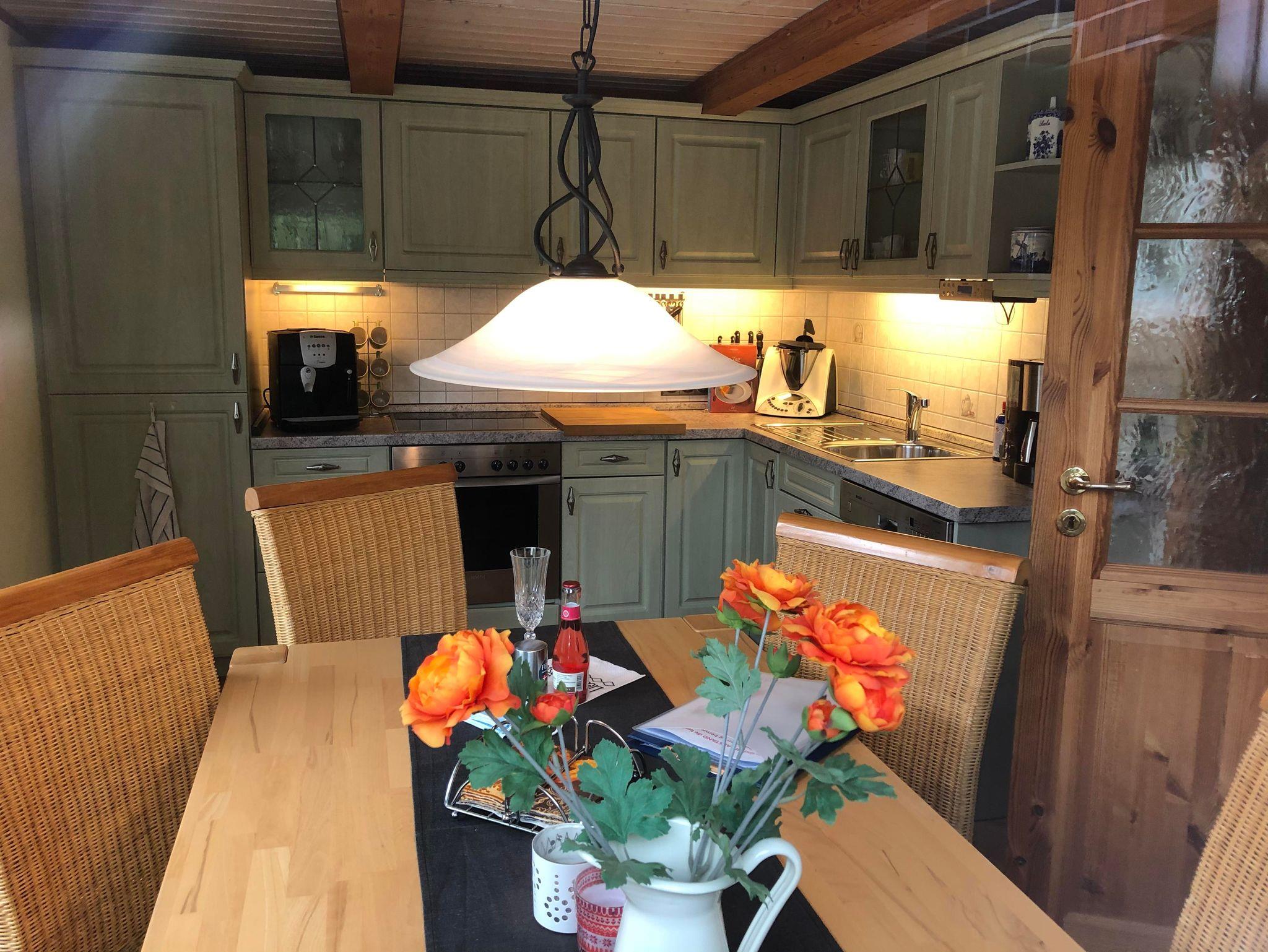 Auf 95 qm stehen Ihnen drei Schlafräume zur Verfügung. Die Haushälfte verfügt im Erdgeschoss über eine Diele und eine komplett eingerichtete Küche. Die Küche ist mit einem Umluftherd mit Ceranfeld, Geschirrspülmaschine, Mikrowelle, Kühlschrank mit Gefrierfach, Thermomix, Kaffeevollautomat und allem was zu einer Küchenausstattung gehört ausgestattet. Das Wohnzimmer ist gemütlich eingerichtet, mit Fernseher, DVD-Player und Musikanlage. Ebenso befindet sich hier das Badezimmer mit Wanne, Dusche und WC. Im Obergeschoss finden sich sowohl ein Schlafzimmer mit Doppelbett als auch ein Schlafraum mit Einzelbett. Das ausgebaute Dachgeschoß bietet eine offene Galerie mit einem Doppelbett. Für kleine Gäste steht ein Reisebett bereit. Bettwäsche und Handtücher sind im Preis enthalten und WLAN steht den Gästen kostenfrei zur Verfügung. Ab Oktober 2022 wird Strom und Gas nach Verbrauch zusätzlich berechnet.