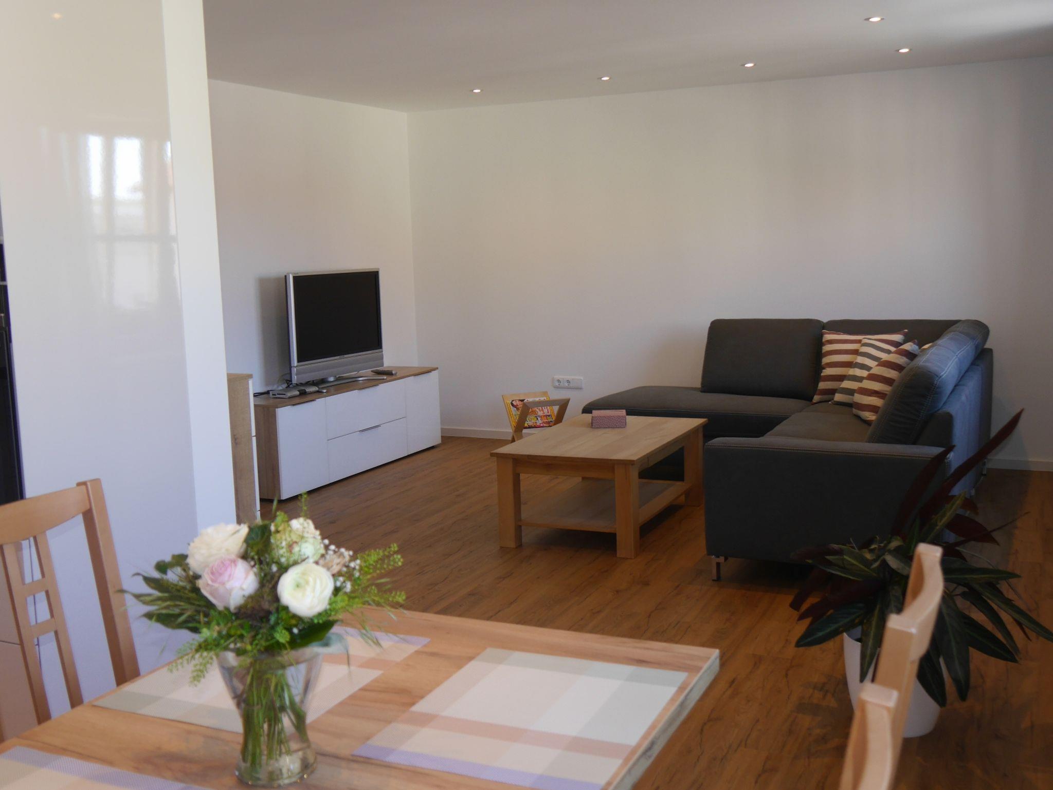 Wohnzimmer mit Flachbild-TV lädt zum Verweilen ein. Die komplett ausgestattete Ess-Küche mit Geschirrspüler, Kühl-