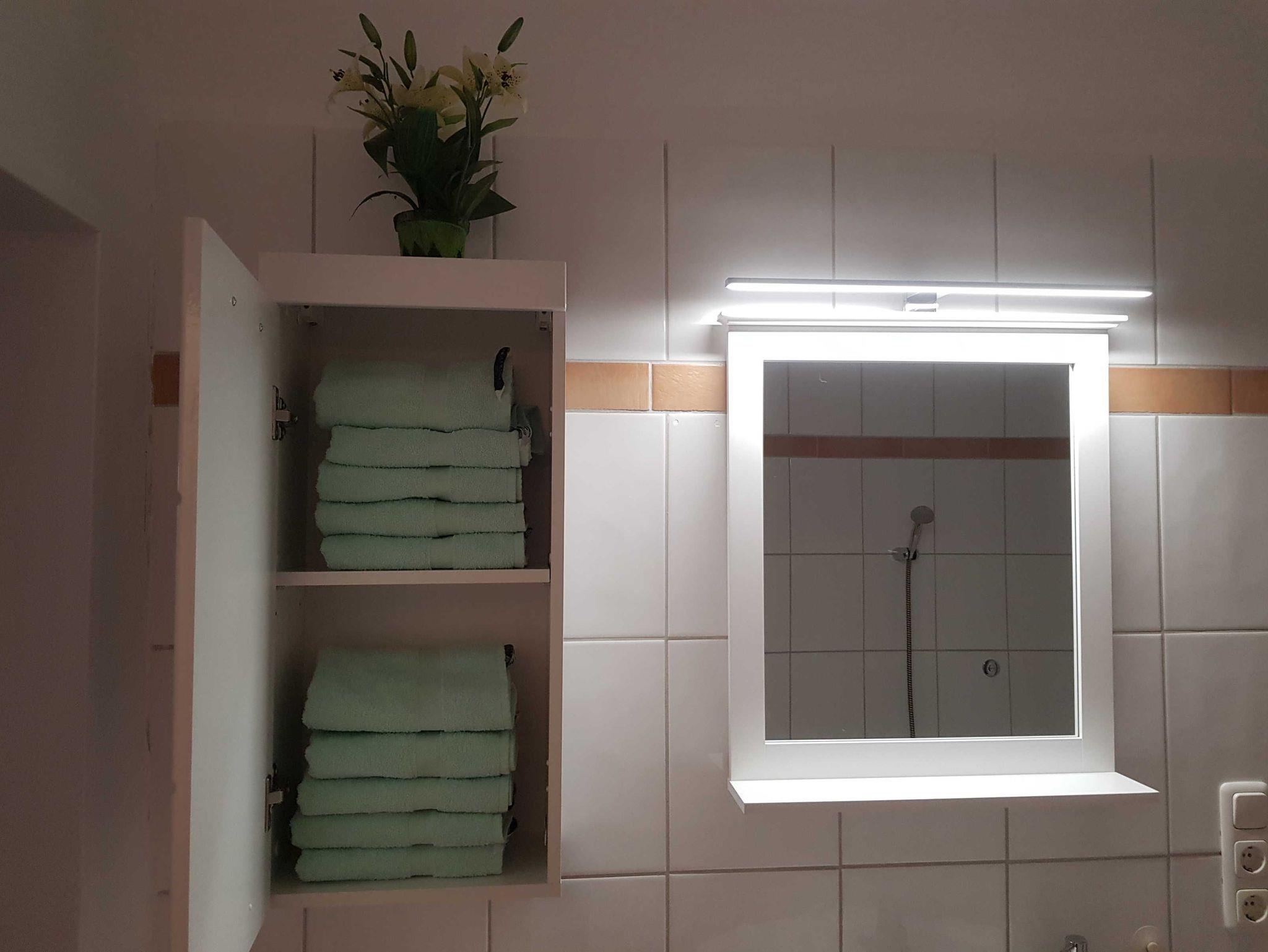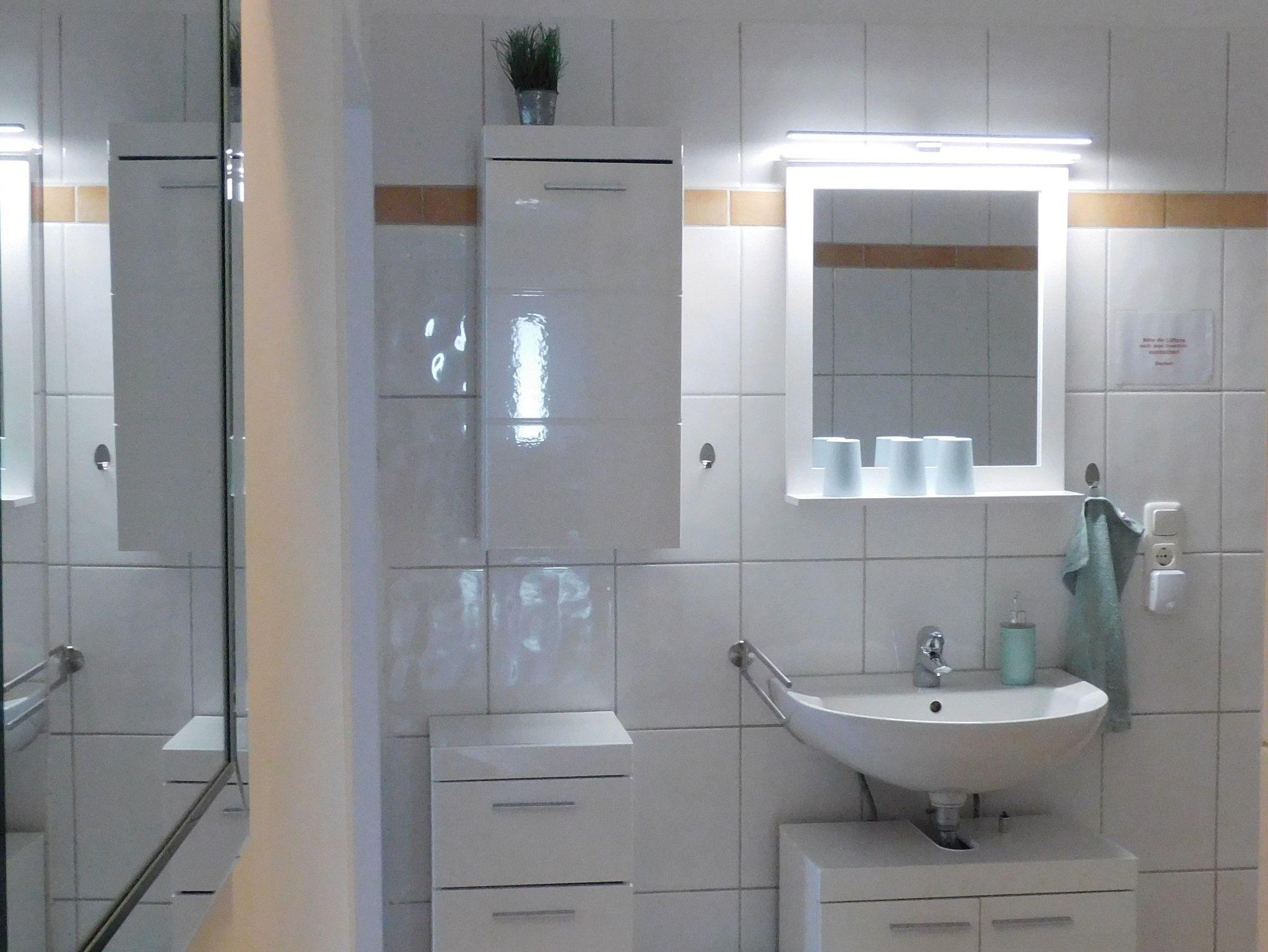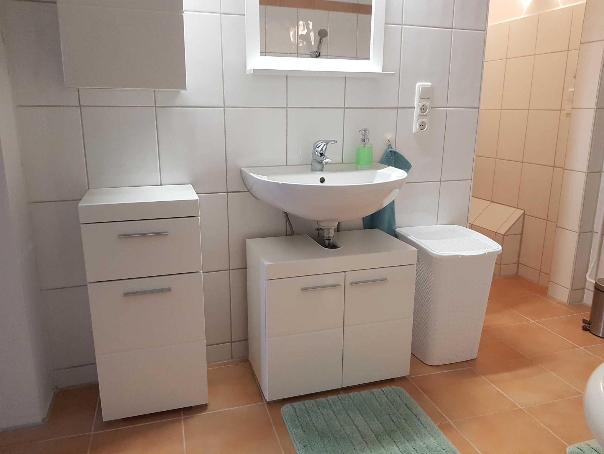 Im Badezimmer ist eine Dusche vorhanden. Das WC im Badezimmer ist wie auch die Dusche durch Nischen abgetrennt.