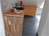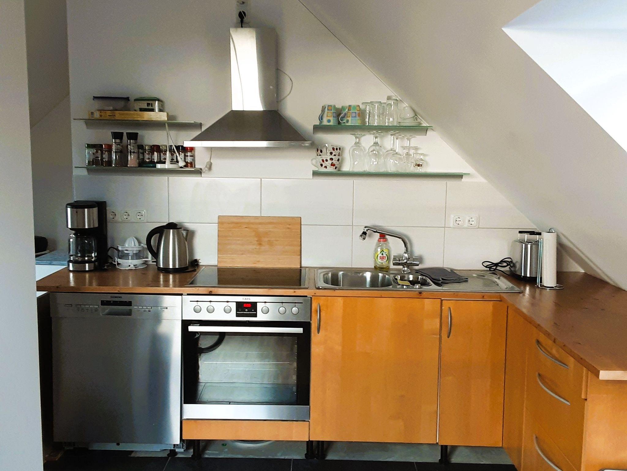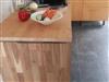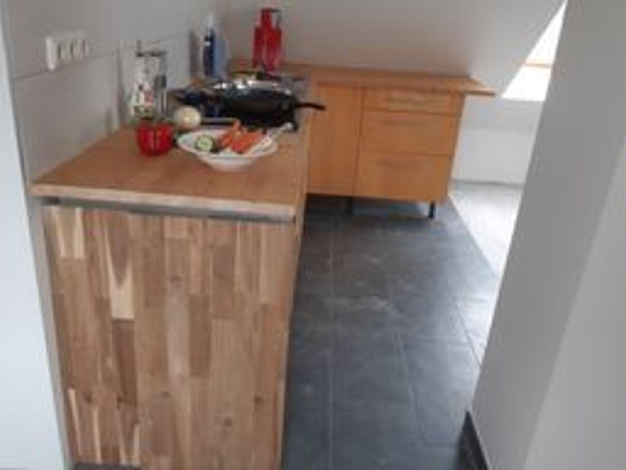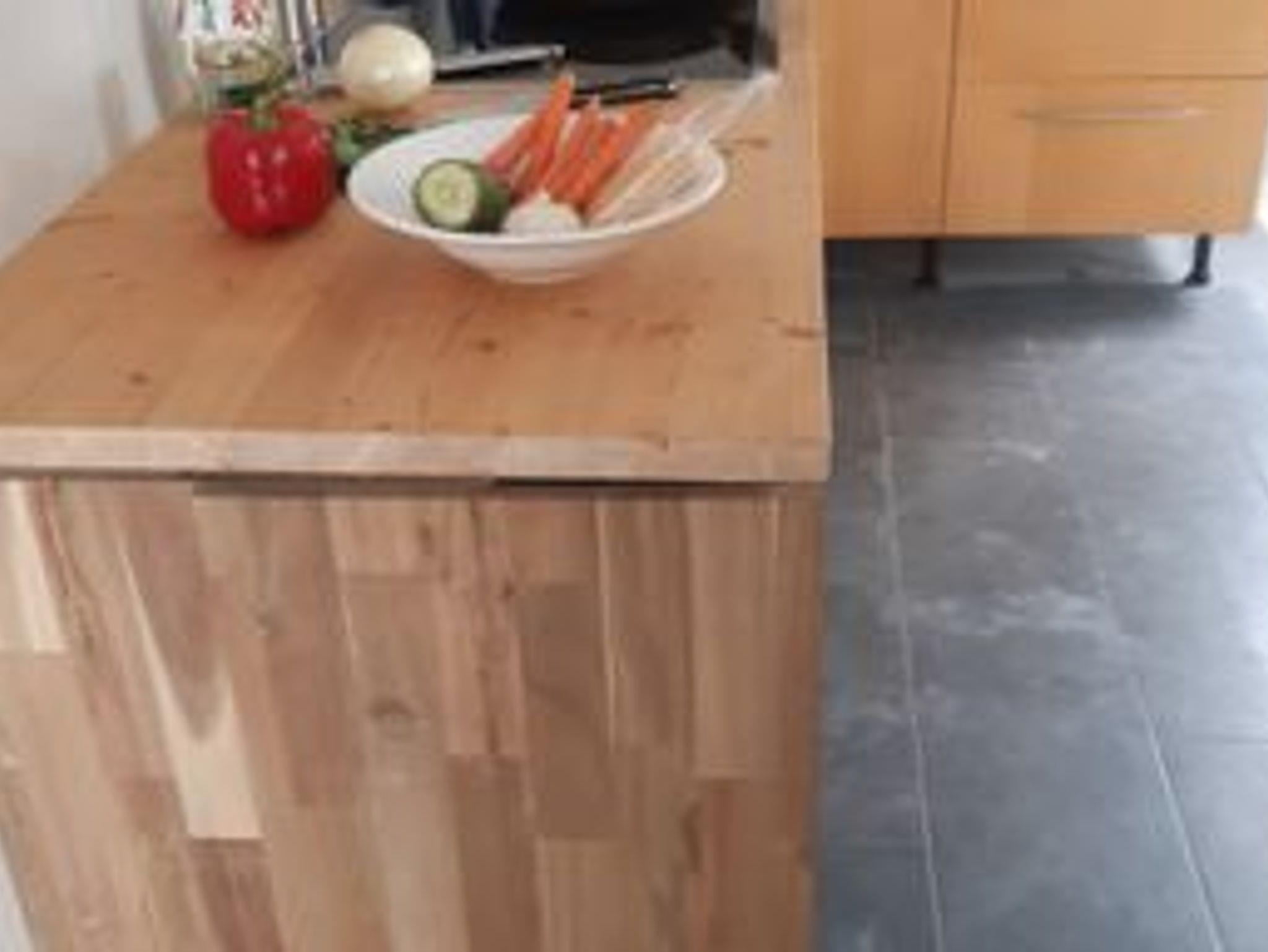 Offene Einbauküche mit massiver Holzarbeitsplatte. Geschirrspüler, etc.