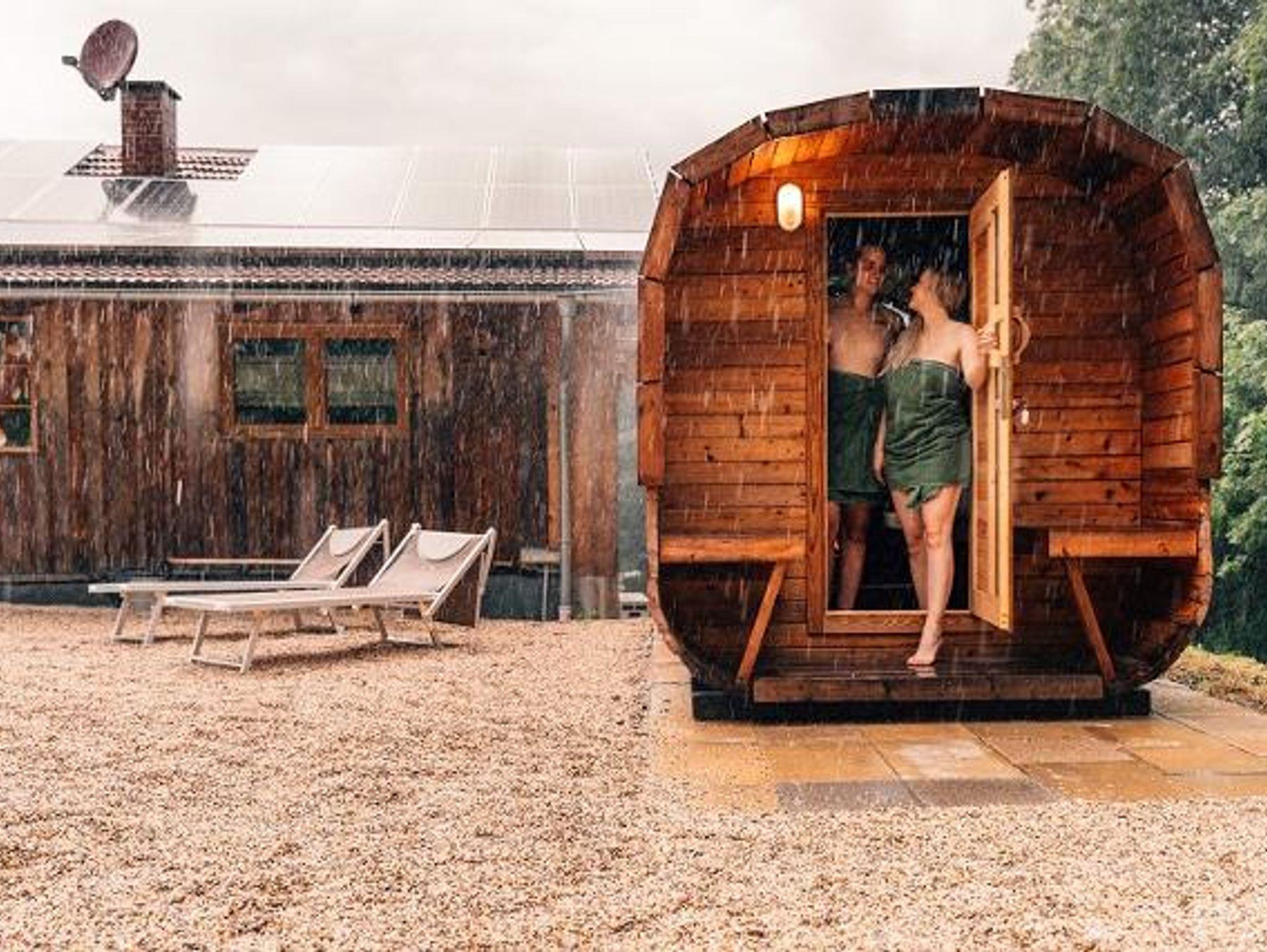 Eine Faßsauna steht vorübergehend beim Woidhaus und kann bei Verfügbarkeit kostenpflichtig hinzugebucht werden.