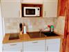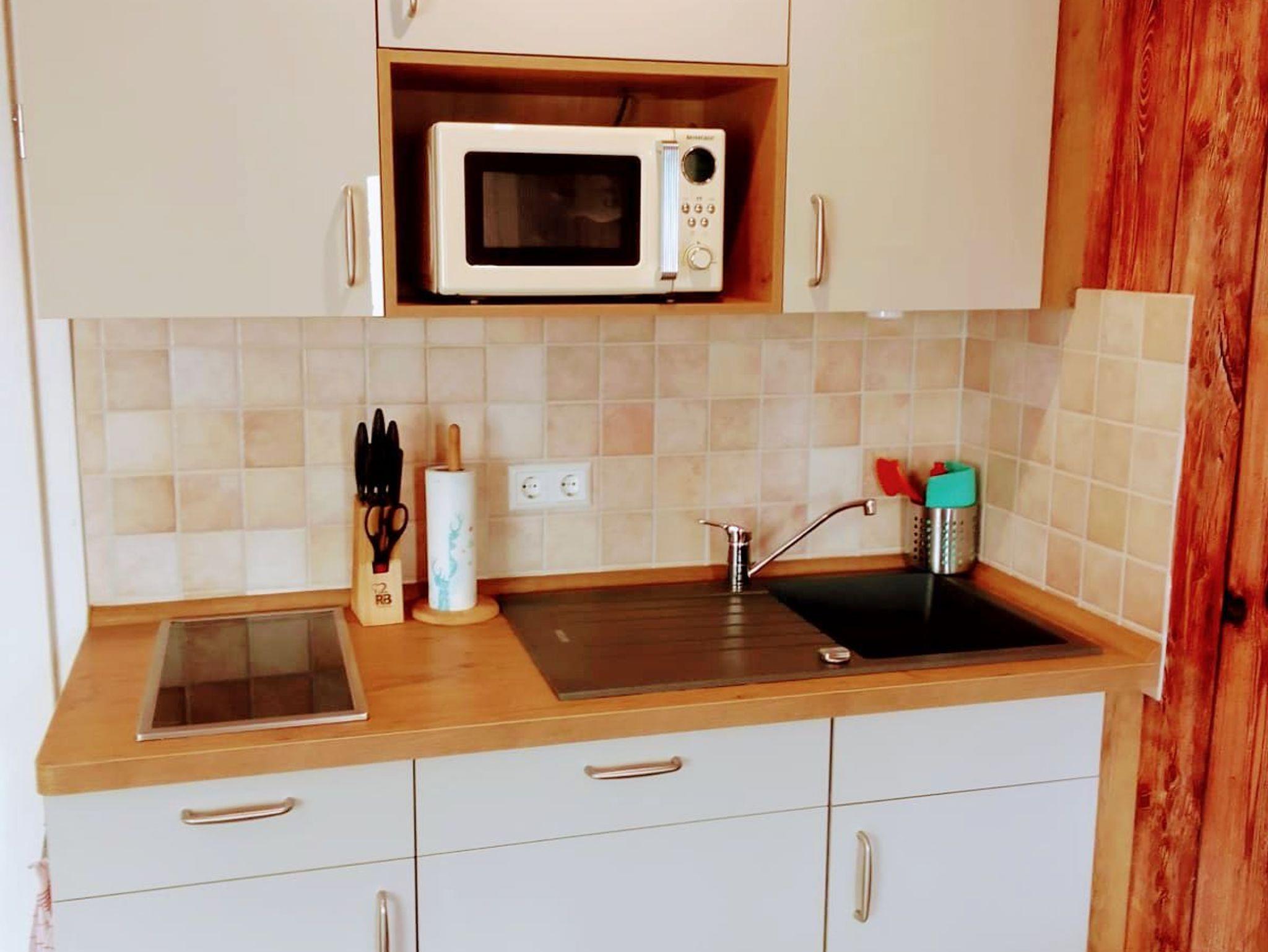 Das ca 30 m2 große Appartement Alm besteht aus einem modernem Bad mit einer ebenerdigen großen Regendusche und Fußbodenheizung sowie einem großem Zimmer mit neuer kleinen Küchenzeile mit Kühlschrank, Cerankochfeld, Mikrowelle, Geschirr, Besteck.