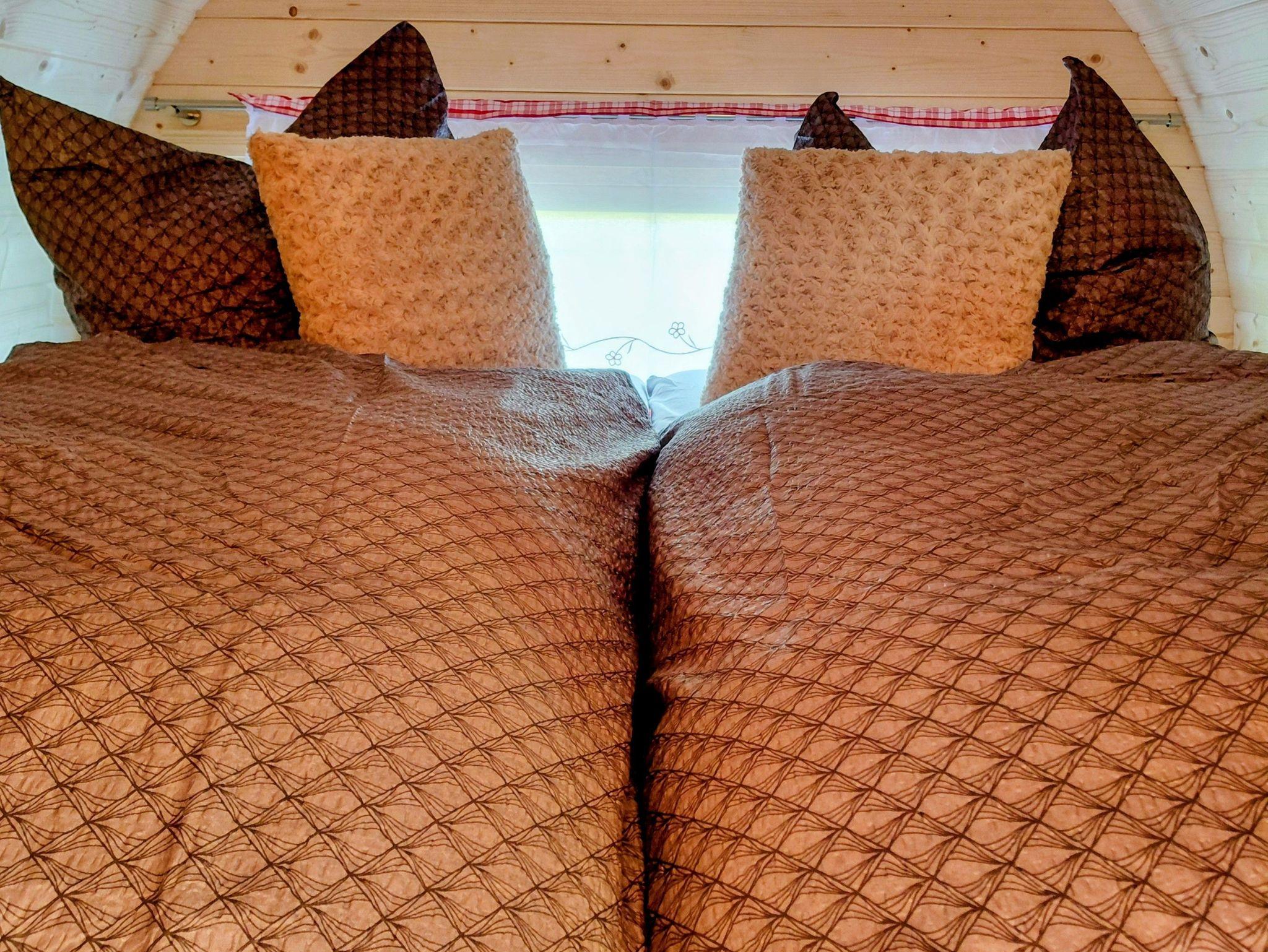 Im XL Spreewald Schlaffass haben Sie den freien Blick aus dem Bett heraus ins Feld und Sonnenaufgang.