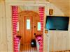 Das Schlaffass ist ca 5m lang. Im vorderen Bereich befinden sich Sitzmöglichkeiten, im hinteren Bereich der Schlafplatz mit dem großen Bett 200x200cm mit TV und Panoramafenster.