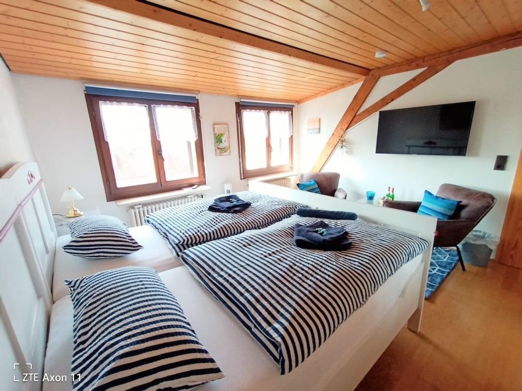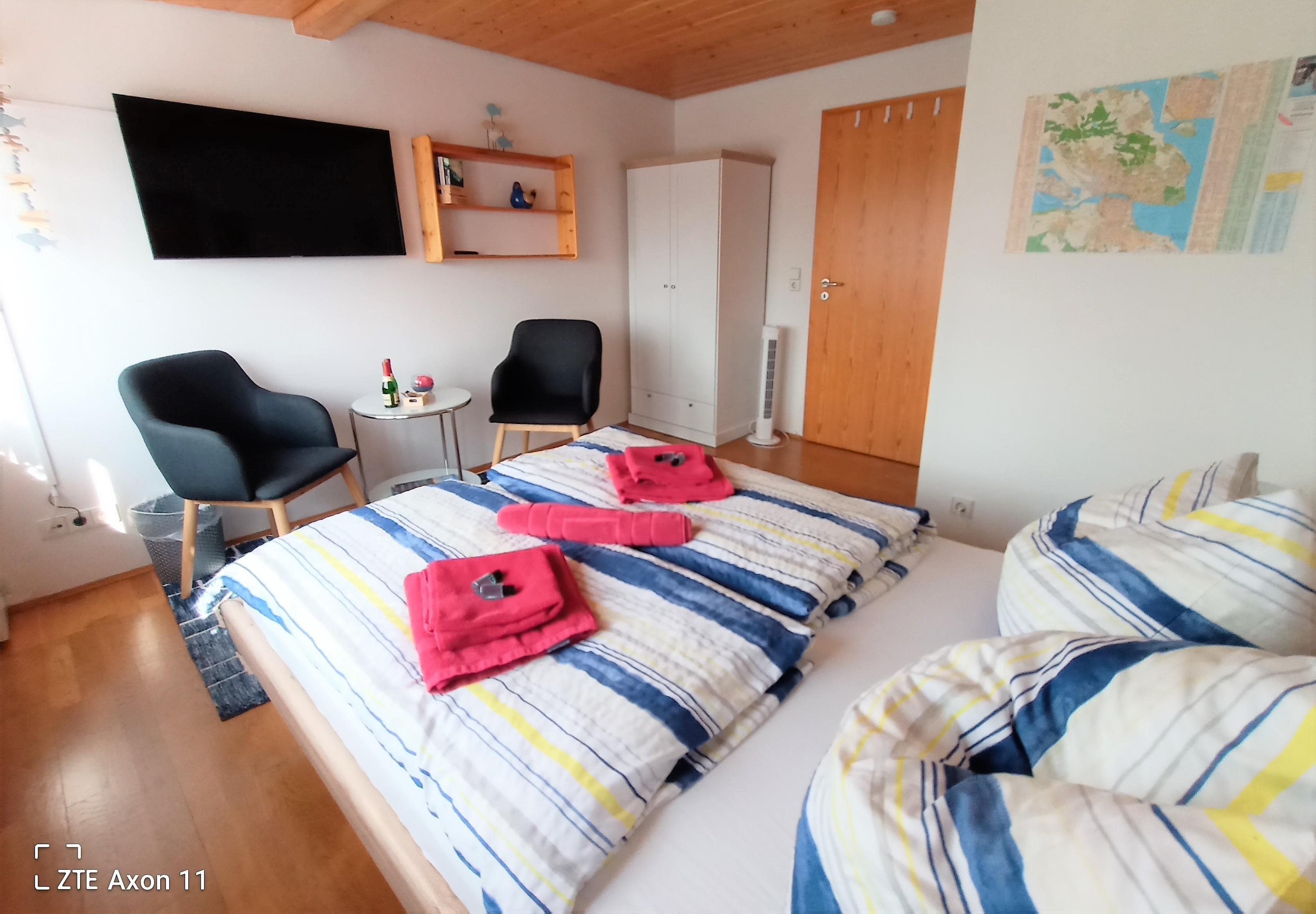 Wir bieten Ihnen zwei moderne und gemütliche Doppelzimmer jeweils mit TV, Sitzecke und einem Doppelbett: Sie buchen das Zimmer REICHENAU, welches mit Doppelbett 1,80 x 1,90 m (!!!) ausgestattet ist. Sie können das Zimmer MAINAU mit französischem Doppelbett 1,40 x 2,00 m dazu buchen für eine 3. und 4 Person,. Ein gemeinsam genutztes Badezimmer mit Dusche und Doppelwaschbecken sowie eine großzügig ausgestattete Gemeinschaftsküche befinden sich auf der gleichen Etage sowie Gäste-WC.
