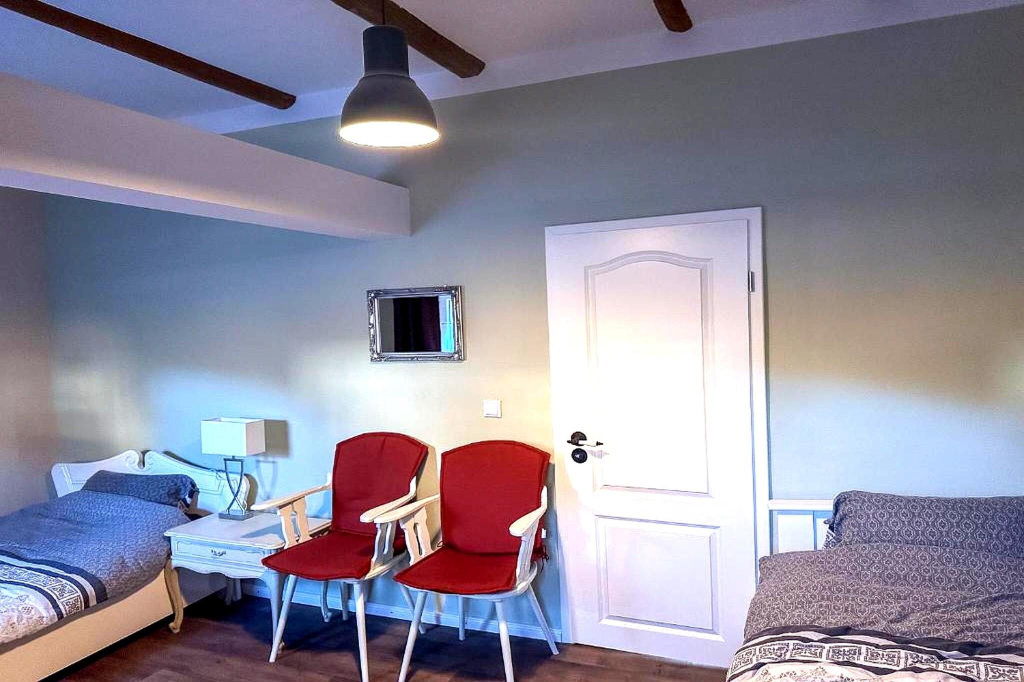 Parterre: (Wohnzimmer(TV, Dekokamin, Sitzecke), Küche(Esstisch, Wasserkocher, Toaster, Kochherd, Dunstabzugshaube, Kaffeemaschine, Backofen, Mikrowelle, Spülmaschine, Kühlschrank, Tiefkühlschrank), Badezimmer(Trockner, Badewanne mit Dusche, Waschbecken, Toilette, Waschmaschine)) In der 1. Etage: (Schlafzimmer(Einzelbett, Einzelbett, TV), Schlafzimmer(Einzelbett, Einzelbett, Schlafcouch 1 Pers., TV), Badezimmer(Dusche, Waschbecken, Toilette)) Terrasse, Garten, Gartenmöbel, Grill, Parkplatz