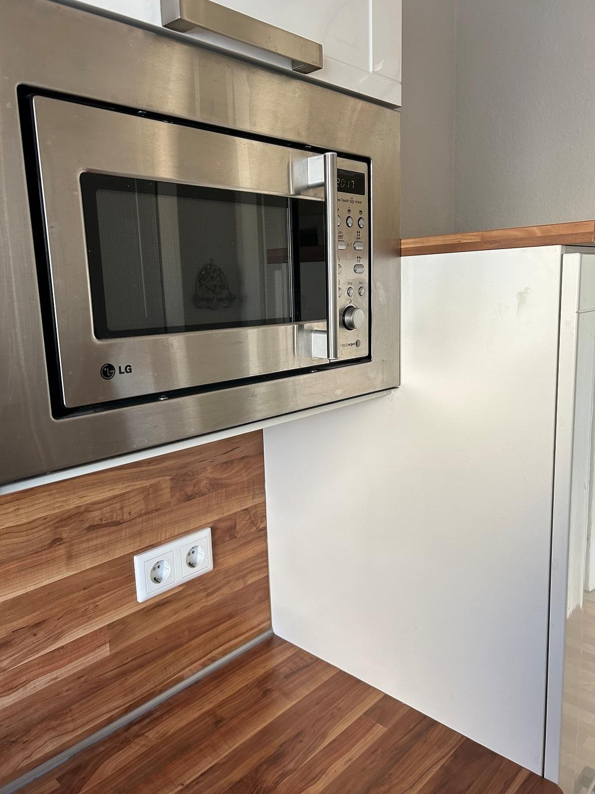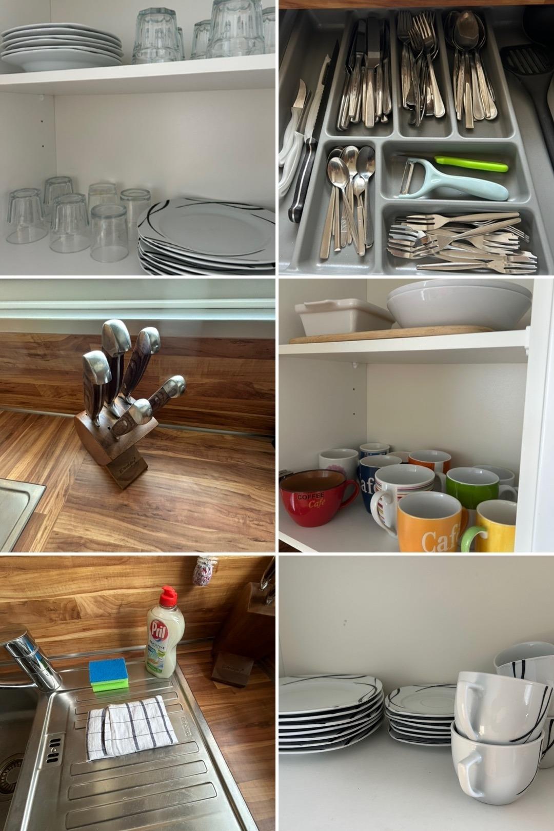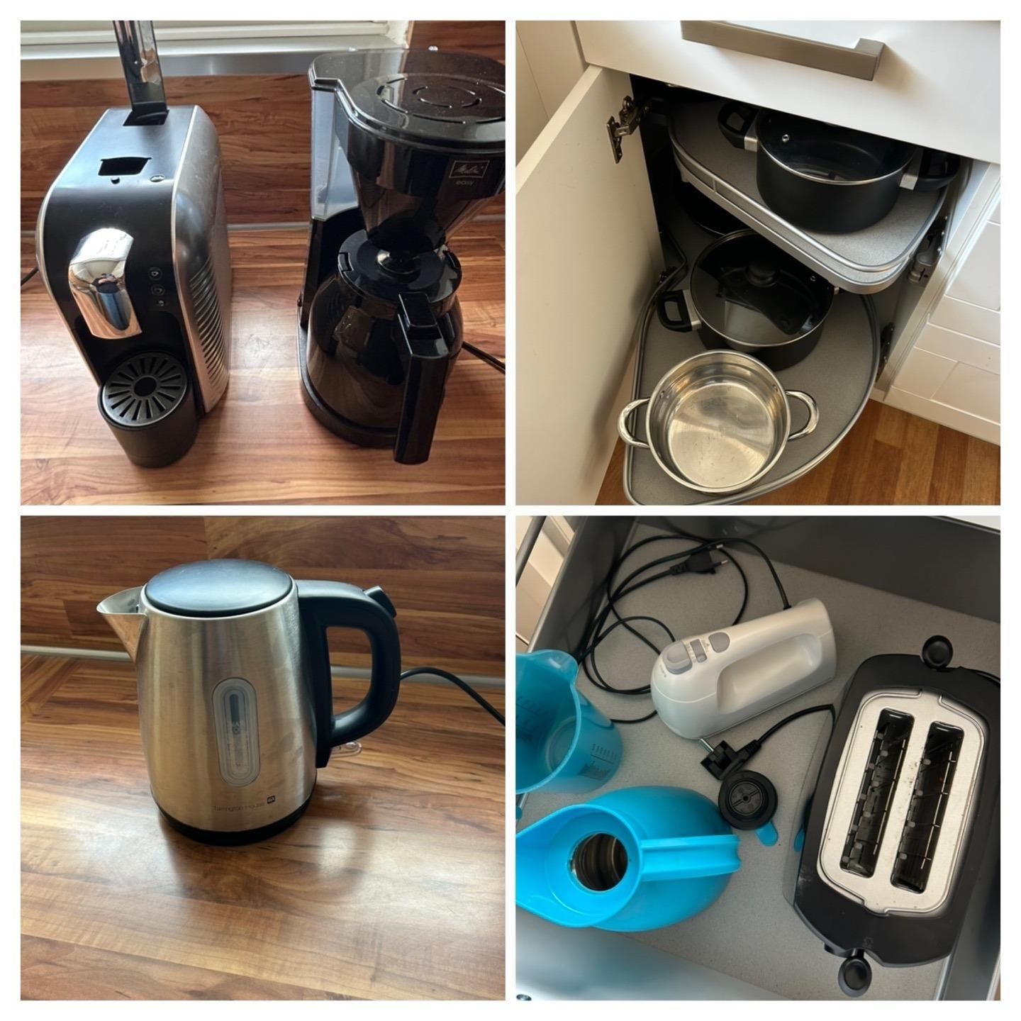 Die moderne Einbauküche verfügt über ein Cerankochfeld, Backofen, Kühlschrank mit Gefrierfach sowie eine Mikrowelle. Die Küchenausstattung umfasst alles, was Sie für die Zubereitung leckerer Speisen benötigen; von Pfannen und Töpfen über Teller und Besteck bis hin zu einer K-fee Kapselmaschine, einer Filterkaffeemaschine, Wasserkocher, Mixer und einem Toaster.