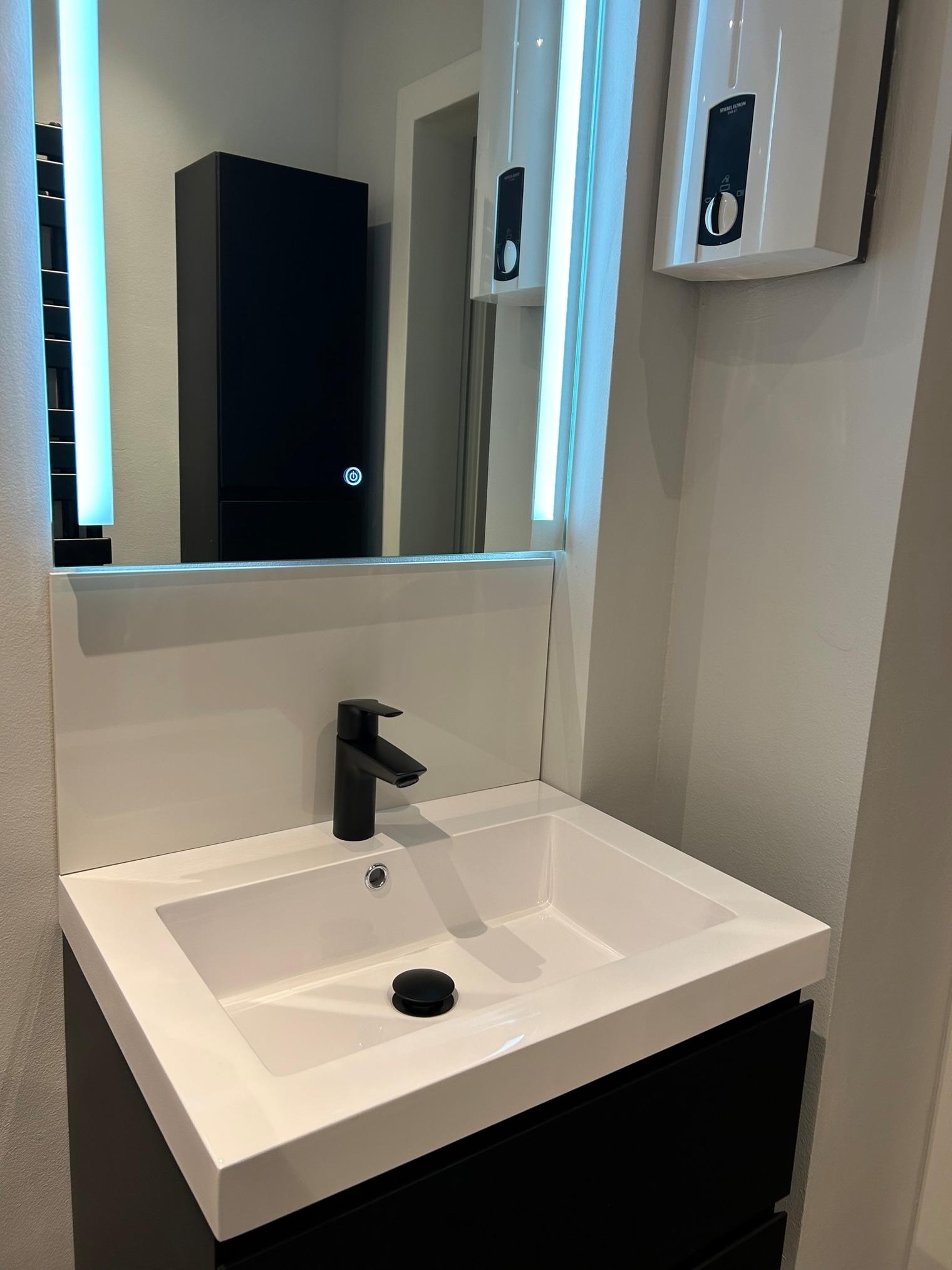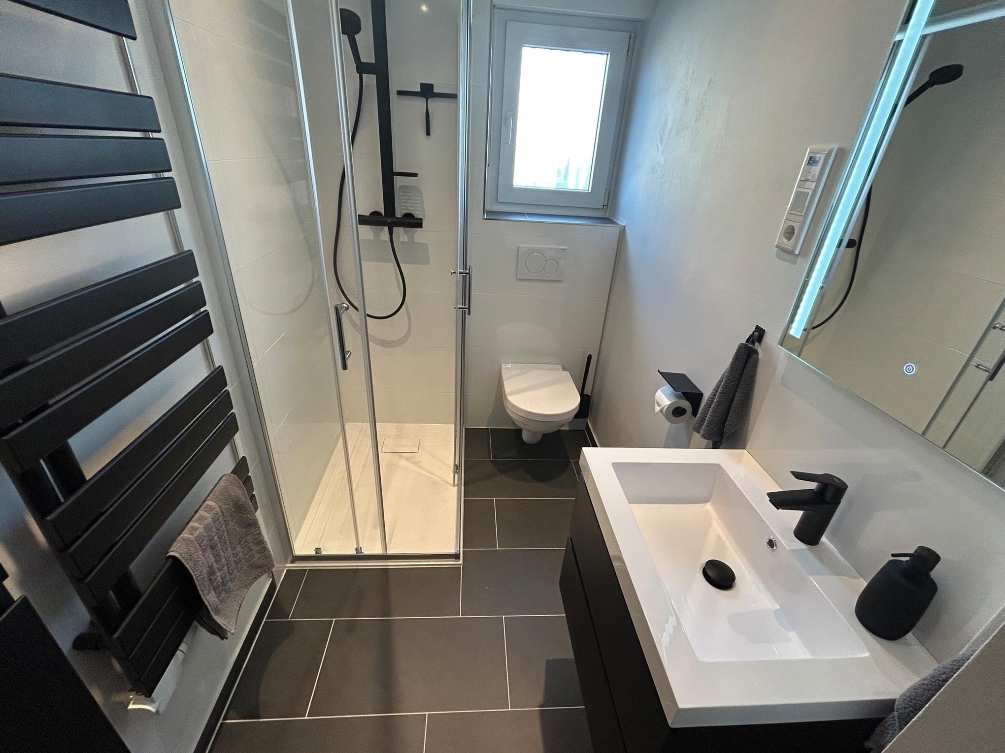 Das stilvolle Duschbad wurde erst 2025 umfassend modernisiert und bietet neben einer Dusche auch einen Waschtisch, eine Toilette sowie einen Föhn; perfekt für einen erfrischenden Start in den Tag.