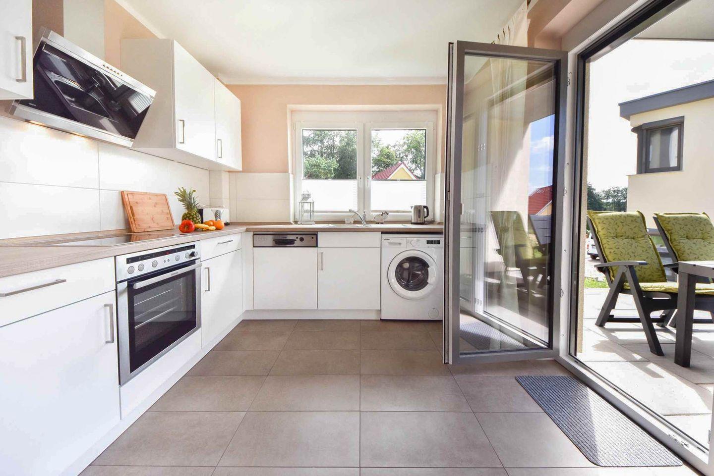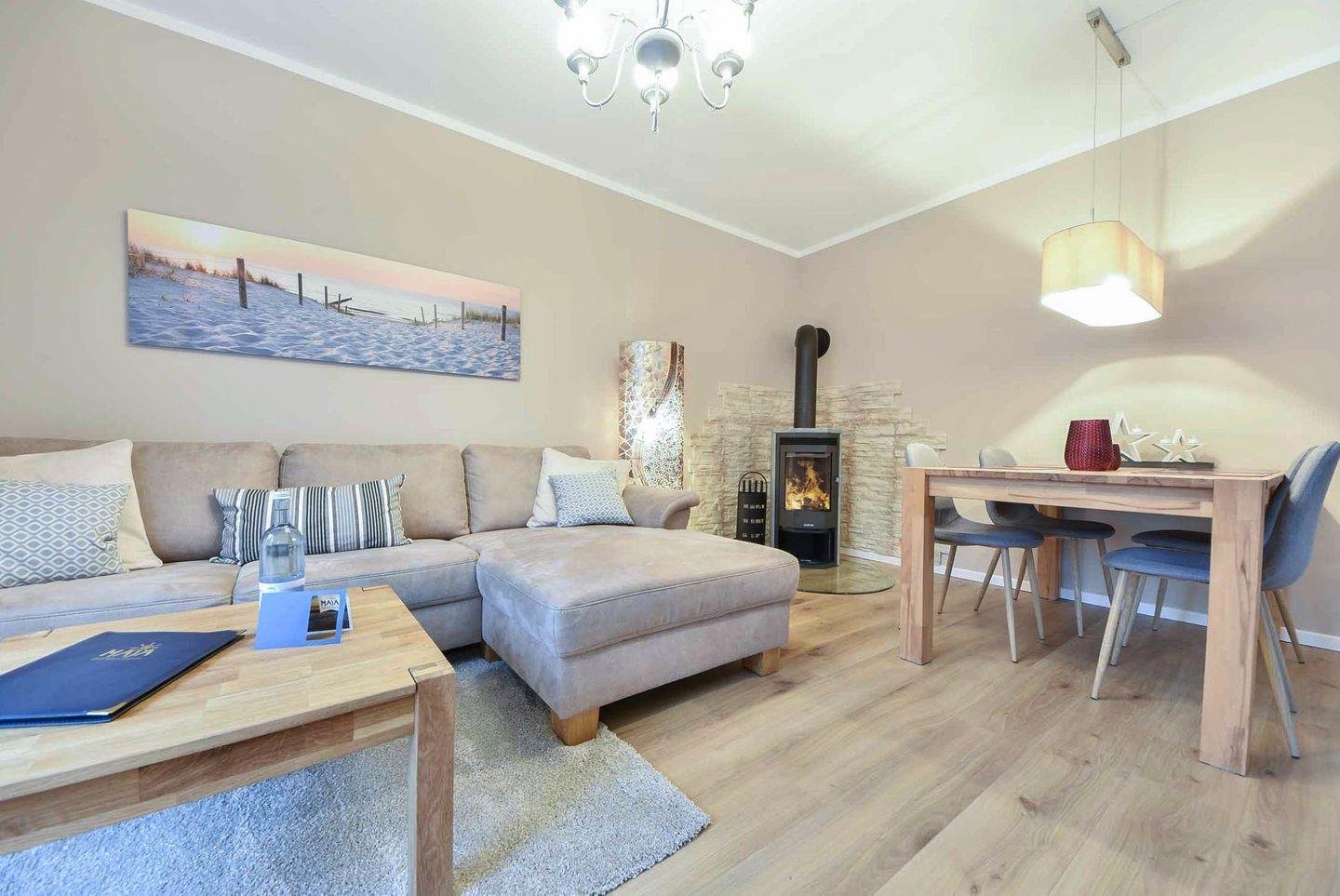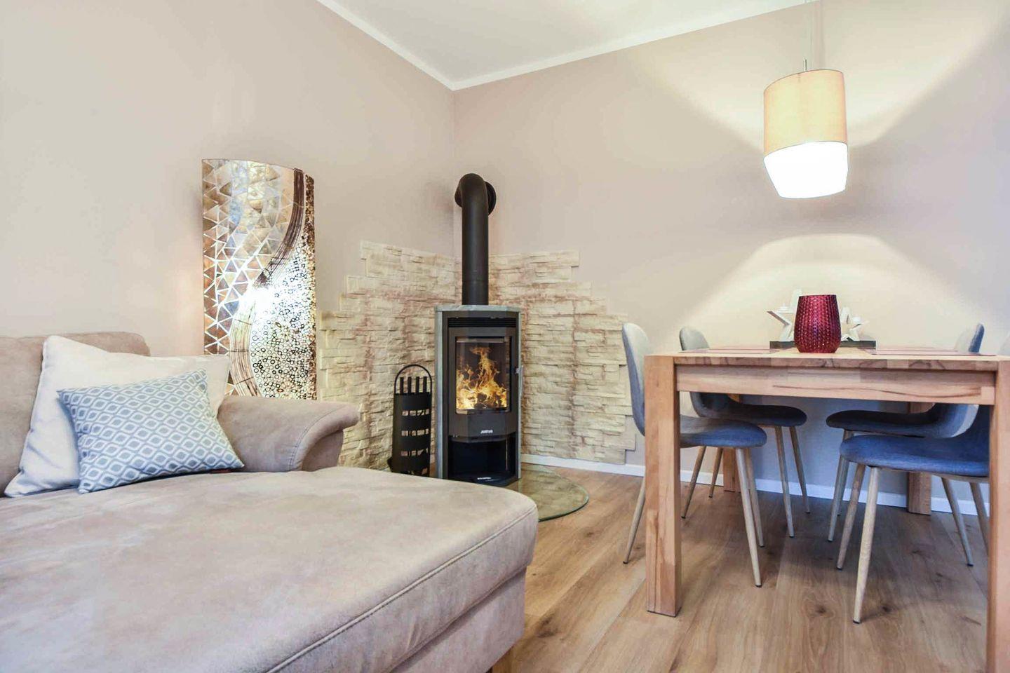 Gemütliche Ferienwohnung im Sonnenpark Korswandt mit Terrasse, Kamin und moderner Ausstattung für Familien.