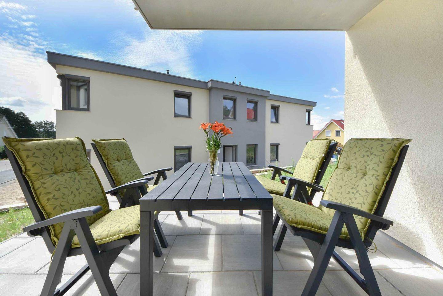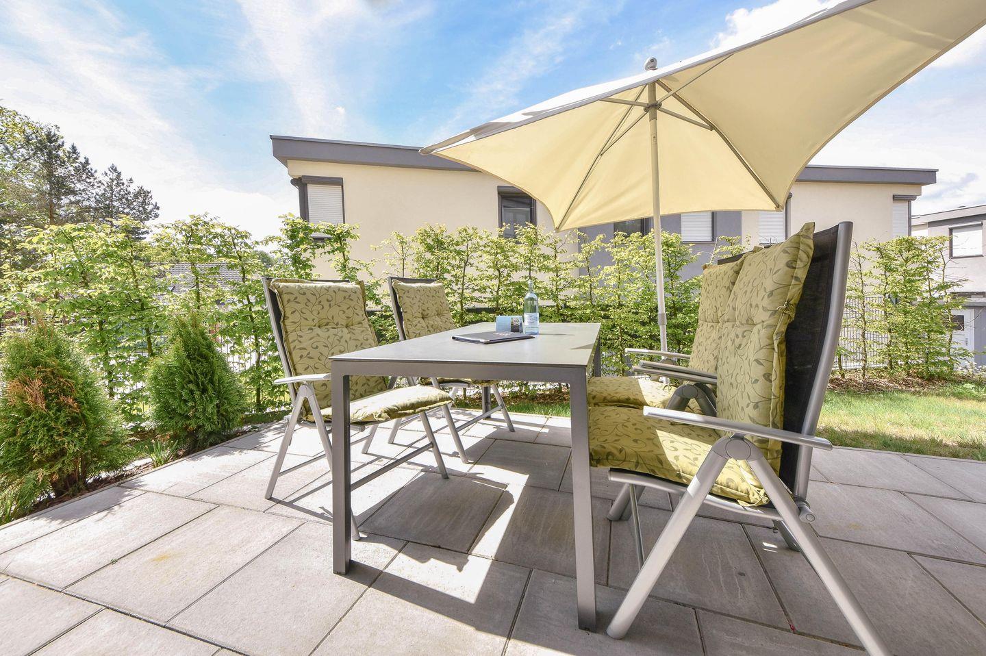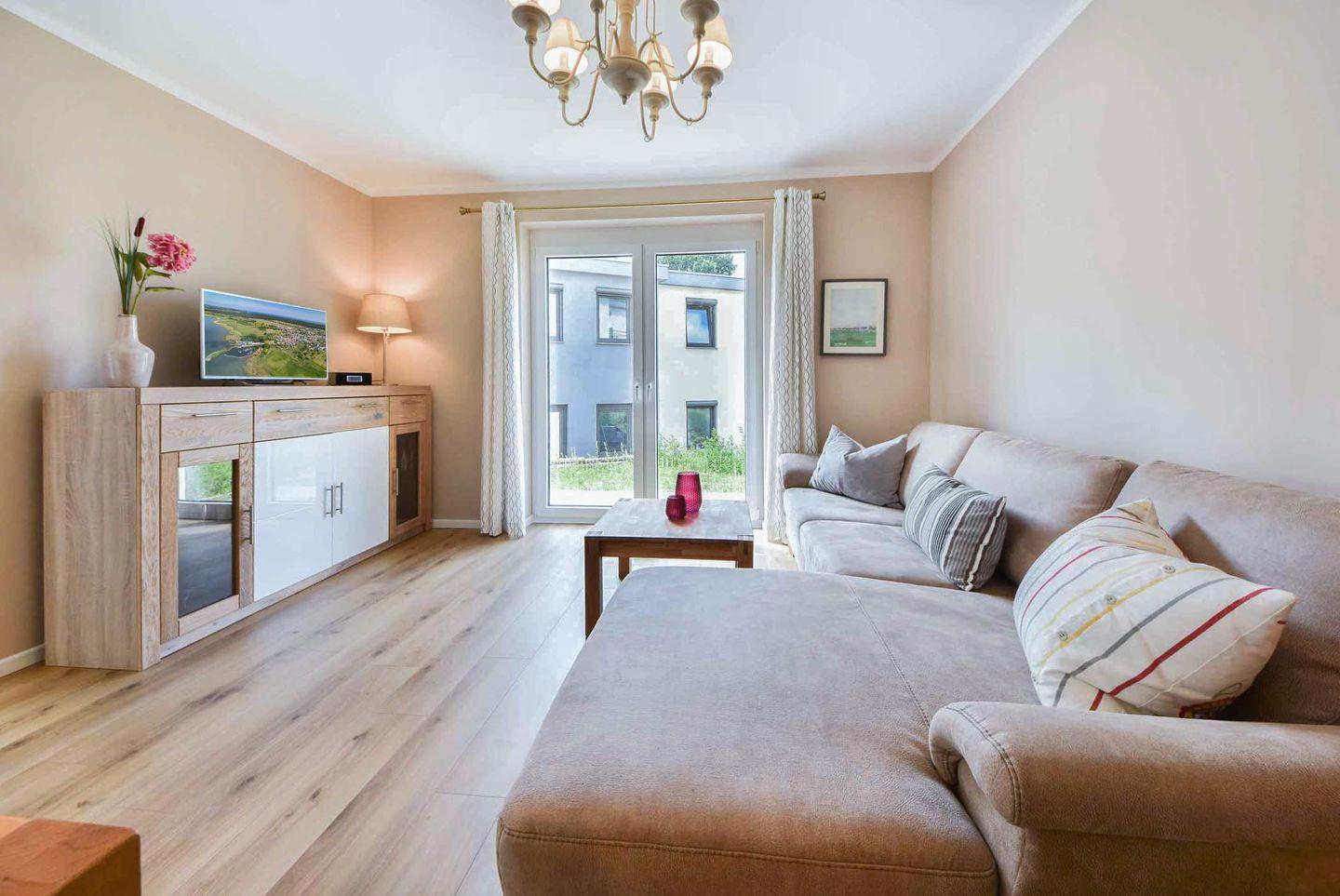 Gemütliche Ferienwohnung im Sonnenpark Korswandt mit Terrasse, Kamin und moderner Ausstattung für Familien.