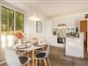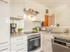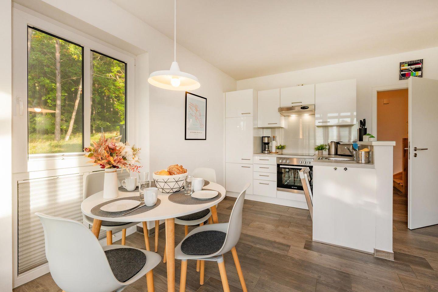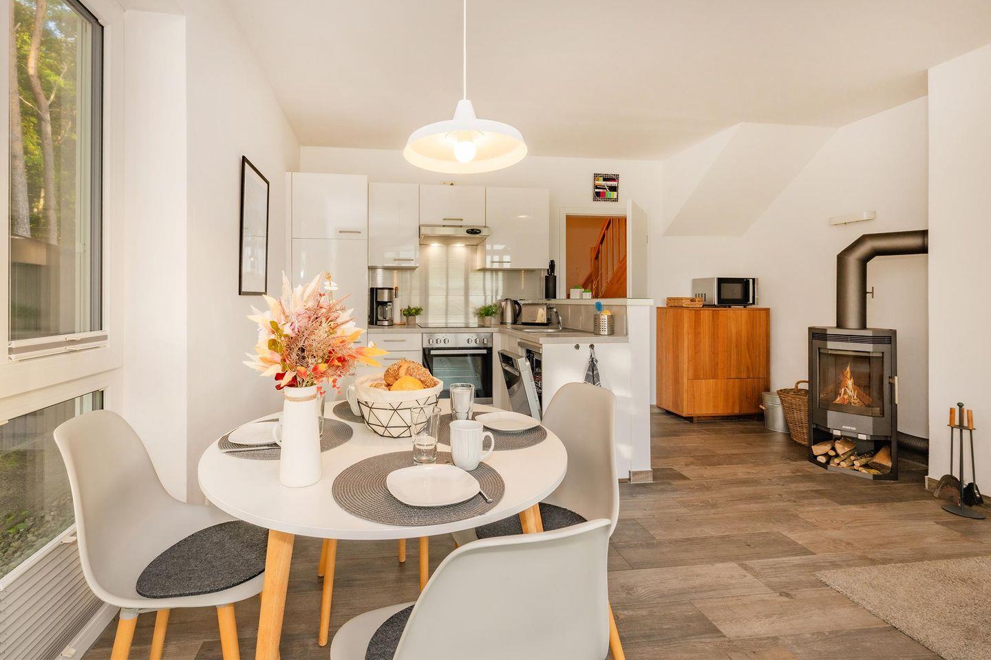 Im offenen Wohnbereich erwartet Sie eine moderne, voll ausgestattete Küche mit Backofen, Ceranfeld, Mikrowelle, Geschirrspüler und allen wichtigen Küchenutensilien. Hier lassen sich kulinarische Lieblingsgerichte mühelos zubereiten, während der angrenzende Esstisch zum gemeinsamen Frühstück oder zu geselligen Mahlzeiten einlädt. Der Wohnraum ist geschmackvoll eingerichtet und mit einem Flat-TV ausgestattet, über den Sie dank Ihres eigenen Amazon-Prime- oder Netflix-Accounts Ihre Lieblingsserien genießen können. Dezente Dekorationen, natürliche Materialien und hochwertige Möbel verleihen dem Raum eine warme, wohnliche Atmosphäre. Ein besonderes Highlight ist der Kamin, der an kühleren Tagen für wohlige Wärme und ein behagliches Ambiente sorgt – ideal für gemütliche Abende bei einem Glas Wein oder einem guten Buch.