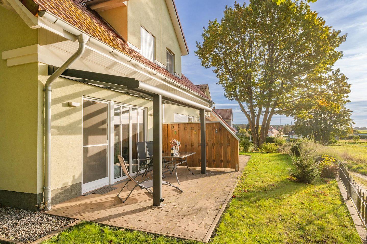 Vom Wohnzimmer aus gelangen Sie auf die überdachte Südwest-Terrasse, die mit bequemer Bestuhlung zum Entspannen und Verweilen einlädt. Umgeben von duftendem Wald und frischer Ostseeluft können Sie hier die Sonne genießen oder den Tag in Ruhe ausklingen lassen.