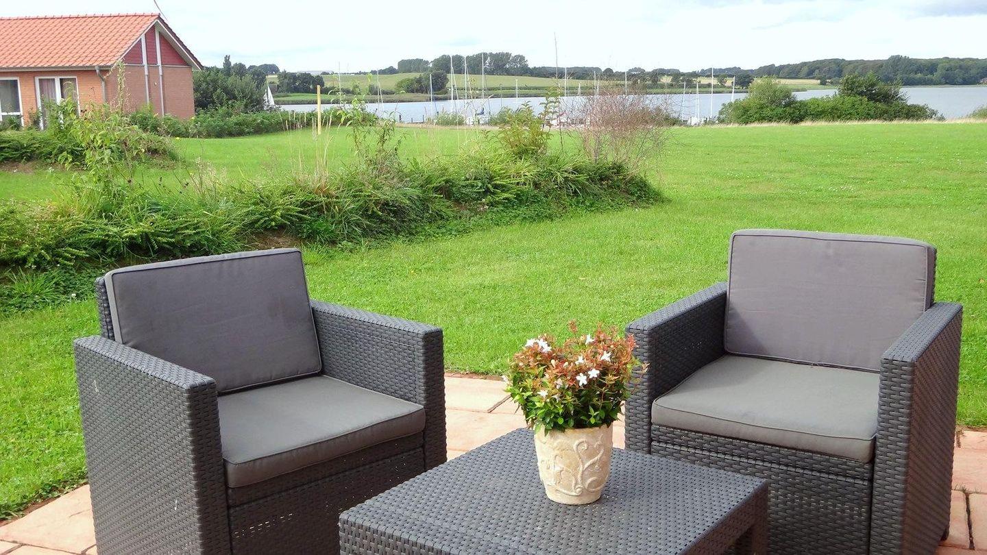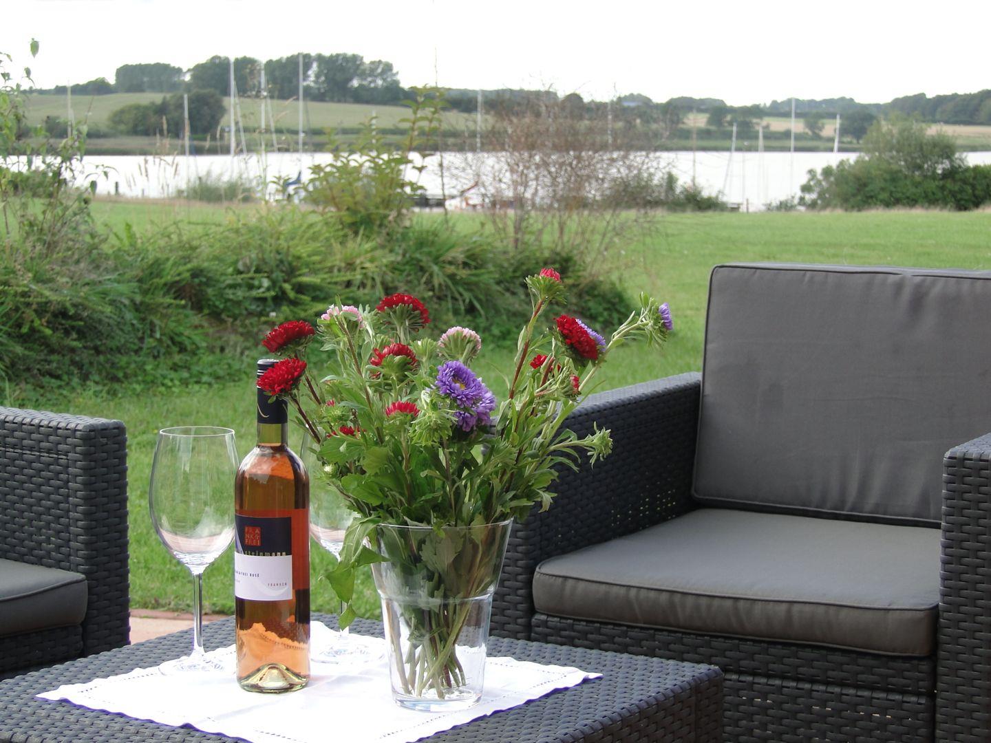 Der Außenbereich besteht aus zwei großen Terrassen, beide mit Schleiblick und diversen Sitzmöbeln. Sonnenliegen, Sonnenschirm, Außenspielzeug, Grill, sowie ein abschließbarer Schuppen für Fahrräder oder Sportgeräte stehen ebenfalls zur freien Verfügung.