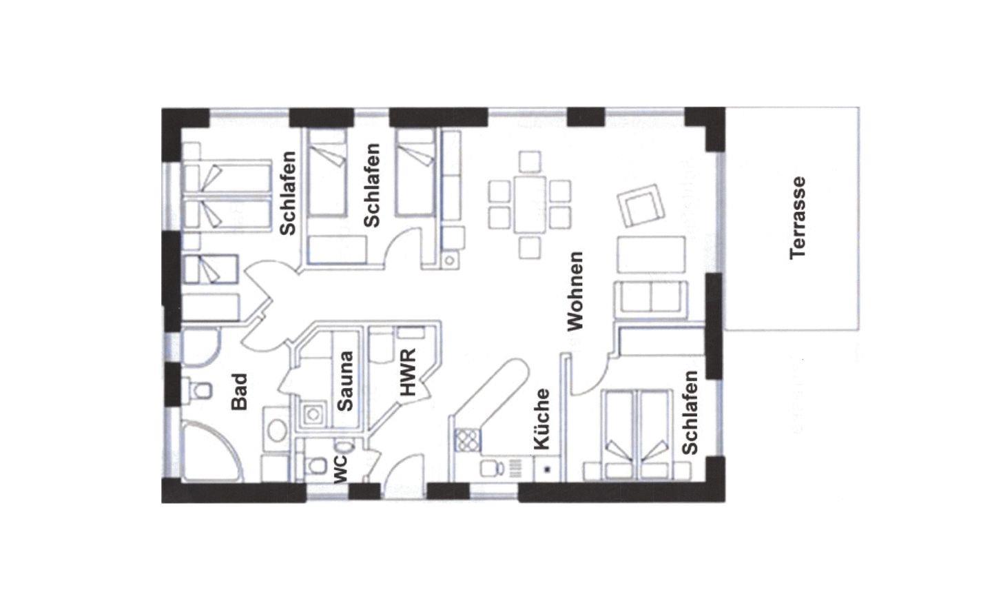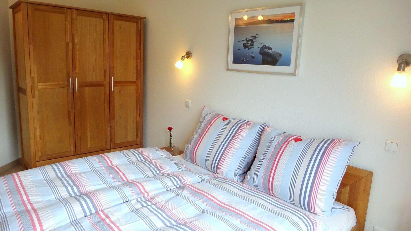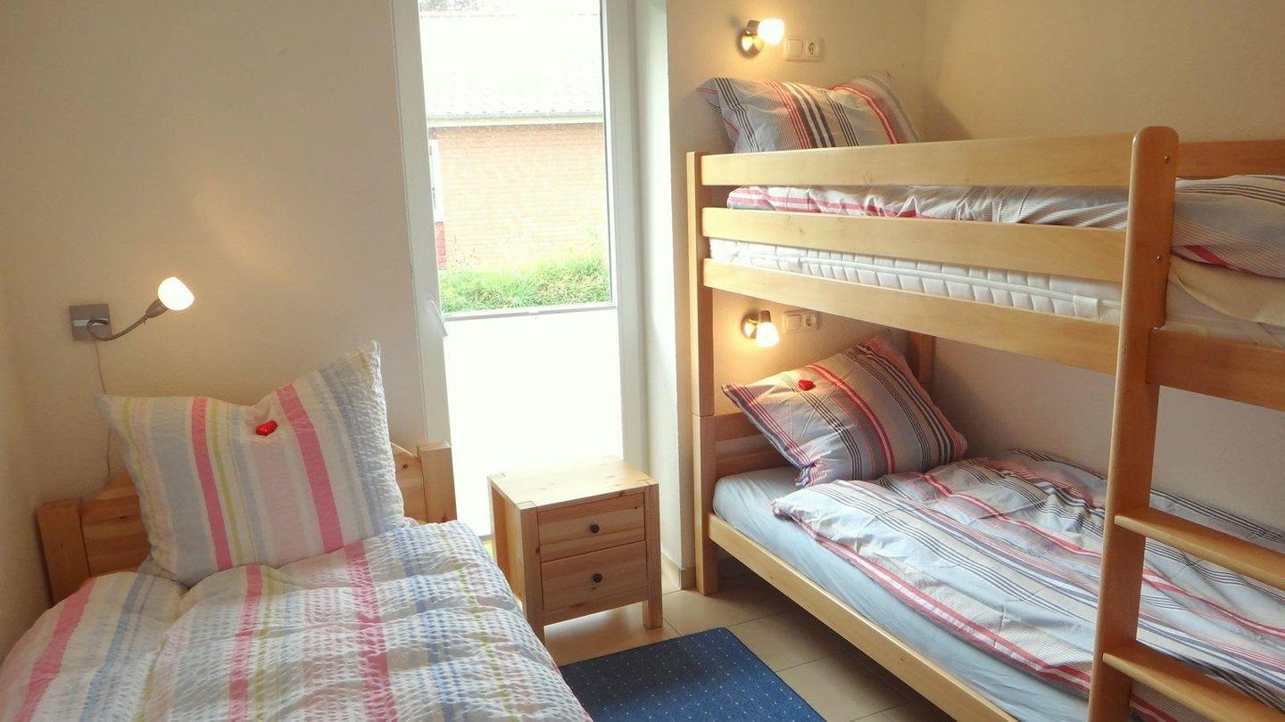 Maximal 7 Personen finden im Ferienhaus Ankerplatz in 3 Schlafzimmern Platz. Zwei davon sind mit Doppelbetten, eines mit einem Etagenbett und Einzelbett ausgestattet.