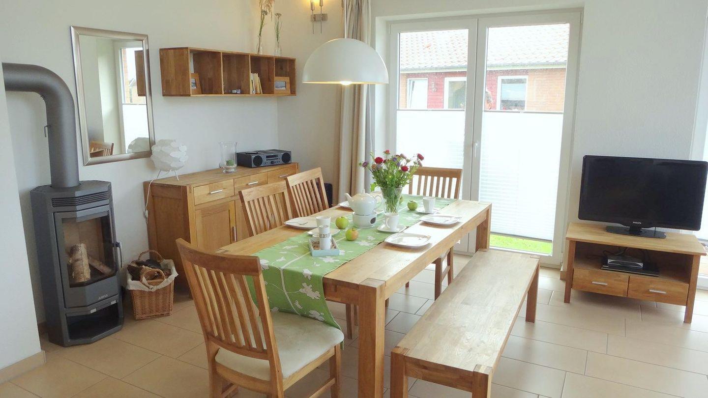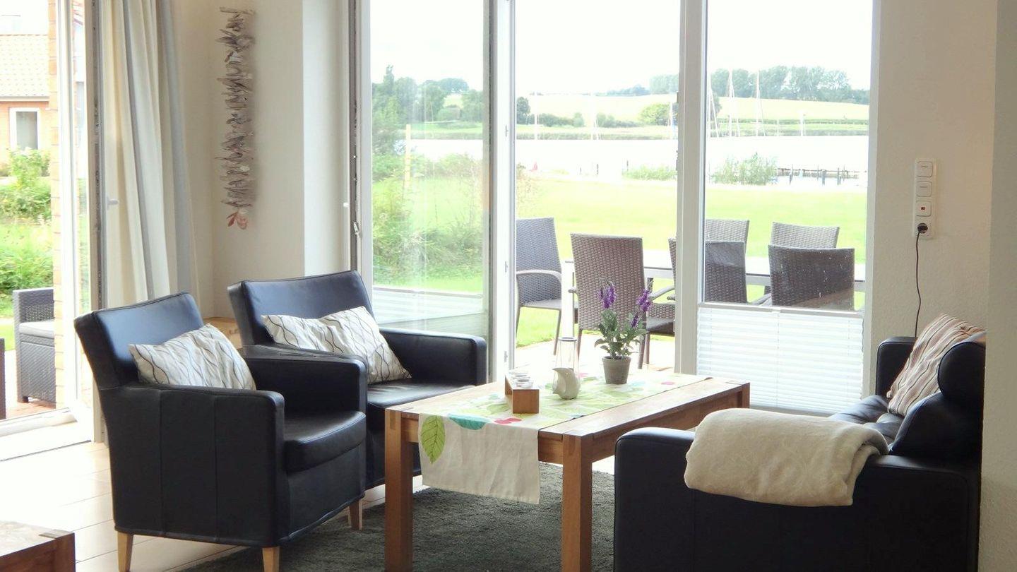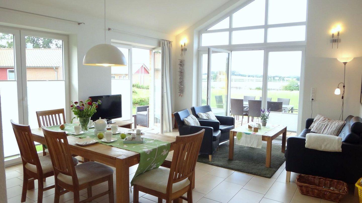 Das Haus verfügt über ein großes, helles Wohnzimmer mit Panoramagiebel zur Schlei, angrenzendem Essbereich und offener Wohnküche. Der Wohnbereich ist mit einem Kaminofen, Leder-Sitzecke, Flachbild-TV, Blue-Ray DVD Player (spielt auch herkömmliche DVDs ab), Musikanlage mit I-Pod-Docking Station und kostenfreiem WLAN ausgestattet.