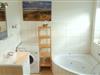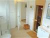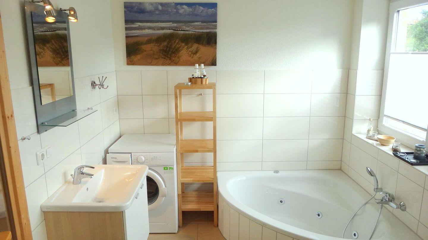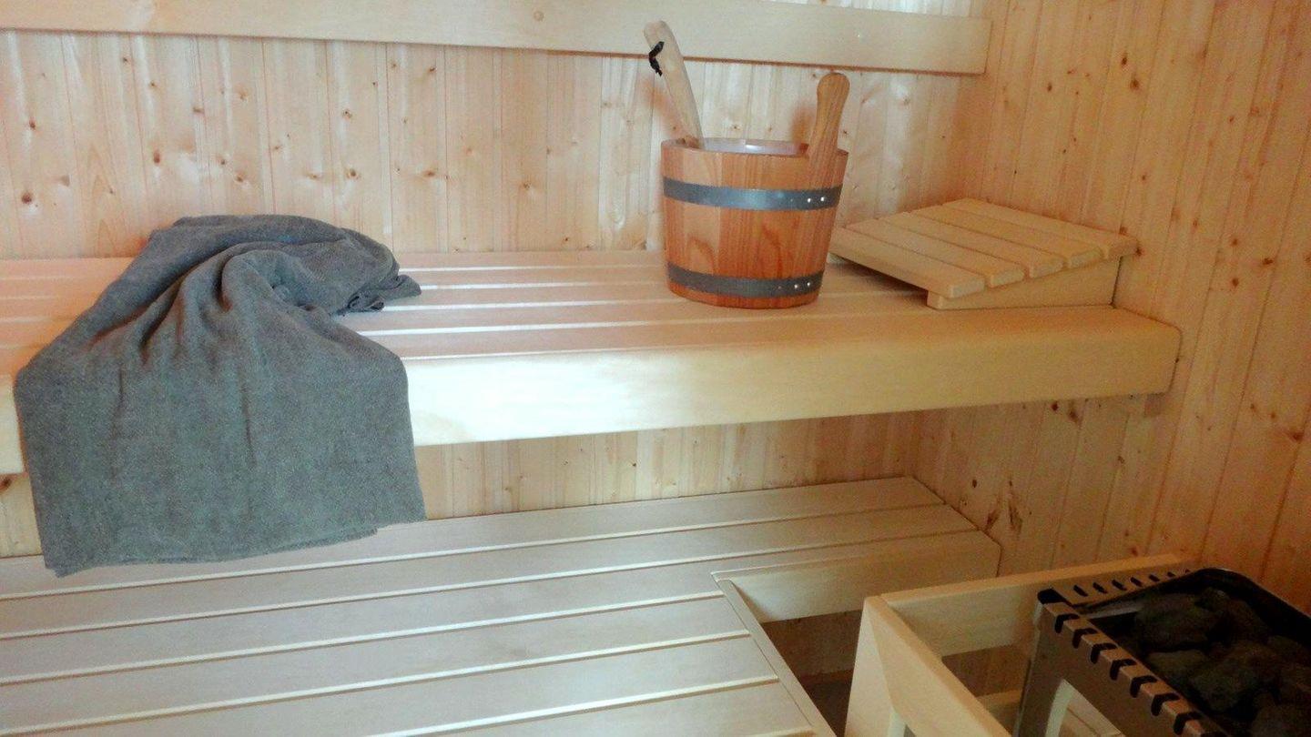 Das große Badezimmer verfügt über Dusche/WC und eine große einladende Eckbadewanne mit Whirlpoolfunktion. Vom Bad gelangt man auch in die Sauna, wo 3 Personen gleichzeitig komfortabel Platz finden.