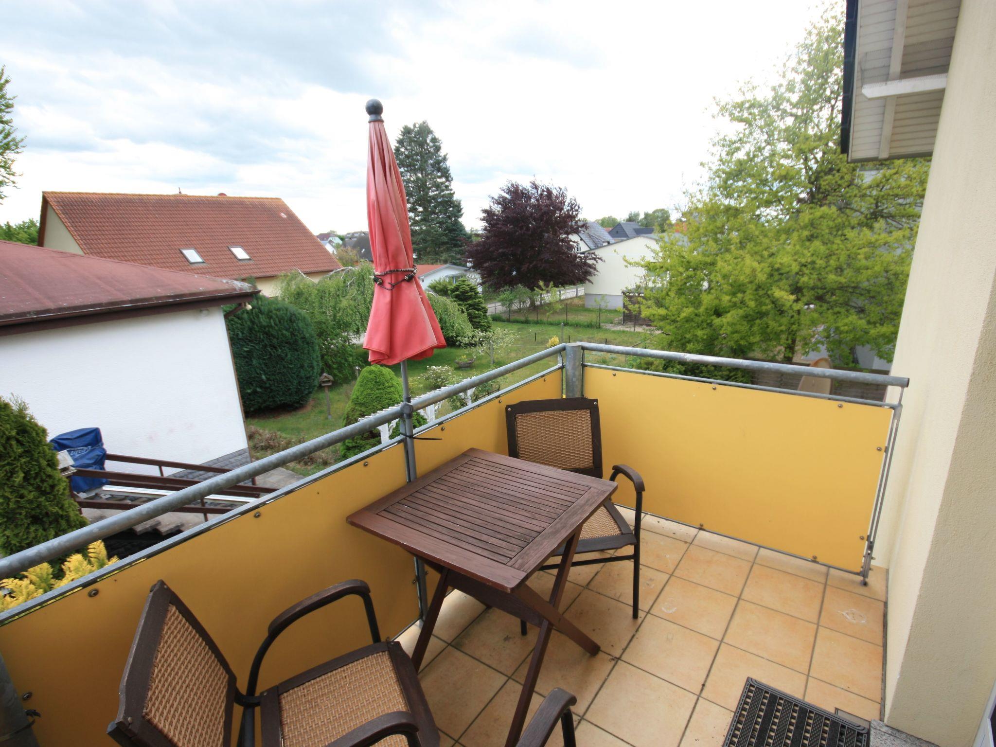 1 Süd-Balkon mit Blick über Koserow auf das Achterwasser, Holztisch, 2 Stühlen und Markise
