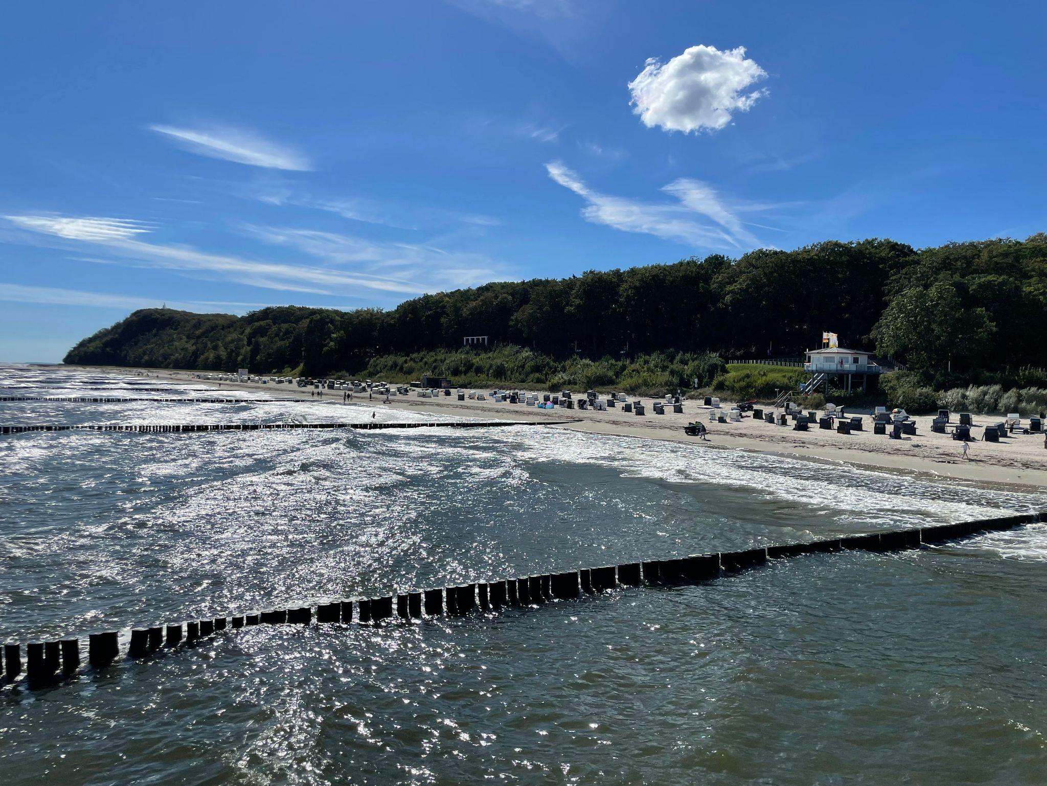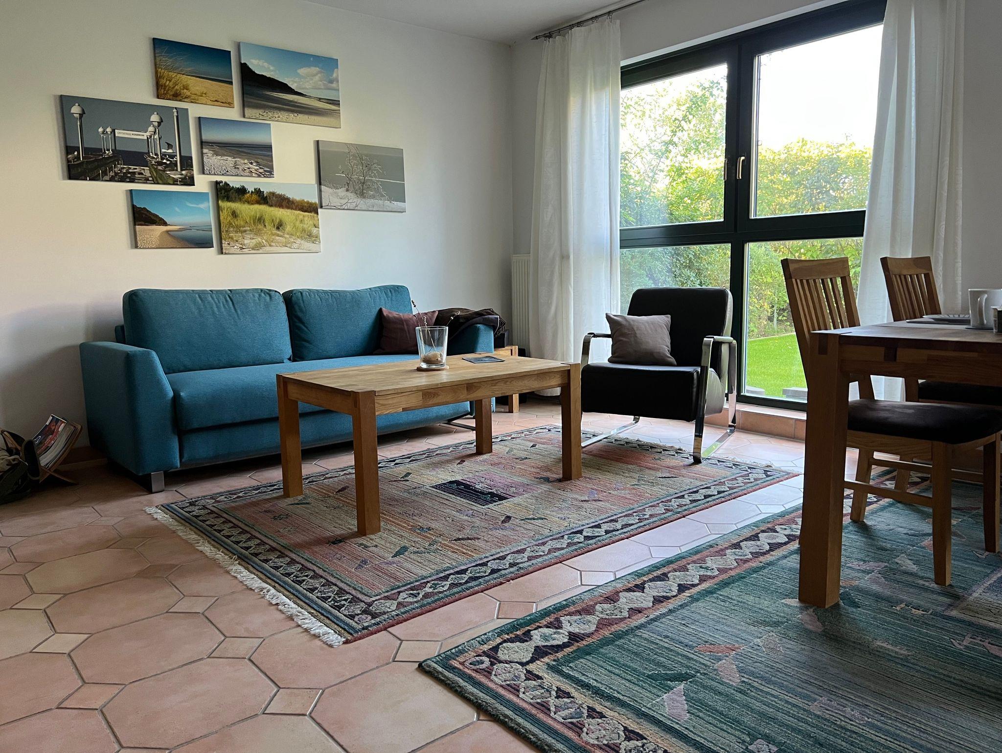 Moderne Ferienwohnung mit Terrasse und Strandkorb nahe Kurplatz in Koserow, ideal für Familien und Radfahrer.