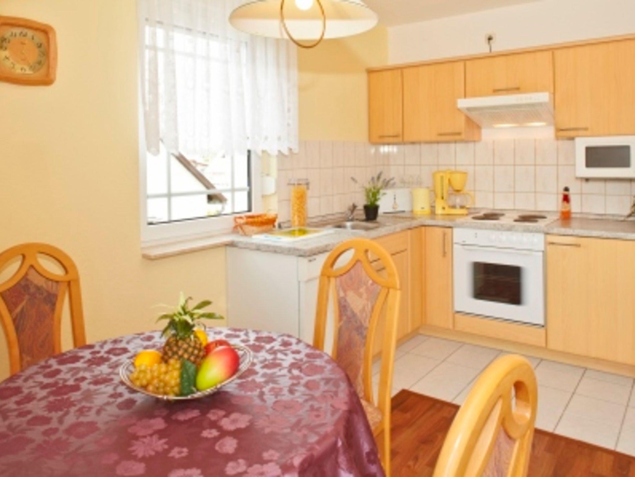 Die Ferienwohnung im 1. OG für drei Personen (Kinder erst ab 6 Jahre) mit hochwertiger Ausstattung hat eine Grundfläche von 70 m². Sie besteht aus einem Wohnraum mit integrierter kompletter Küchenzeile, Essecke und Sitzecke, einem Schlafzimmer, sowie Dusche und WC.
